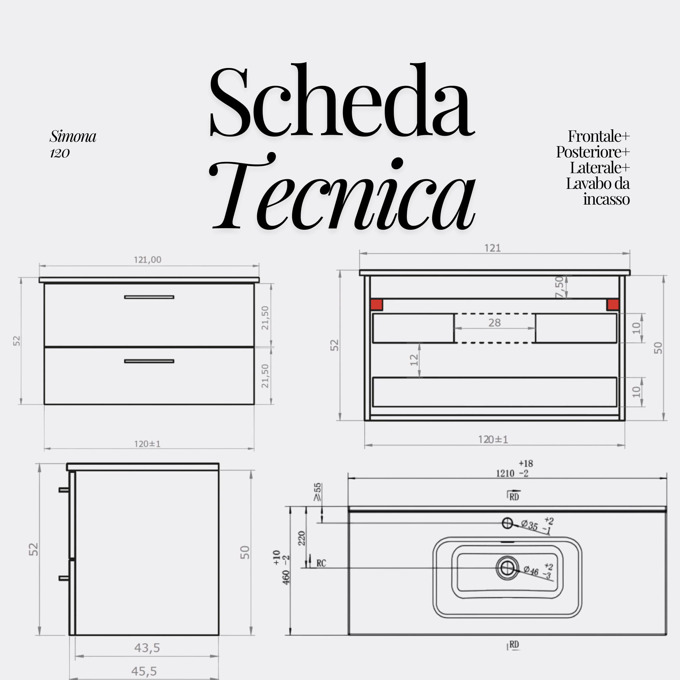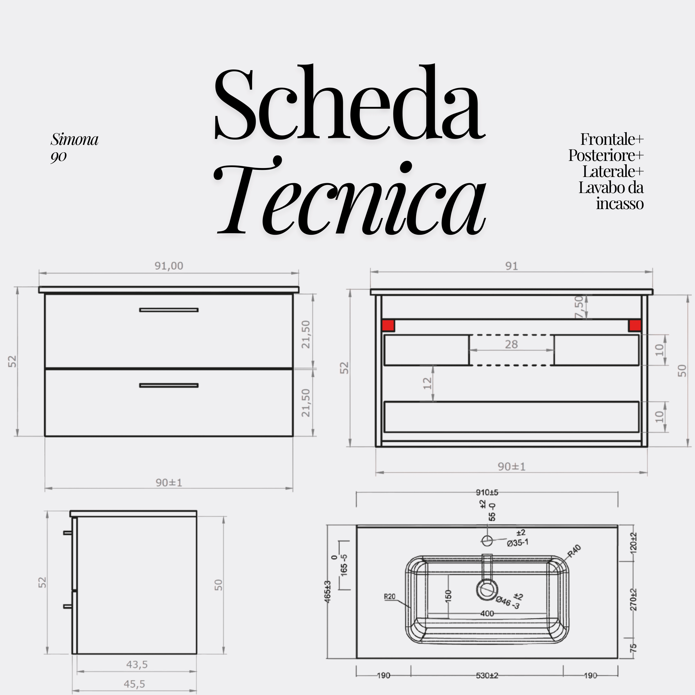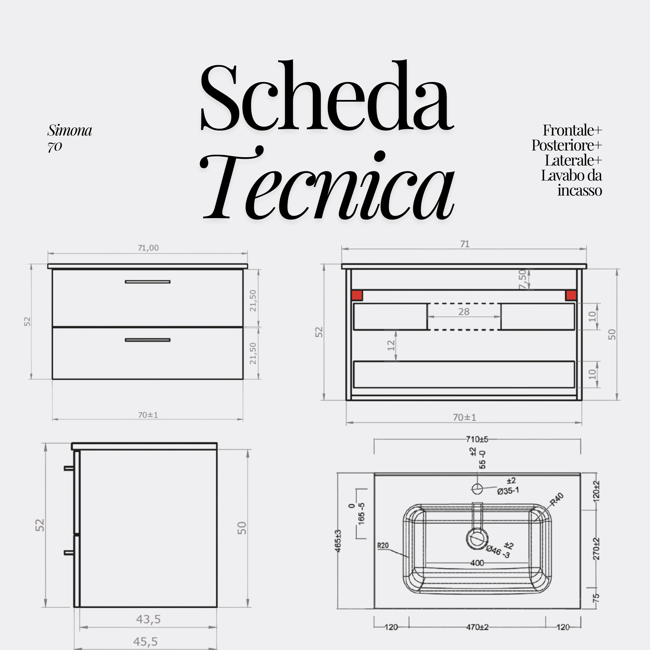 - Misure lavabo: L 61/71/81/91/101/121 x H 2 x P 46 (cm)