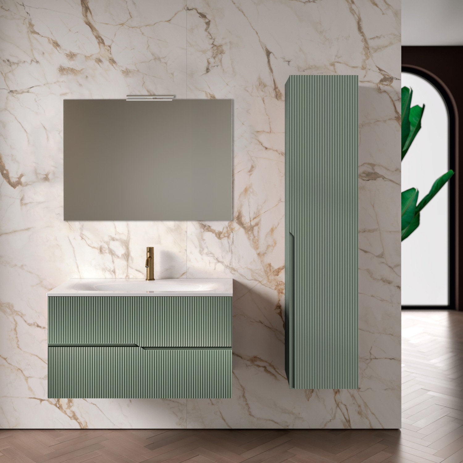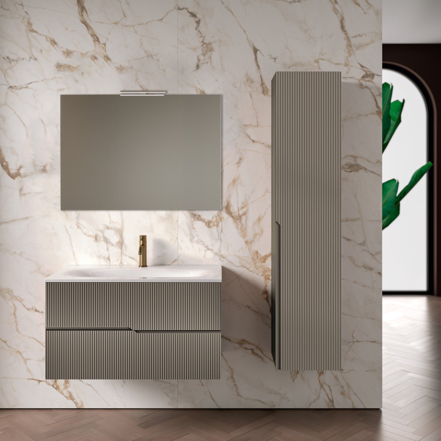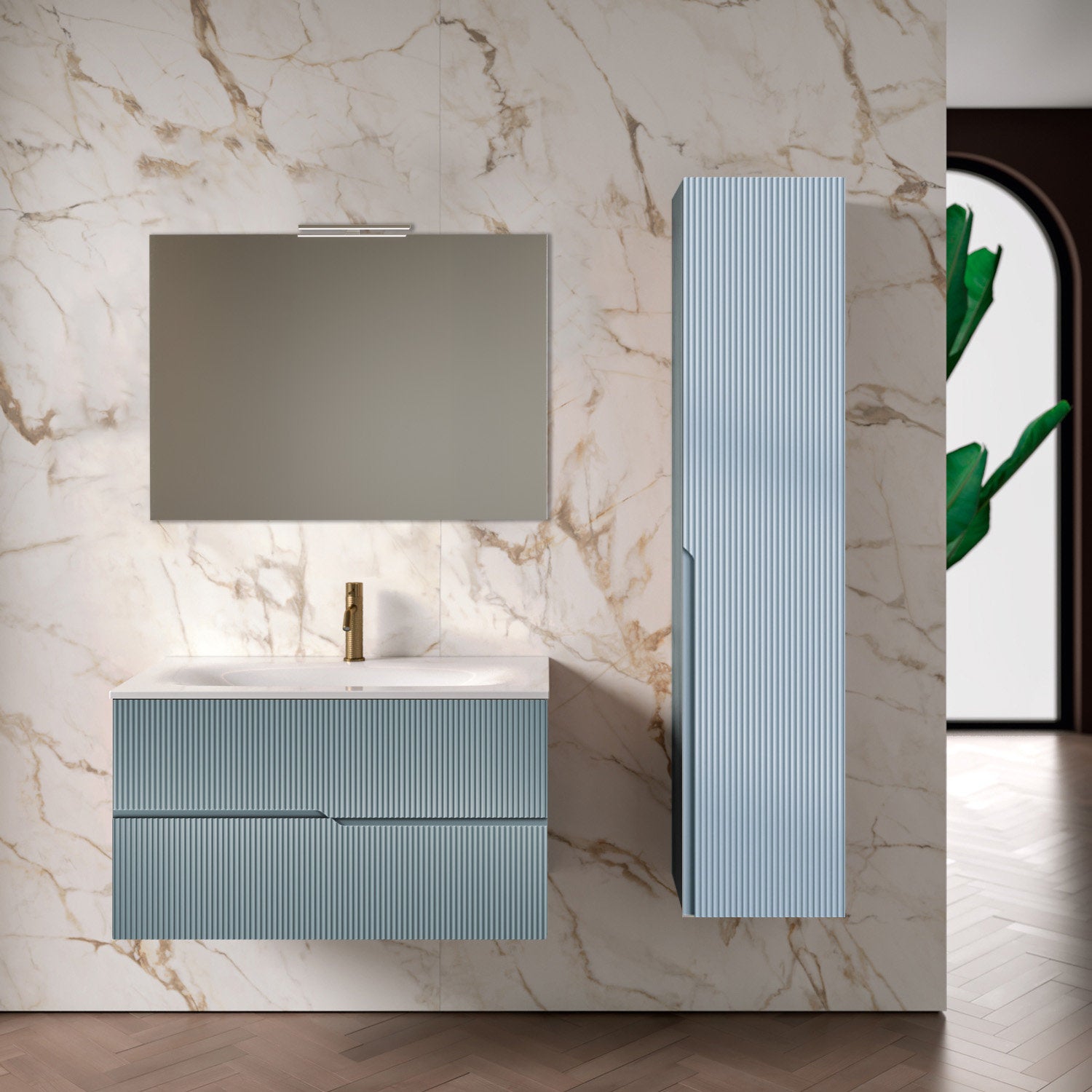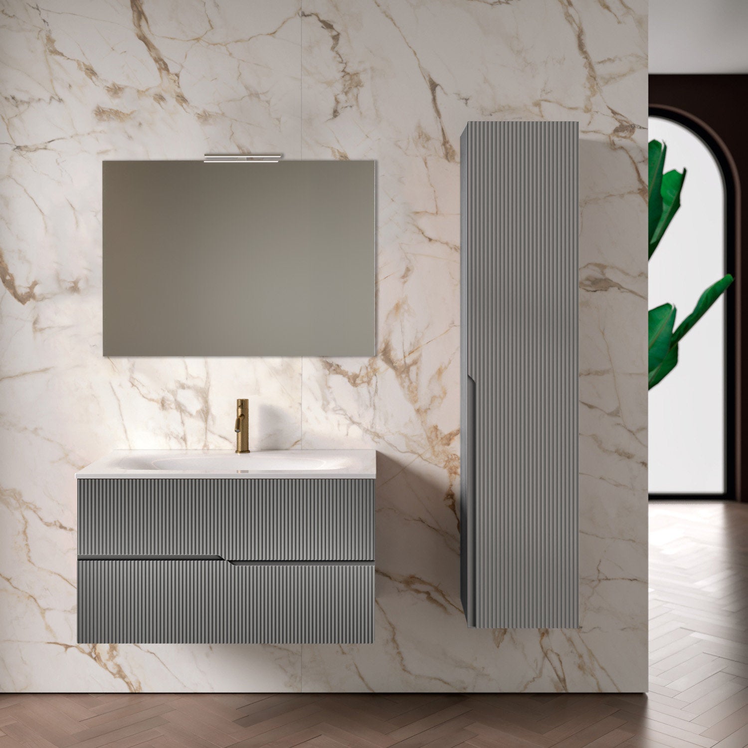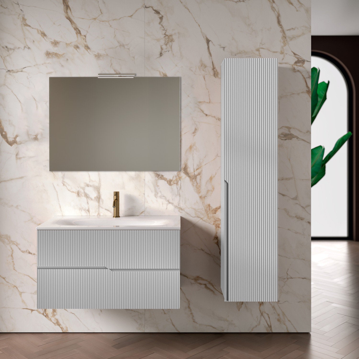 Il mobile bagno presente in foto ha uno stile particolare, il suo design contiene un effetto cannettato che dona alla composizione eleganza e lussuosità. La composizione bagno proposta in foto è composta da una base con due cassetti da 100 cm, un lavabo ad incasso realizzato in ceramica finitura bianco lucido a completare la composizione troviamo uno specchio filo lucido reversibile con lampada led.