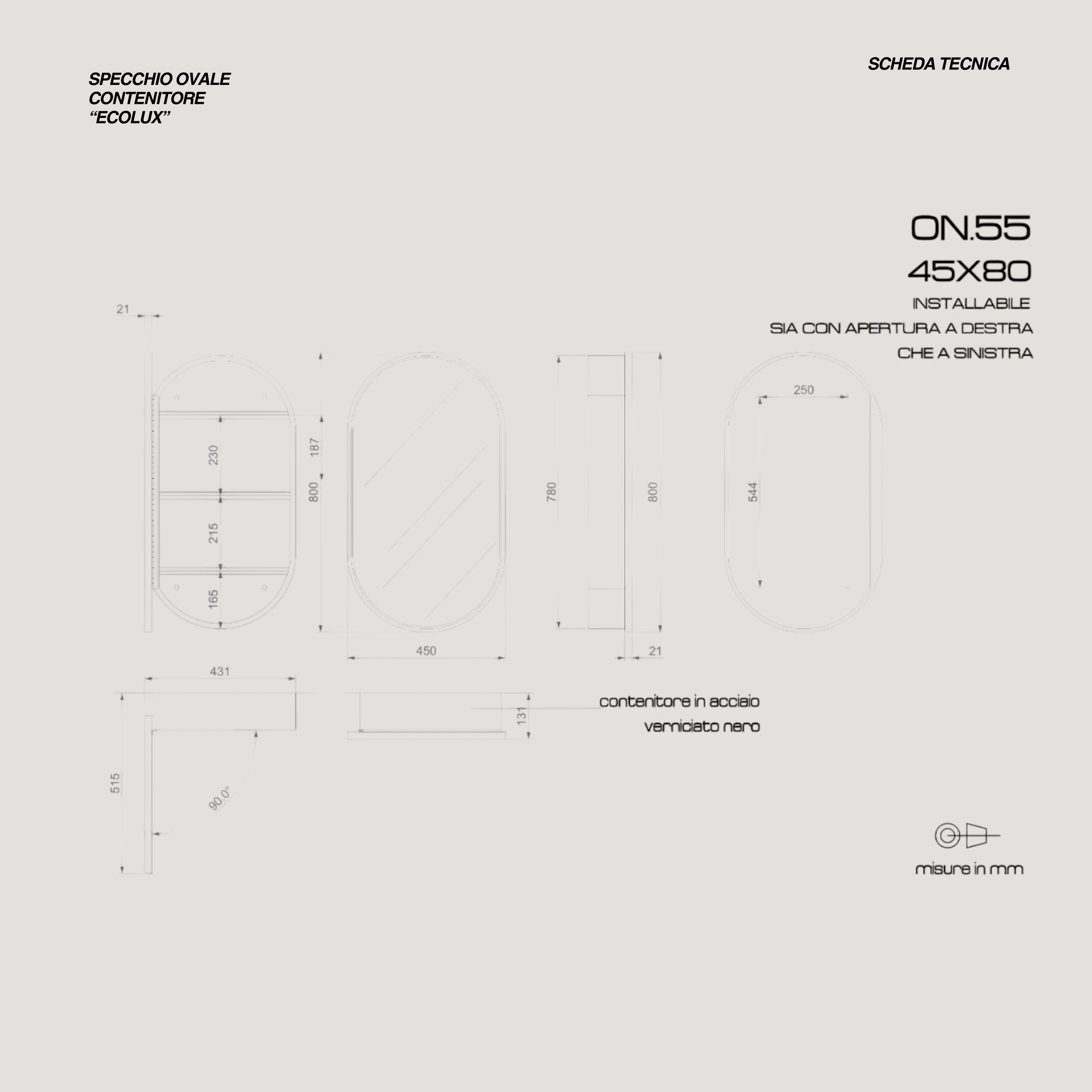 Specchio Ovale Contenitivo 45x80 Reversibile Con Apertura a 90° "Ecolux" Nero