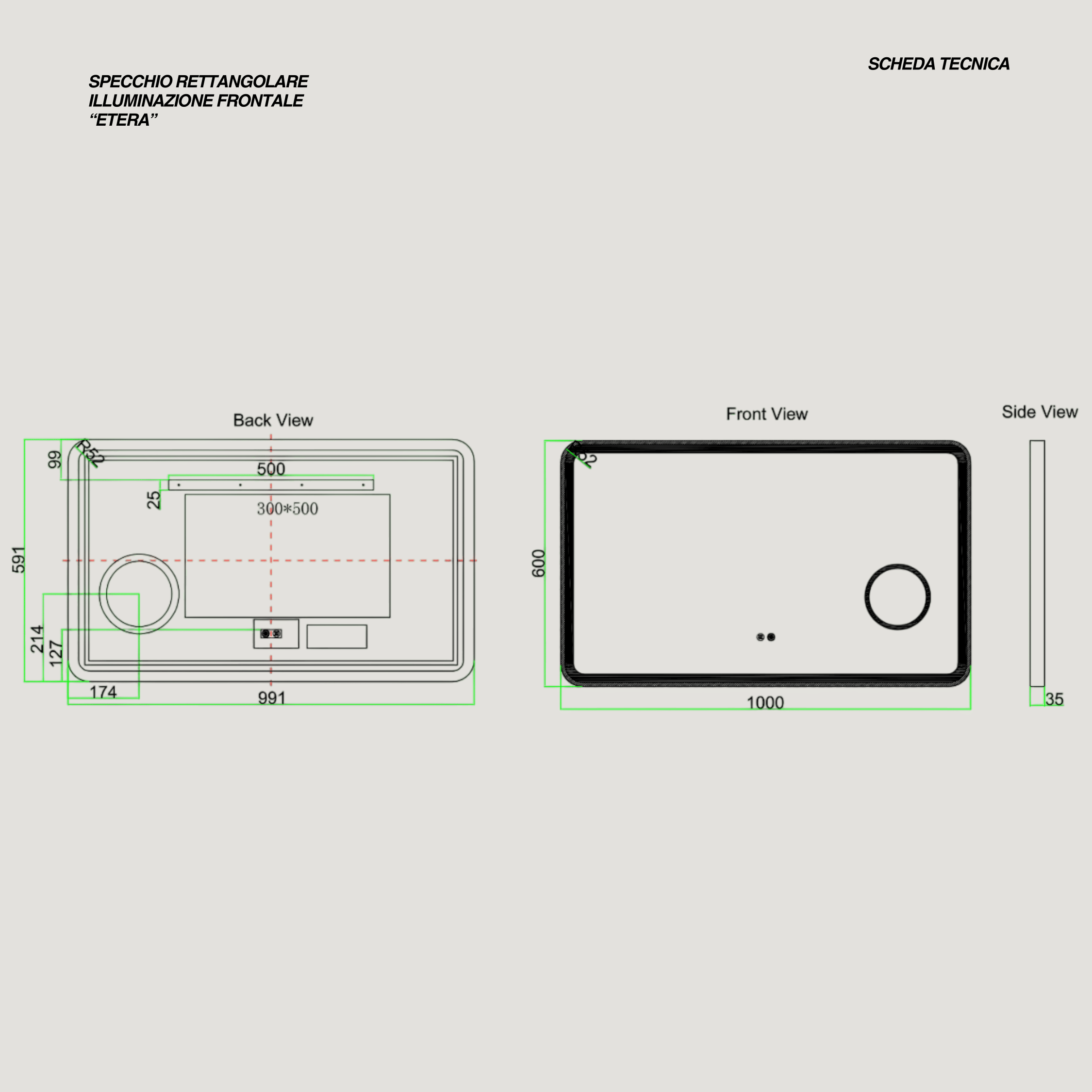 Specchio Rettangolare Illuminazione Frontale 100x60 Con Touch Accensione e Tasto Antifog "Etera" Nero Opaco