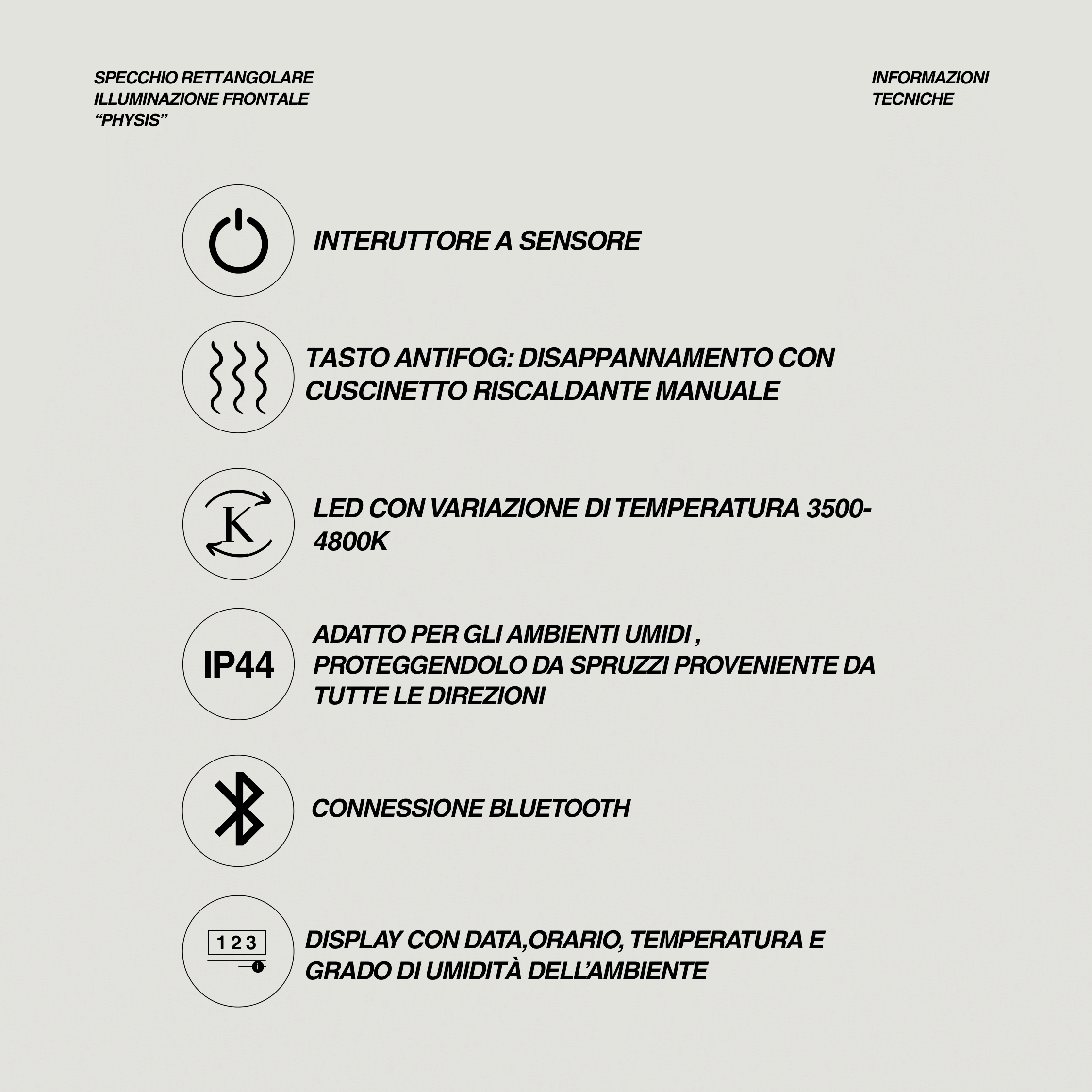 Specchio Rettangolare Illuminazione Frontale 100x75 Con Touch Accensione Display Con Orario e Connessione Bluetooth "Physis"