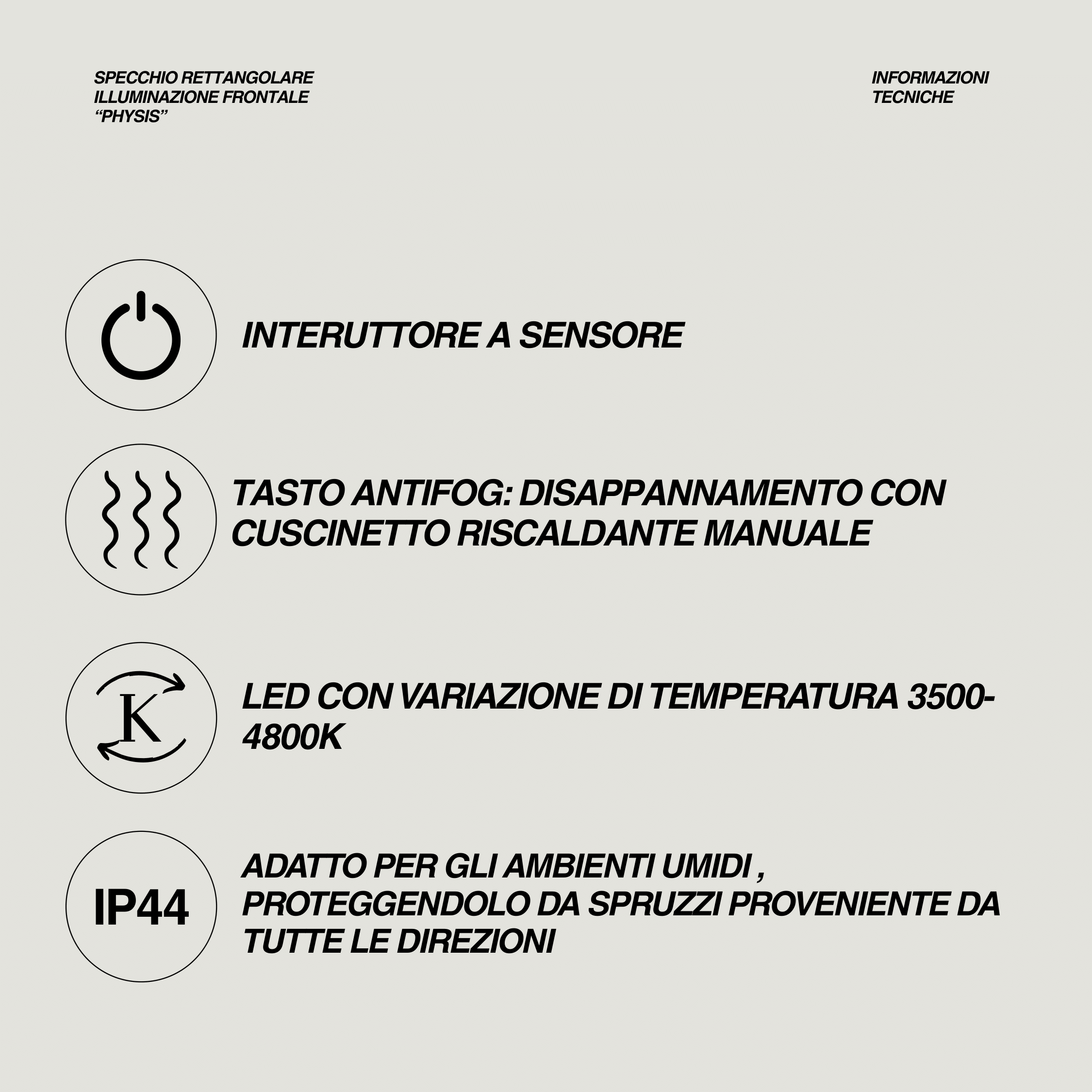 Specchio Rettangolare Illuminazione Frontale 50x90 Con Touch Accensione e Tasto Antifog "Physis" Nero
