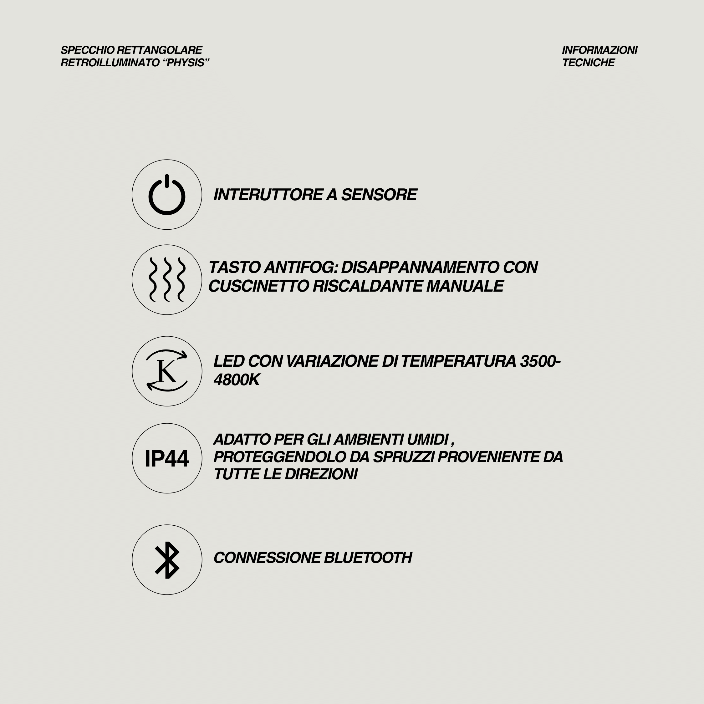 Specchio Rettangolare Retroilluminato 80x60 Con Touch Accensione Bluetooth e Tasto Antifog "Physis"