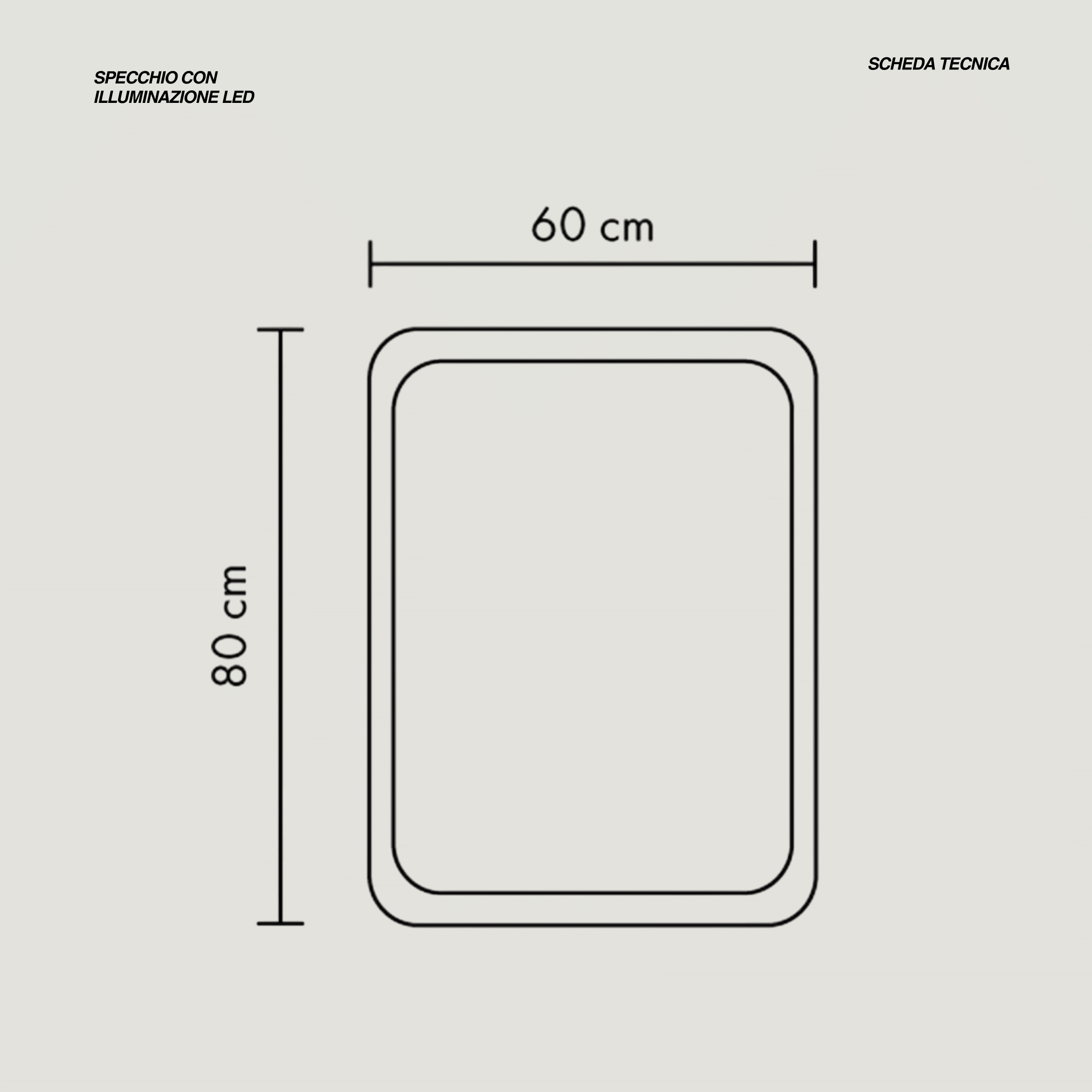 Specchio rettangolare con cornice luminosa frontale, progettata per proiettare la luce direttamente sul viso e garantire una visibilità ottimale durante le attività quotidiane. Il trasformatore per il collegamento alla rete elettrica è incluso, per un’installazione semplice e immediata. Grazie al montaggio reversibile, lo specchio può essere installato sia in verticale che in orizzontale, mantenendo sempre la qualità del fascio luminoso. Dimensioni compatte 60×80 cm, ideale per ambienti bagno moderni che richiedono funzionalità e design in perfetto equilibrio. Lo specchio ha una protezione IP44, che lo rende adatta all'uso in ambiente umido come il bagno o ambiente esterno ma coperto, proteggendolo da spruzzi d'acqua proveniente da tutte le direzioni, dotato di luce naturale 3500-4800K.