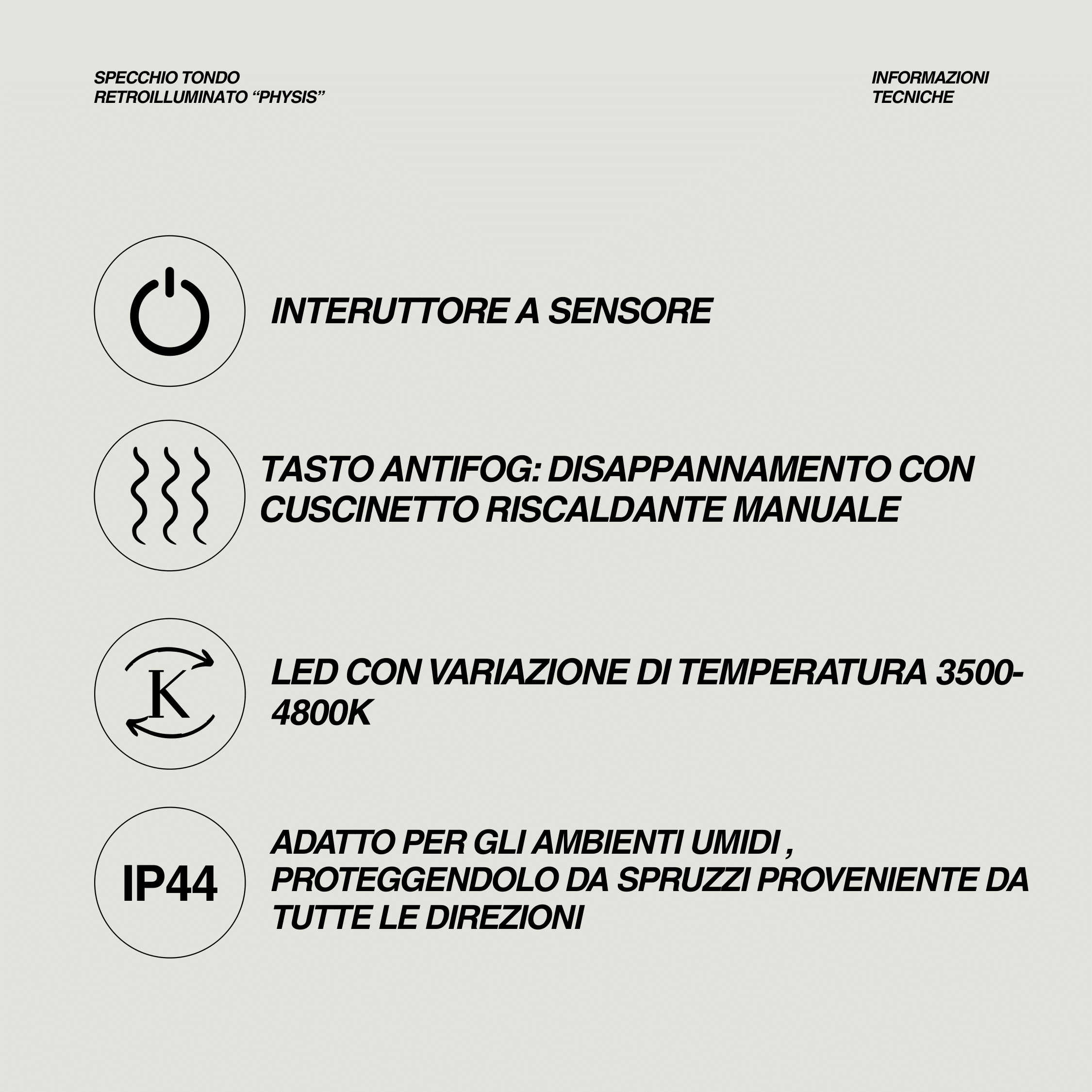 Specchio Tondo Diametro 80 Retroilluminato Con Touch Accensione e Tasto Antifog "Physis"
