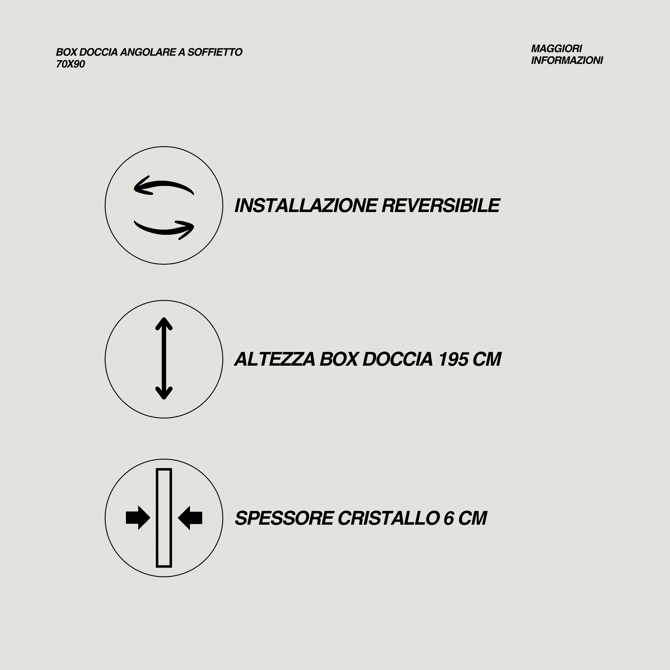 Il box doccia angolare con doppia porta a saloon si distingue per la sua eleganza e per la praticità delle aperture, progettate per funzionare sia verso l’interno che verso l’esterno, offrendo un utilizzo versatile e fluido. La struttura è impreziosita da profili in alluminio con finitura nero opaco, un dettaglio che conferisce al prodotto un carattere deciso e contemporaneo, perfettamente in linea con ambienti bagno dal gusto moderno e minimalista. Il vetro trasparente da 6 mm di spessore garantisce solidità e luminosità, creando un effetto di leggerezza e ampiezza visiva.La dimensione di 70x90 cm prevede un’estensibilità regolabile da 68 a 70 cm per la parete fissa e da 88 a 90 cm per la doppia porta a saloon, con una tolleranza di regolazione di 2 cm che facilita l’installazione e assicura una perfetta adattabilità. Le maniglie, realizzate anch’esse in alluminio nero opaco, completano il design con un dettaglio coerente e raffinato, mentre la chiusura magnetica garantisce sicurezza e praticità nell’utilizzo quotidiano.Questo box doccia non è soltanto un elemento funzionale, ma diventa parte integrante del design del bagno, trasformando lo spazio in un ambiente di comfort e stile, dove la cura dei dettagli e la qualità dei materiali si fondono in un equilibrio armonioso.