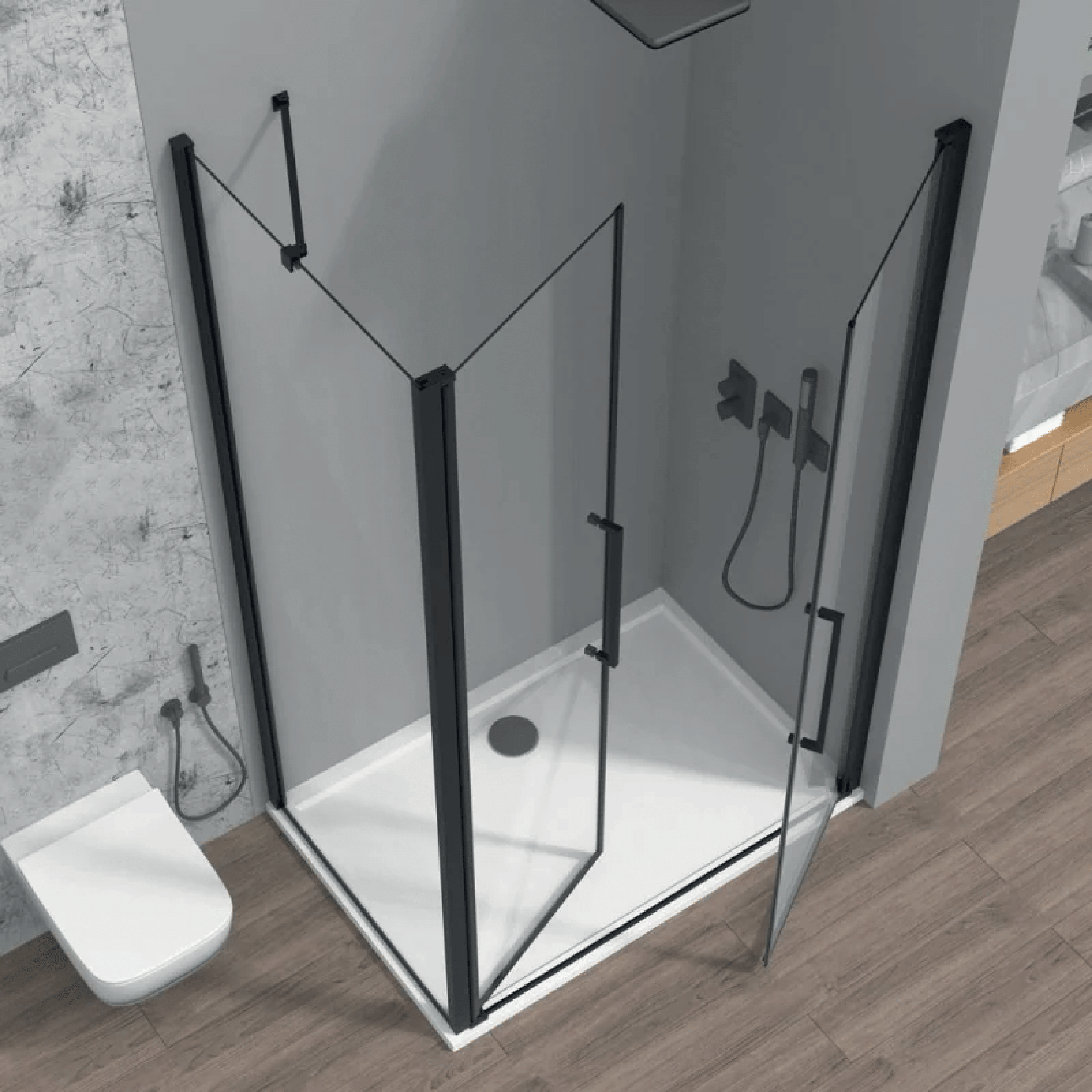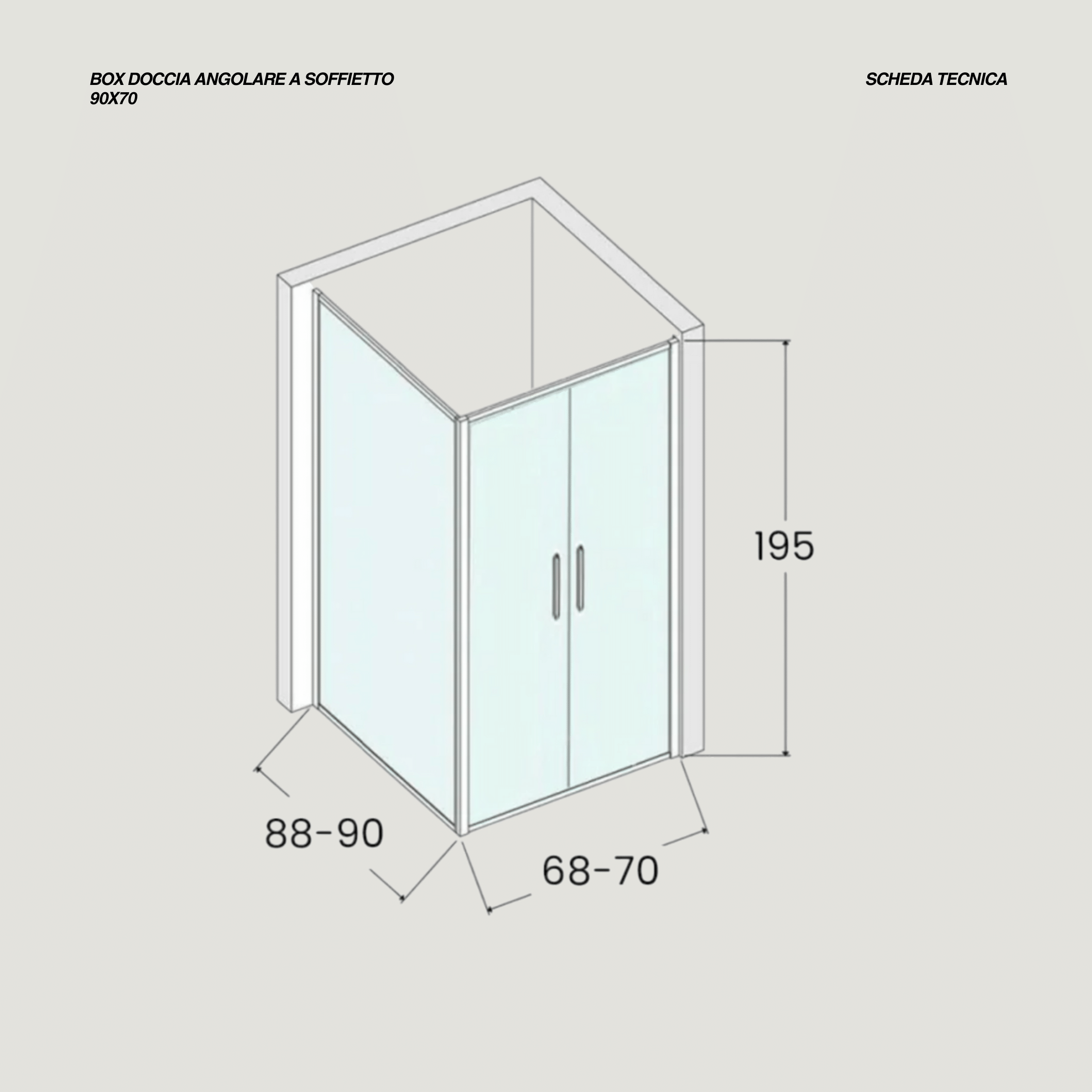 Il box doccia angolare con doppia porta a saloon si distingue per la sua eleganza e per la praticità delle aperture, progettate per funzionare sia verso l’interno che verso l’esterno, offrendo un utilizzo versatile e fluido. La struttura è impreziosita da profili in alluminio con finitura nero opaco, un dettaglio che conferisce al prodotto un carattere deciso e contemporaneo, perfettamente in linea con ambienti bagno dal gusto moderno e minimalista. Il vetro trasparente da 6 mm di spessore garantisce solidità e luminosità, creando un effetto di leggerezza e ampiezza visiva.La dimensione di 90x70 cm prevede un’estensibilità regolabile da 88 a 90 cm per la parete fissa e da 68 a 70 cm per la doppia porta a saloon, con una tolleranza di regolazione di 2 cm che facilita l’installazione e assicura una perfetta adattabilità. Le maniglie, realizzate anch’esse in alluminio nero opaco, completano il design con un dettaglio coerente e raffinato, mentre la chiusura magnetica garantisce sicurezza e praticità nell’utilizzo quotidiano.Questo box doccia non è soltanto un elemento funzionale, ma diventa parte integrante del design del bagno, trasformando lo spazio in un ambiente di comfort e stile, dove la cura dei dettagli e la qualità dei materiali si fondono in un equilibrio armonioso.