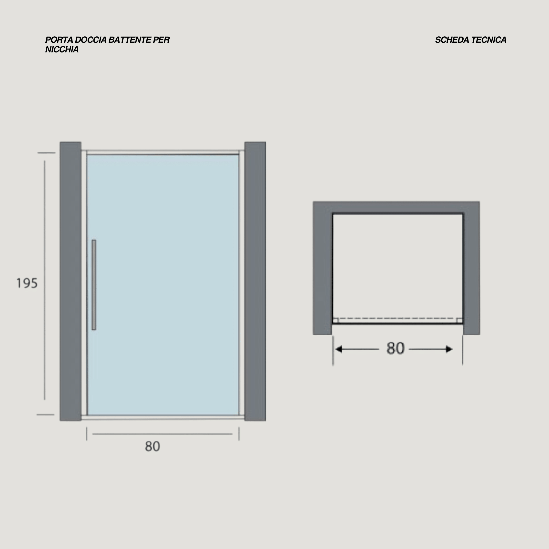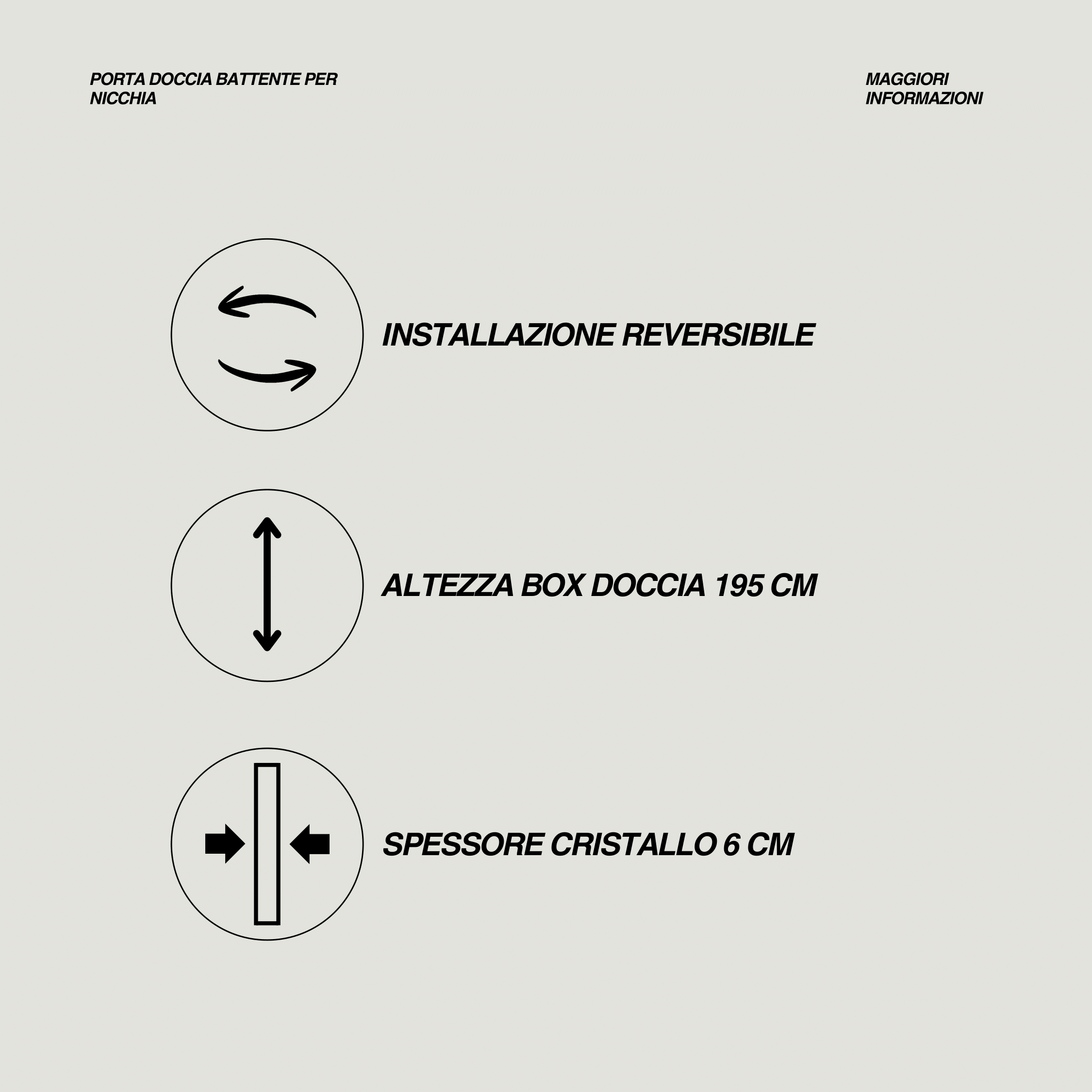 Il box doccia con apertura esterna a battente è una soluzione elegante e funzionale, pensata per chi desidera un ambiente bagno moderno e ordinato. La sua dimensione di 80 cm, con estensibilità da 78 a 80 cm e altezza di 195 cm, lo rende adatto a diverse configurazioni, garantendo al tempo stesso praticità e comfort. I profili in alluminio con finitura nero opaco conferiscono un carattere contemporaneo e raffinato, mentre il cristallo da 6 mm di spessore assicura solidità e sicurezza nell’utilizzo quotidiano.L’installazione è reversibile, permettendo di adattare il box doccia alle diverse esigenze di spazio, e la chiusura magnetica garantisce una perfetta tenuta, evitando fuoriuscite d’acqua. Per l’installazione a nicchia è necessario il profilo di chiusura, che completa la struttura e ne assicura la stabilità. Ogni dettaglio è stato studiato per offrire un prodotto resistente, funzionale e dal design essenziale, capace di integrarsi armoniosamente in qualsiasi ambiente bagno.
