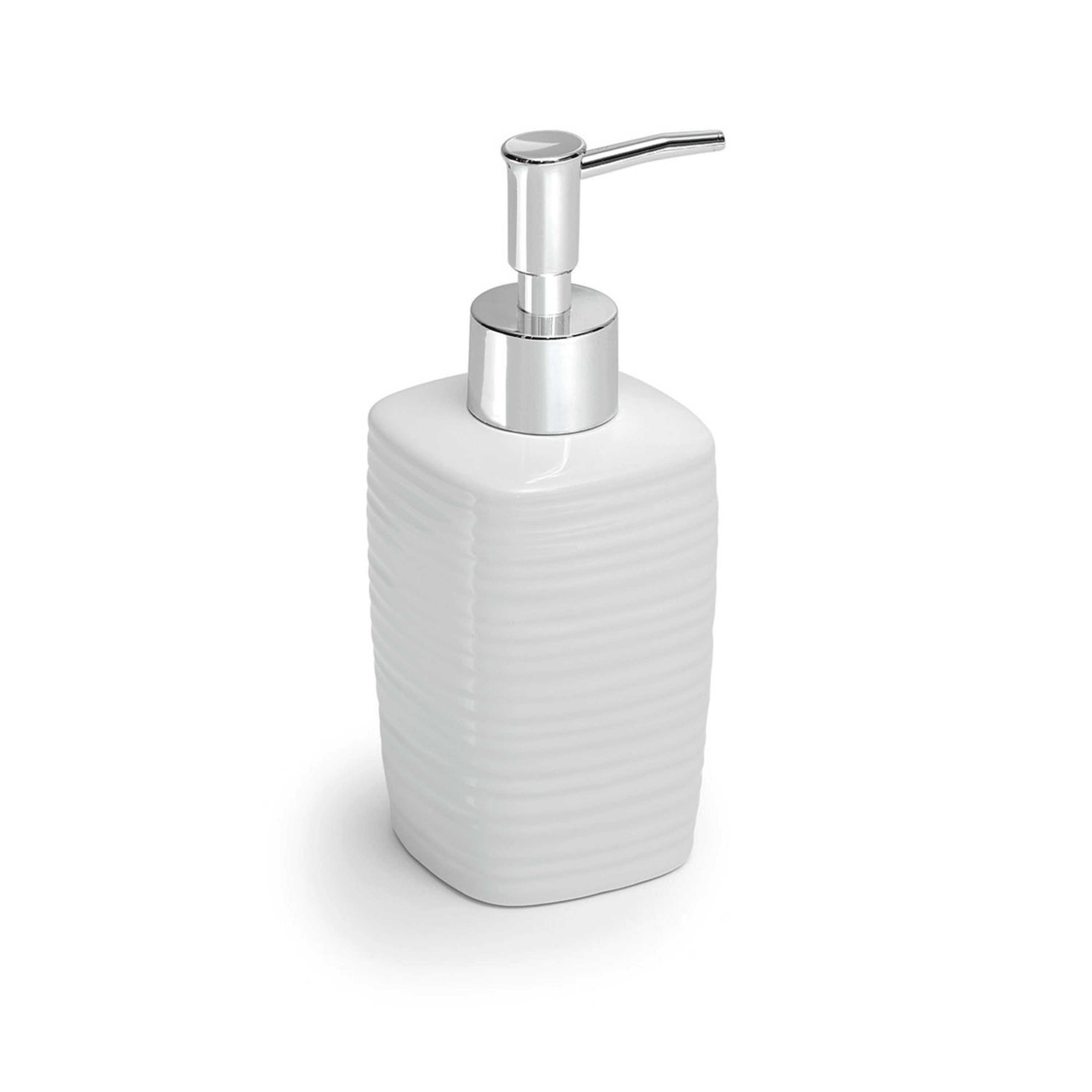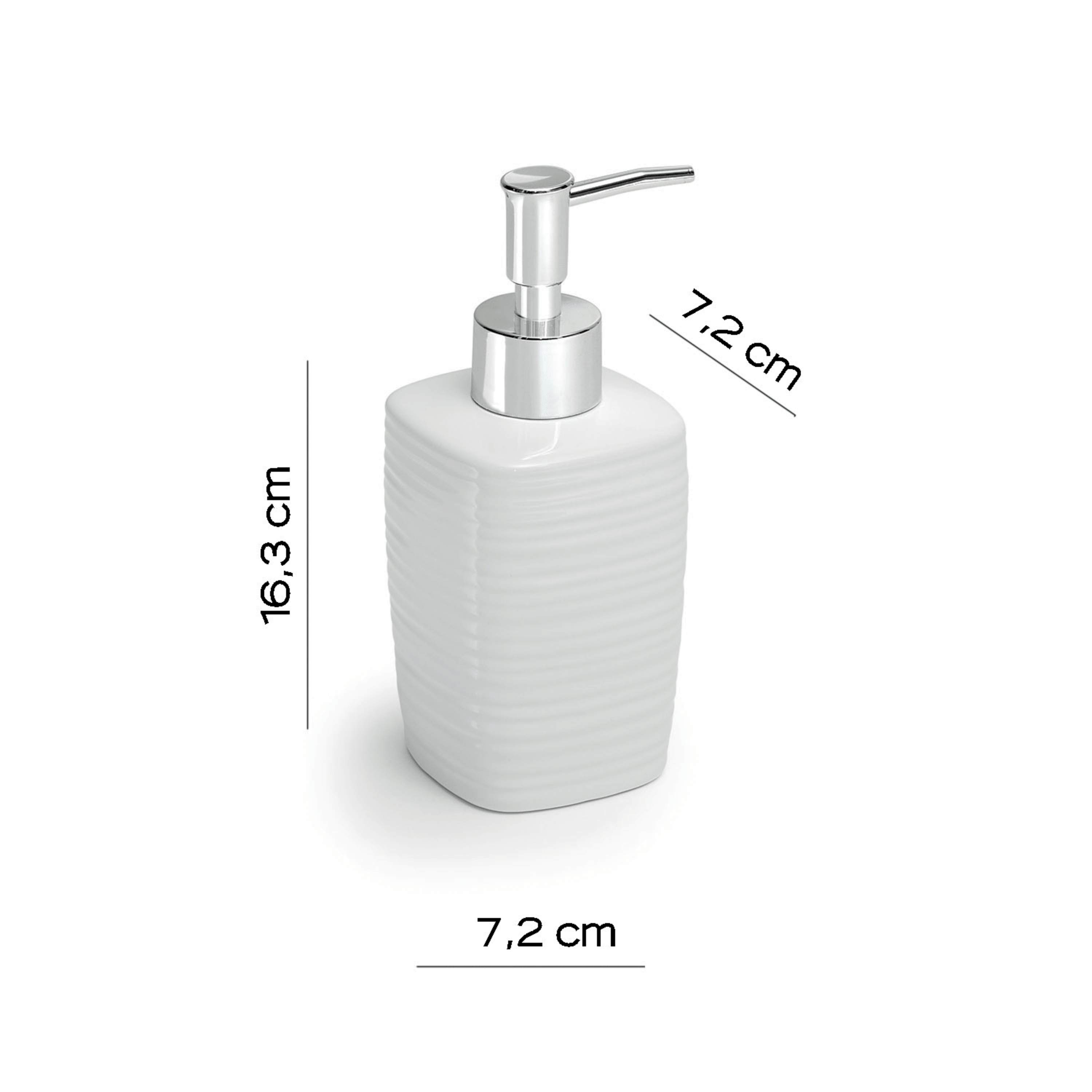 Il portadispenser in ceramica con erogatore in plastica cromata unisce essenzialità e raffinatezza, trasformando un accessorio quotidiano in un dettaglio di design sobrio e armonioso. La superficie bianca, luminosa e senza tempo, dona al bagno un senso di ordine e pulizia, mentre l’erogatore cromato aggiunge una nota moderna e brillante, ideale per ambienti contemporanei o più classici.Con dimensioni di 7,2 cm di larghezza, 7,2 cm di profondità e 16,3 cm di altezza, presenta una forma compatta e ben proporzionata, studiata per garantire stabilità e praticità nell’uso quotidiano. La qualità dei materiali assicura resistenza e durata, rendendo questo portadispenser un complemento discreto ma elegante, perfetto per valorizzare qualsiasi piano d’appoggio.