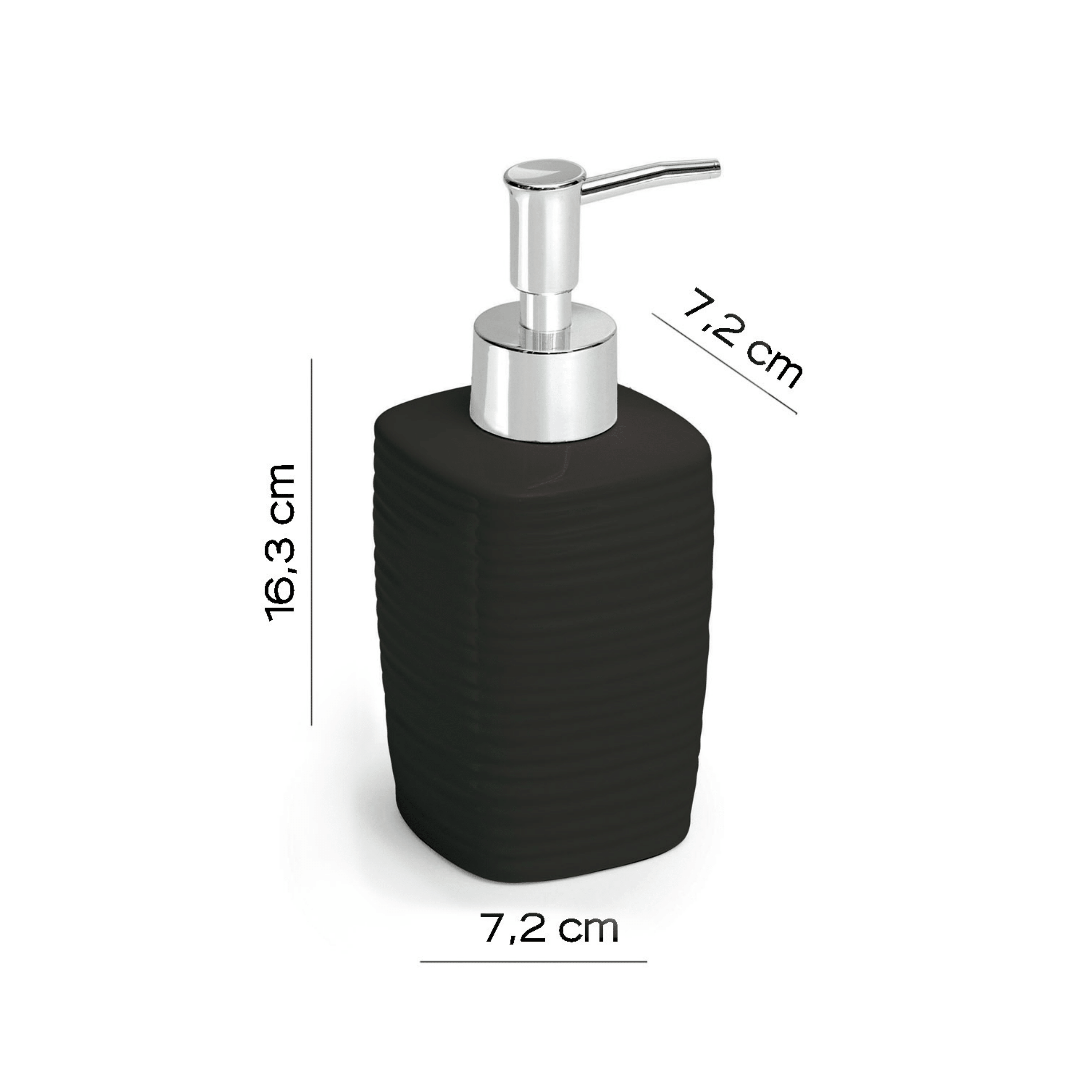 Il portadispenser in ceramica con erogatore in plastica cromata unisce essenzialità e raffinatezza, trasformando un accessorio quotidiano in un dettaglio di design sobrio e armonioso. La superficie nero, luminosa e senza tempo, dona al bagno un senso di ordine e pulizia, mentre l’erogatore cromato aggiunge una nota moderna e brillante, ideale per ambienti contemporanei o più classici.Con dimensioni di 7,2 cm di larghezza, 7,2 cm di profondità e 16,3 cm di altezza, presenta una forma compatta e ben proporzionata, studiata per garantire stabilità e praticità nell’uso quotidiano. La qualità dei materiali assicura resistenza e durata, rendendo questo portadispenser un complemento discreto ma elegante, perfetto per valorizzare qualsiasi piano d’appoggio.