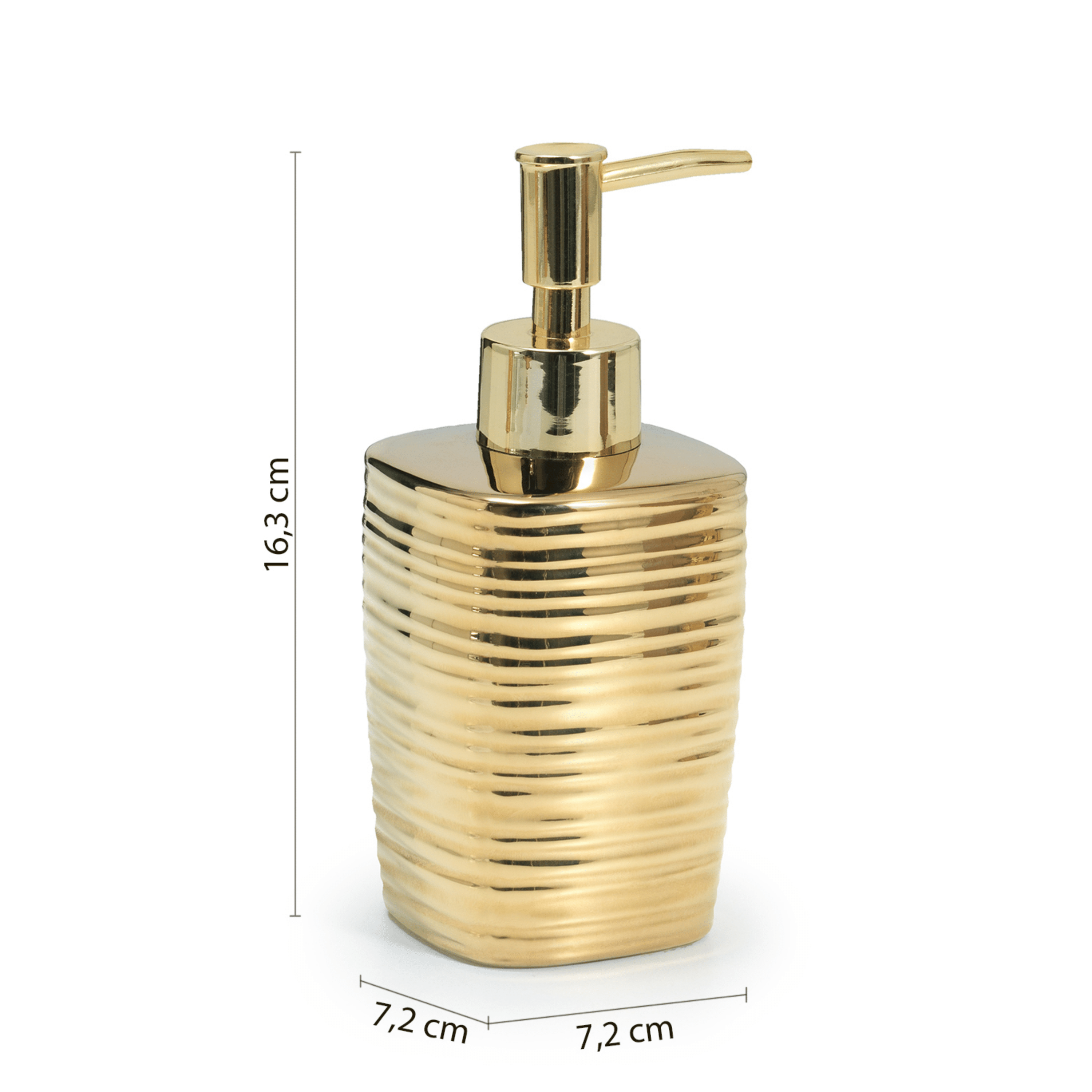 Il portadispenser in ceramica con erogatore in plastica cromata unisce essenzialità e raffinatezza, trasformando un accessorio quotidiano in un dettaglio di design sobrio e armonioso. La superficie oro, luminosa e senza tempo, dona al bagno un senso di ordine e pulizia, mentre l’erogatore cromato aggiunge una nota moderna e brillante, ideale per ambienti contemporanei o più classici.Con dimensioni di 7,2 cm di larghezza, 7,2 cm di profondità e 16,3 cm di altezza, presenta una forma compatta e ben proporzionata, studiata per garantire stabilità e praticità nell’uso quotidiano. La qualità dei materiali assicura resistenza e durata, rendendo questo portadispenser un complemento discreto ma elegante, perfetto per valorizzare qualsiasi piano d’appoggio.