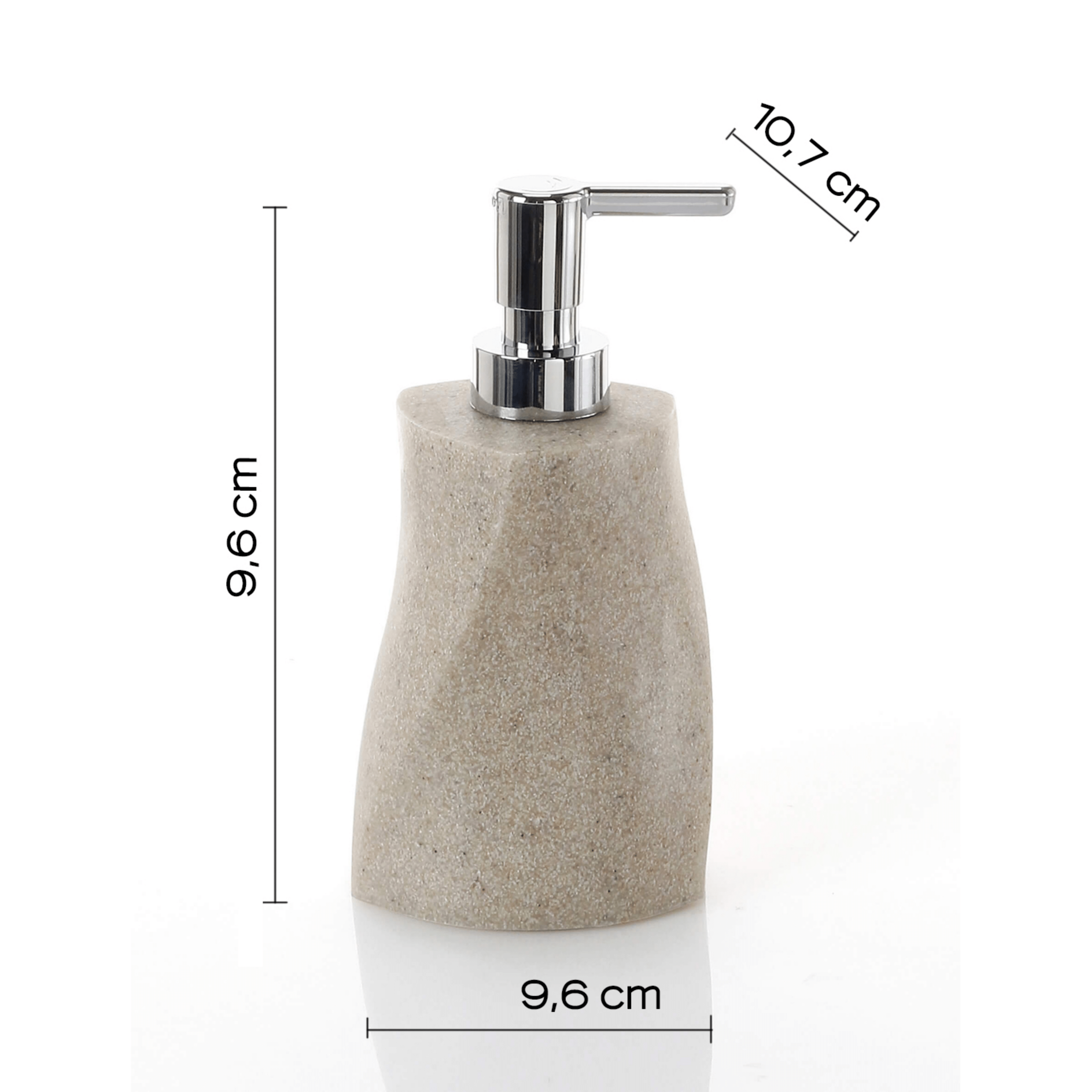Questo portadispenser è realizzato in resina e sabbia con una elegante finitura beige che dona al prodotto un aspetto naturale e sofisticato, ideale per arricchire l’ambiente bagno con discrezione e stile. L’erogatore in plastica con finitura cromata crea un piacevole contrasto visivo e garantisce praticità e facilità di utilizzo, consentendo una distribuzione del sapone fluida e controllata. Pensato per un uso quotidiano, il dispenser aiuta a mantenere il lavabo ordinato e funzionale, integrandosi armoniosamente in bagni dallo stile moderno, minimal o ispirato a materiali naturali. La struttura solida assicura stabilità sul piano d’appoggio, mentre le dimensioni di 9 cm di larghezza, 10,7 cm di profondità e 17,5 cm di altezza lo rendono compatto ma capiente, perfetto per un utilizzo pratico senza risultare ingombrante.