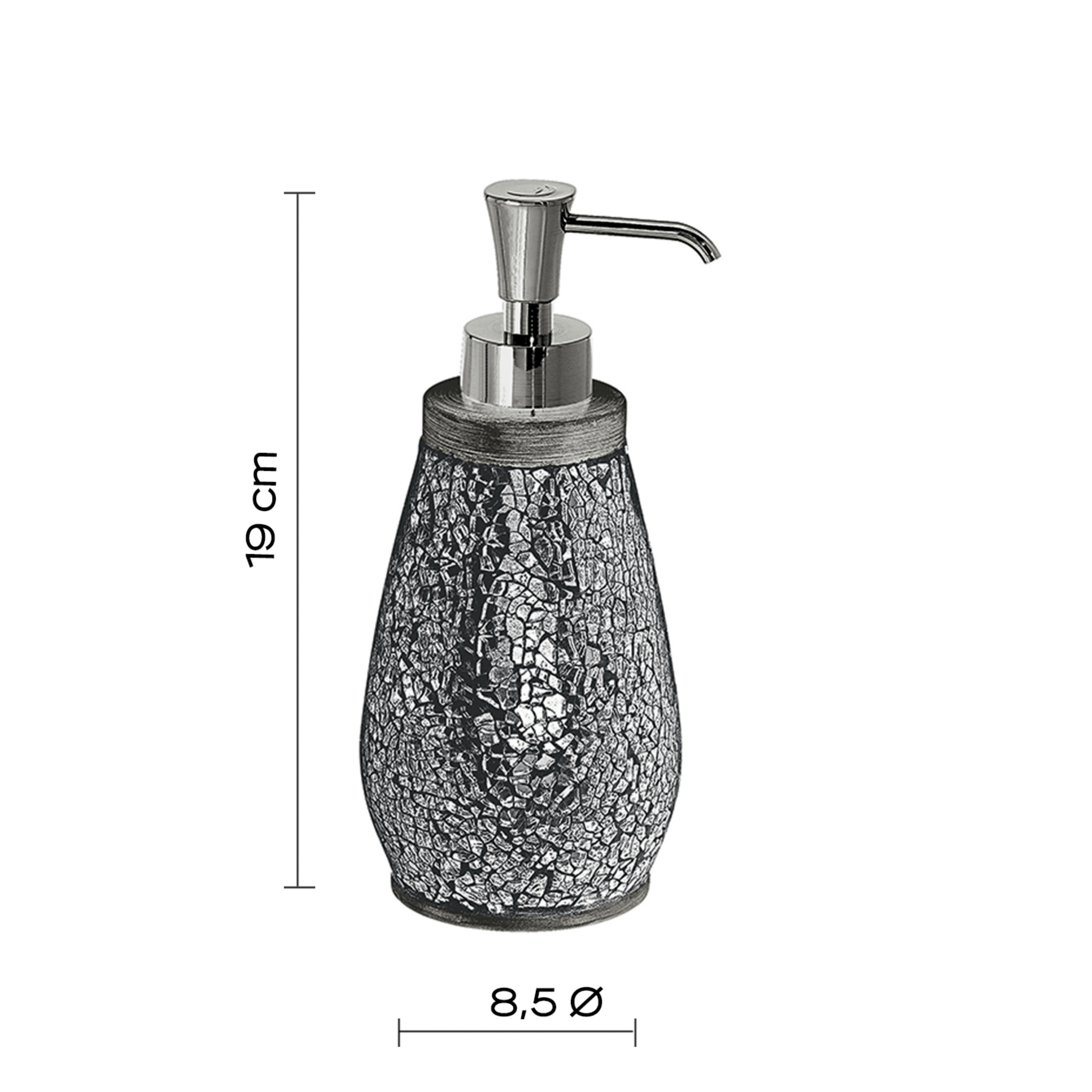 Il portadispenser d’appoggio in ceramica e vetro con finitura argento si distingue per il suo design elegante e luminoso, trasformando un accessorio quotidiano in un dettaglio di stile raffinato. La combinazione di ceramica e vetro dona solidità e trasparenza, mentre la finitura argento esalta l’eleganza con riflessi preziosi e contemporanei, perfetti per arricchire ambienti bagno dal carattere sofisticato.Con un diametro di 8,5 cm e un’altezza di 19 cm, la sua forma proporzionata e slanciata è studiata per garantire praticità e stabilità, offrendo al tempo stesso un impatto visivo equilibrato. La scelta dei materiali non è soltanto estetica: ceramica e vetro assicurano resistenza e durata, mentre la finitura argento aggiunge un tocco di esclusività che impreziosisce l’ambiente.
