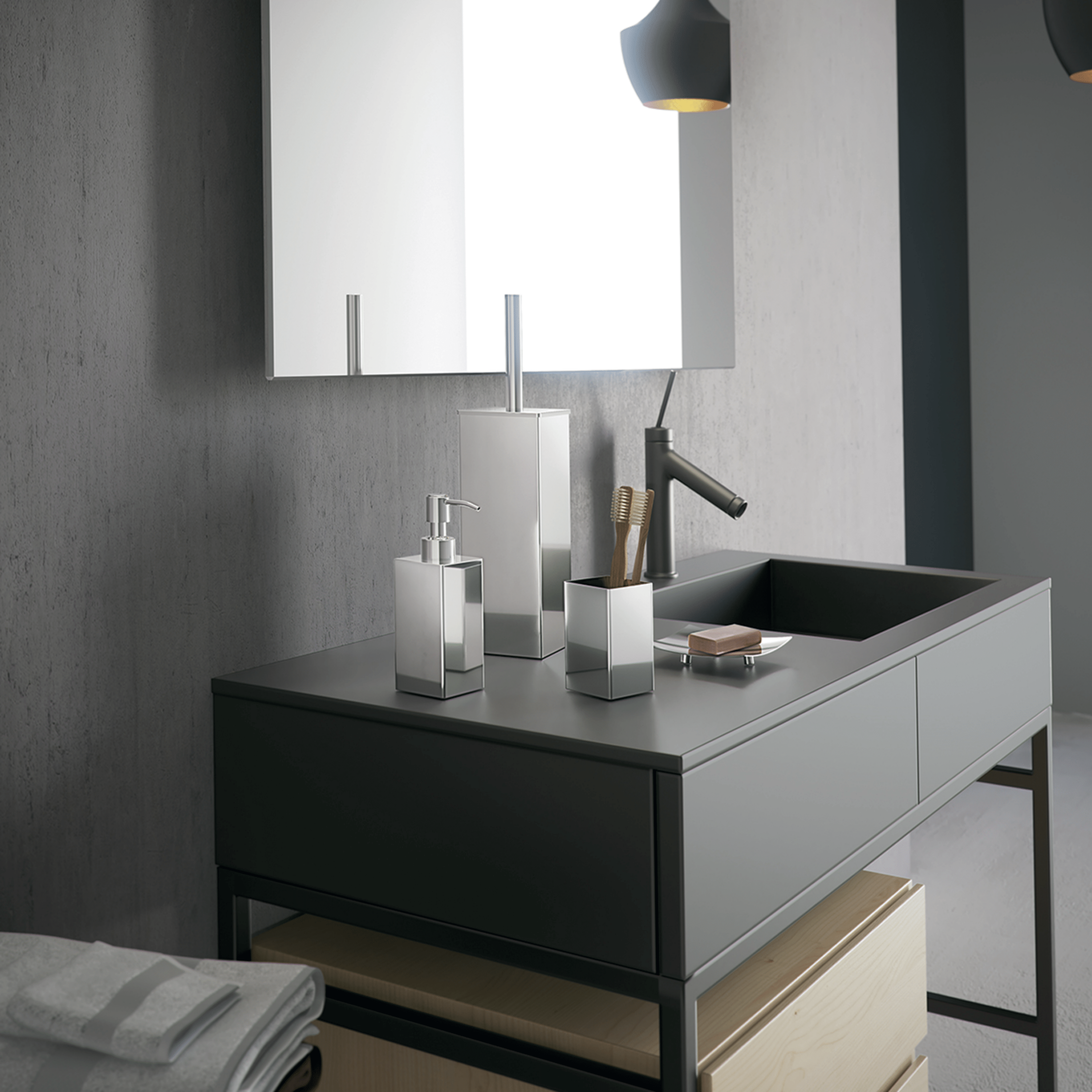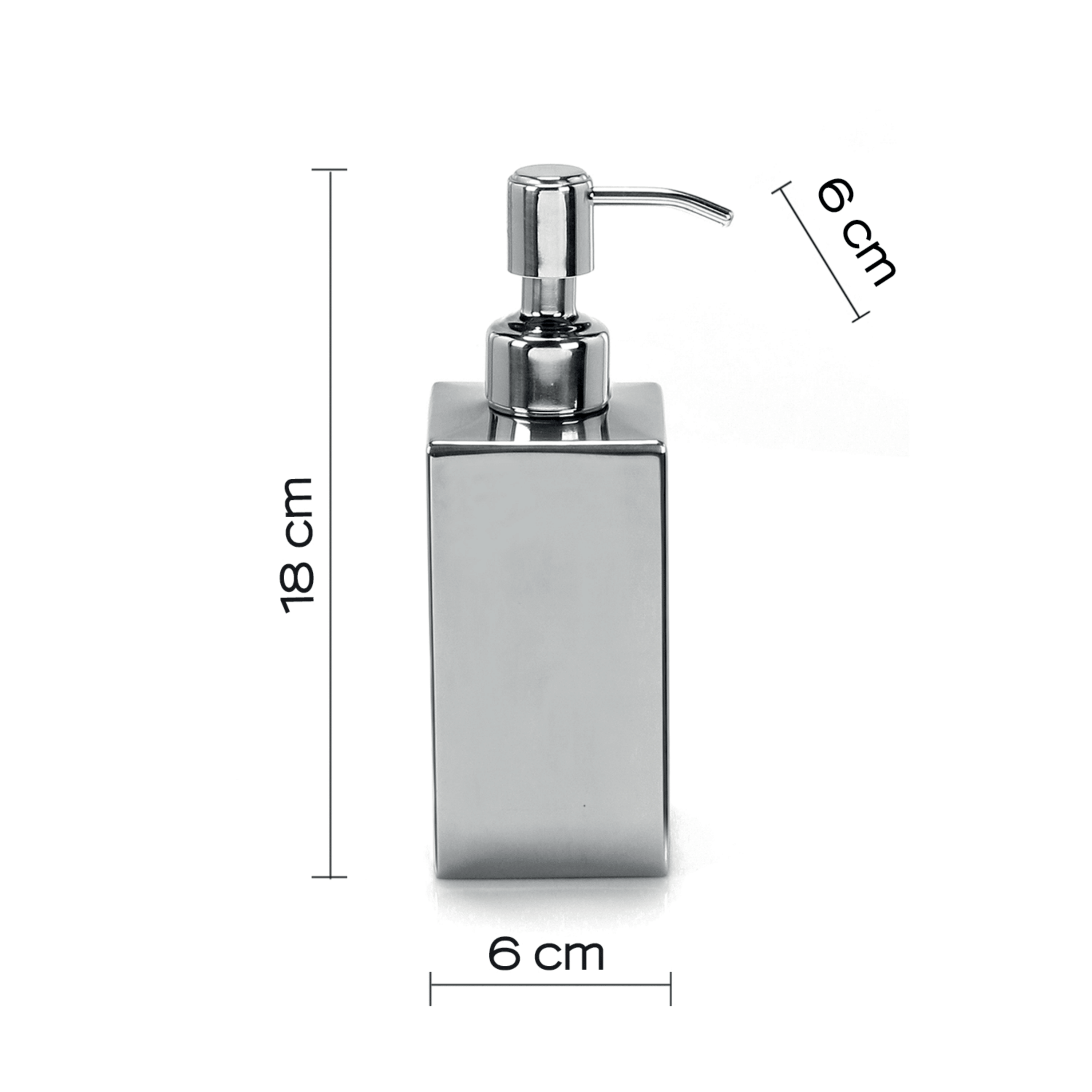 Un accessorio elegante e funzionale, pensato per arricchire l’ambiente bagno con stile e praticità. Realizzato in acciaio inox con erogatore in finitura cromo lucido, garantisce resistenza, igiene e un aspetto sempre brillante.Le dimensioni compatte (L 6 × P 6 × H 18 cm) lo rendono proporzionato e discreto, ideale per l’appoggio su qualsiasi superficie. La sua linea moderna e minimalista si adatta a diversi stili d’arredo, trasformando un gesto quotidiano in un dettaglio di classe.