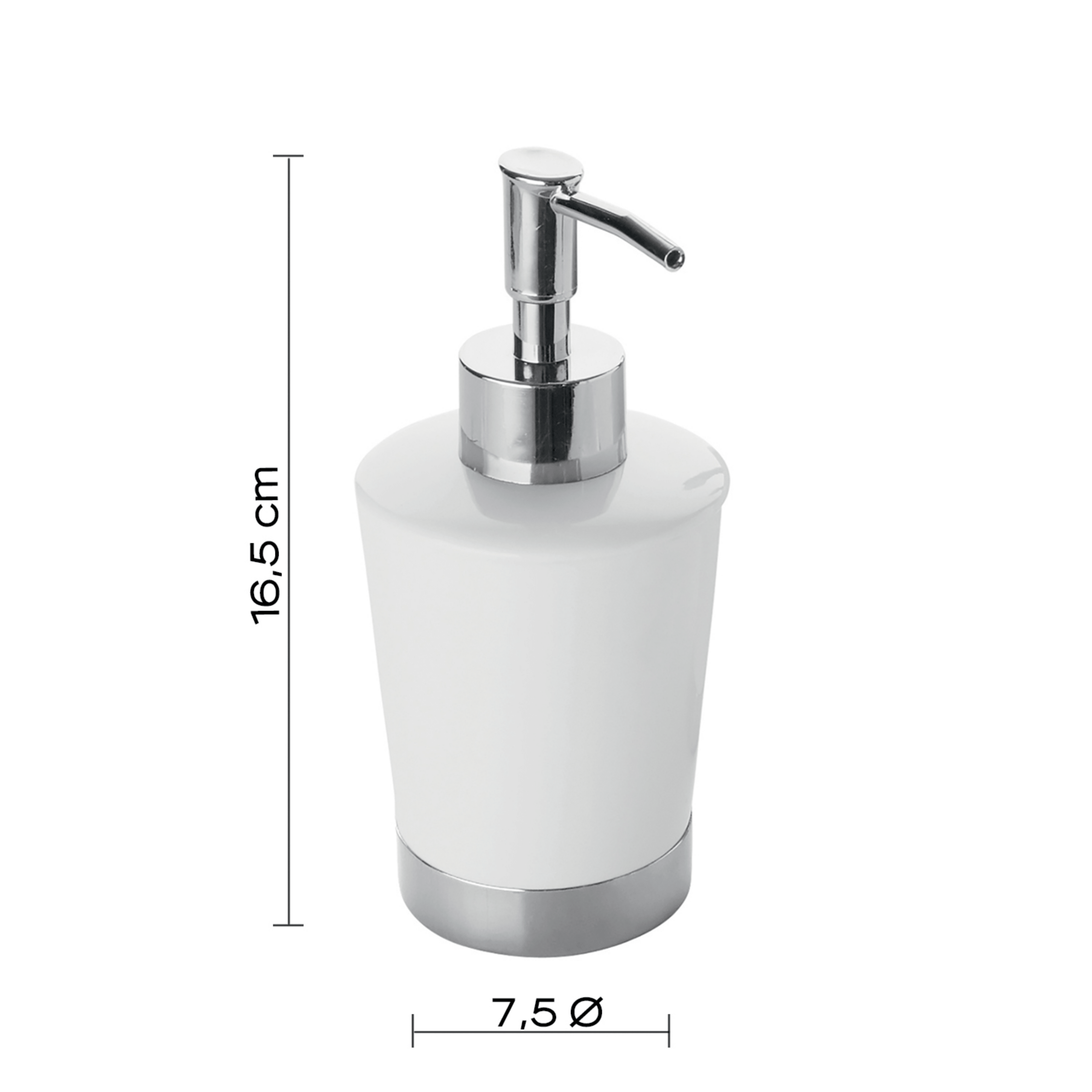 Il portadispenser in ceramica e acciaio inox con erogatore in plastica cromata unisce materiali di qualità e un’estetica essenziale, trasformando un accessorio quotidiano in un dettaglio di design raffinato. La ceramica con finitura bianco, luminosa e senza tempo, si armonizza con l’acciaio inox, che aggiunge un tocco moderno e brillante, mentre l’erogatore cromato completa l’insieme con una nota contemporanea.Con un diametro di 7,5 cm e un’altezza di 16,5 cm, presenta proporzioni compatte e ben bilanciate, pensate per garantire praticità e stabilità nell’uso quotidiano. La combinazione dei materiali assicura resistenza, durata e un impatto visivo elegante, rendendo questo portadispenser un complemento discreto ma di grande stile, ideale per valorizzare qualsiasi piano d’appoggio.