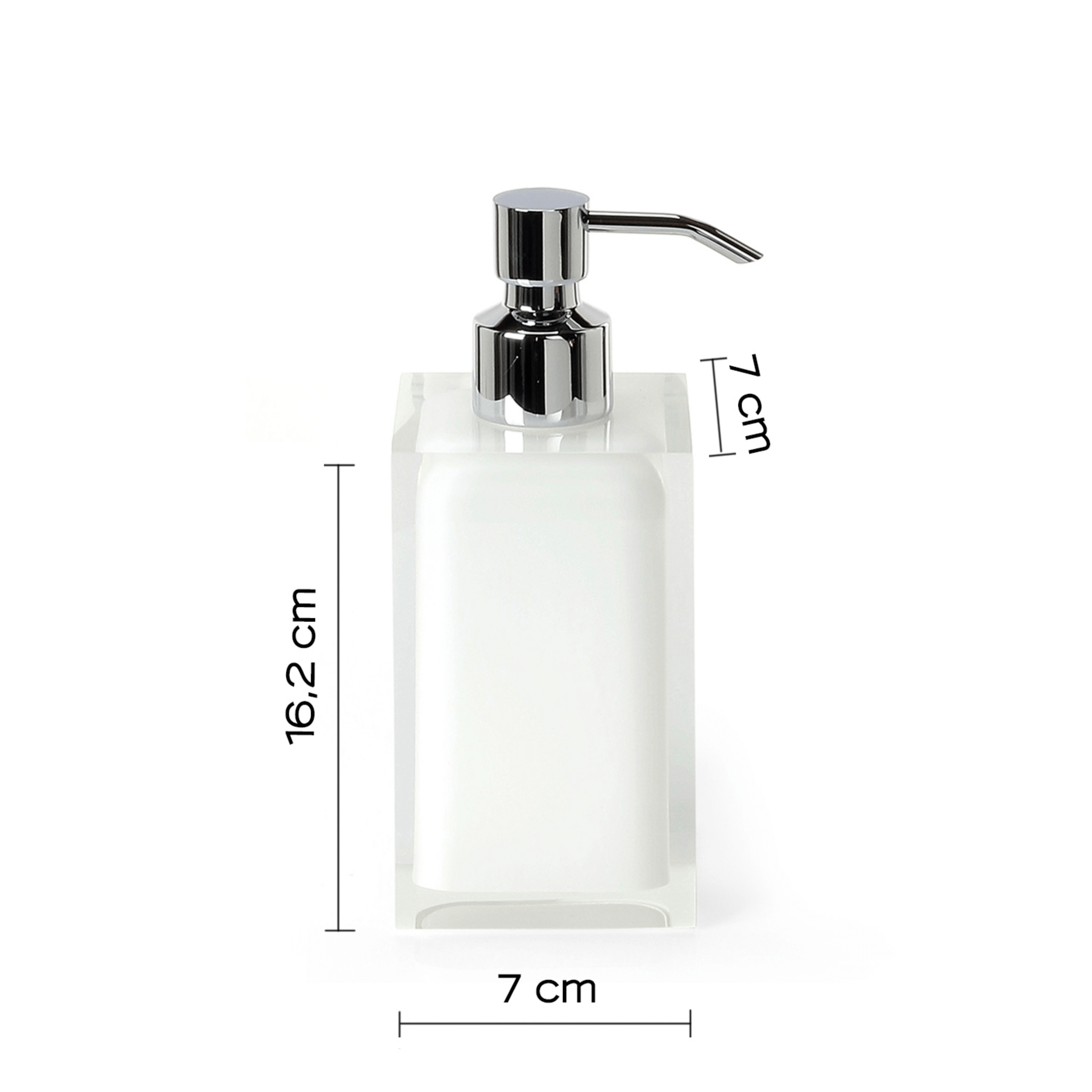 Questo portadispenser d’appoggio è realizzato in resina con finitura bianca e completato da un erogatore in metallo con finitura cromata, una combinazione che dona al prodotto un aspetto elegante e raffinato, ideale per valorizzare l’ambiente bagno. Pensato per l’utilizzo quotidiano, consente di dosare il sapone in modo pratico e controllato, contribuendo a mantenere il lavabo ordinato e funzionale. Il design essenziale e compatto si integra facilmente in diversi stili di arredo, dal moderno al minimal fino al classico. La struttura stabile garantisce un appoggio sicuro su qualsiasi piano, mentre le dimensioni di 7 cm di larghezza, 7 cm di profondità e 16,2 cm di altezza lo rendono poco ingombrante ma capiente, perfetto per un uso pratico ed elegante.