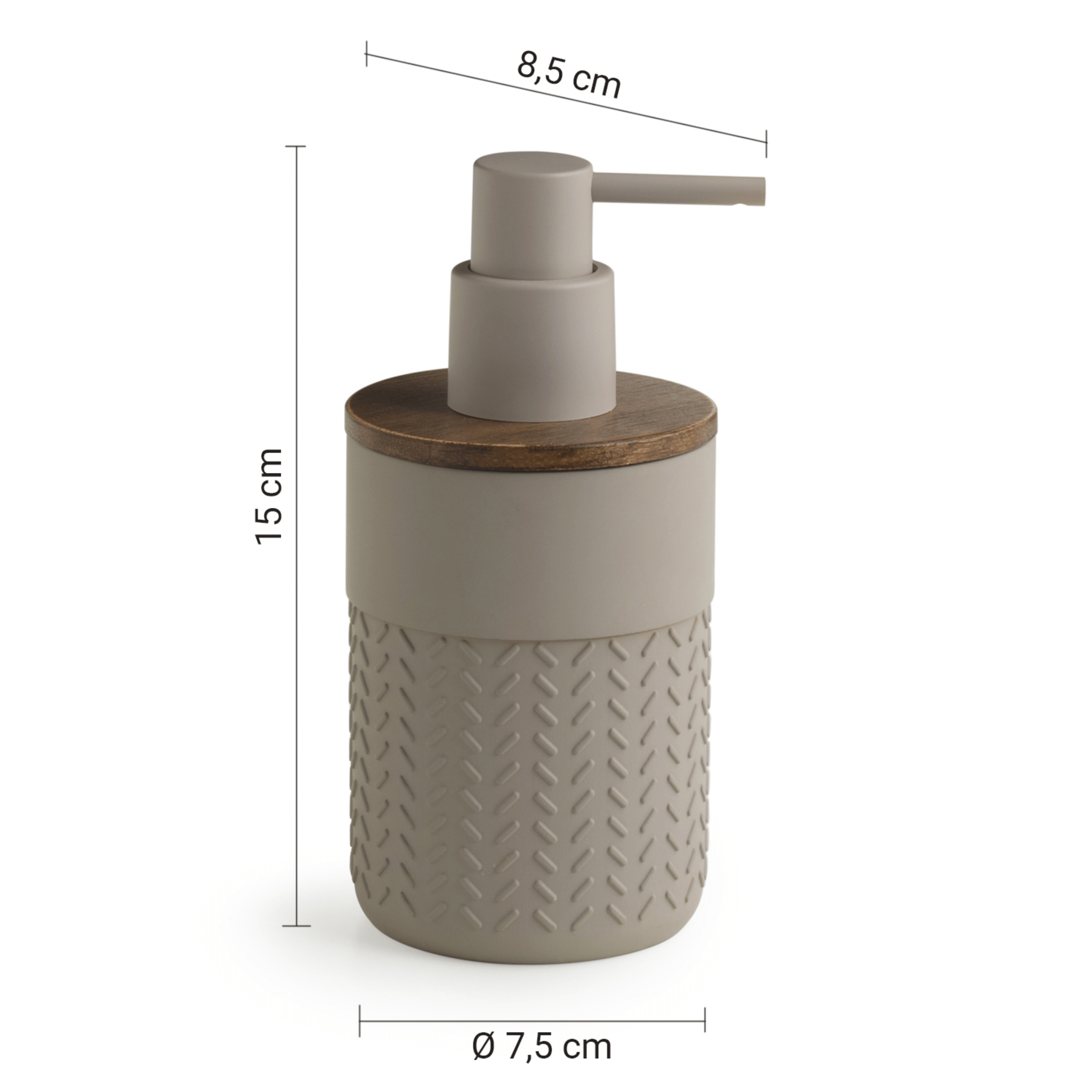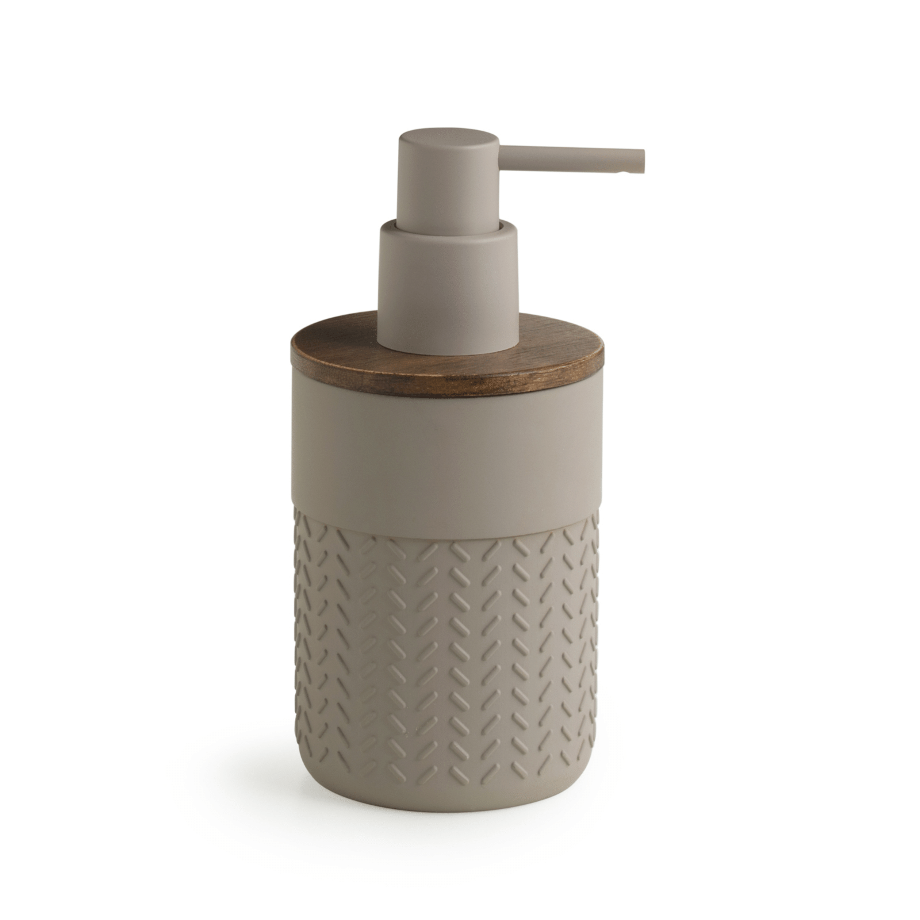 Portadispenser d’appoggio dal design pulito e contemporaneo, realizzato in resina resistente con dettagli in bambù naturale. La struttura presenta una forma morbida e compatta, con diametro 7,5 cm, profondità 8,5 cm e altezza di 15 cm, studiata per garantire stabilità e una capacità ideale per l’uso quotidiano.L’erogatore in plastica, discreto e funzionale, assicura un flusso regolare di sapone liquido o lozione, mentre il contrasto tra la resina e il bambù aggiunge un tocco materico che richiama atmosfere naturali e rilassanti. Perfetto per bagni moderni, minimalisti o ispirati alla natura, completa con eleganza la linea coordinata degli accessori.