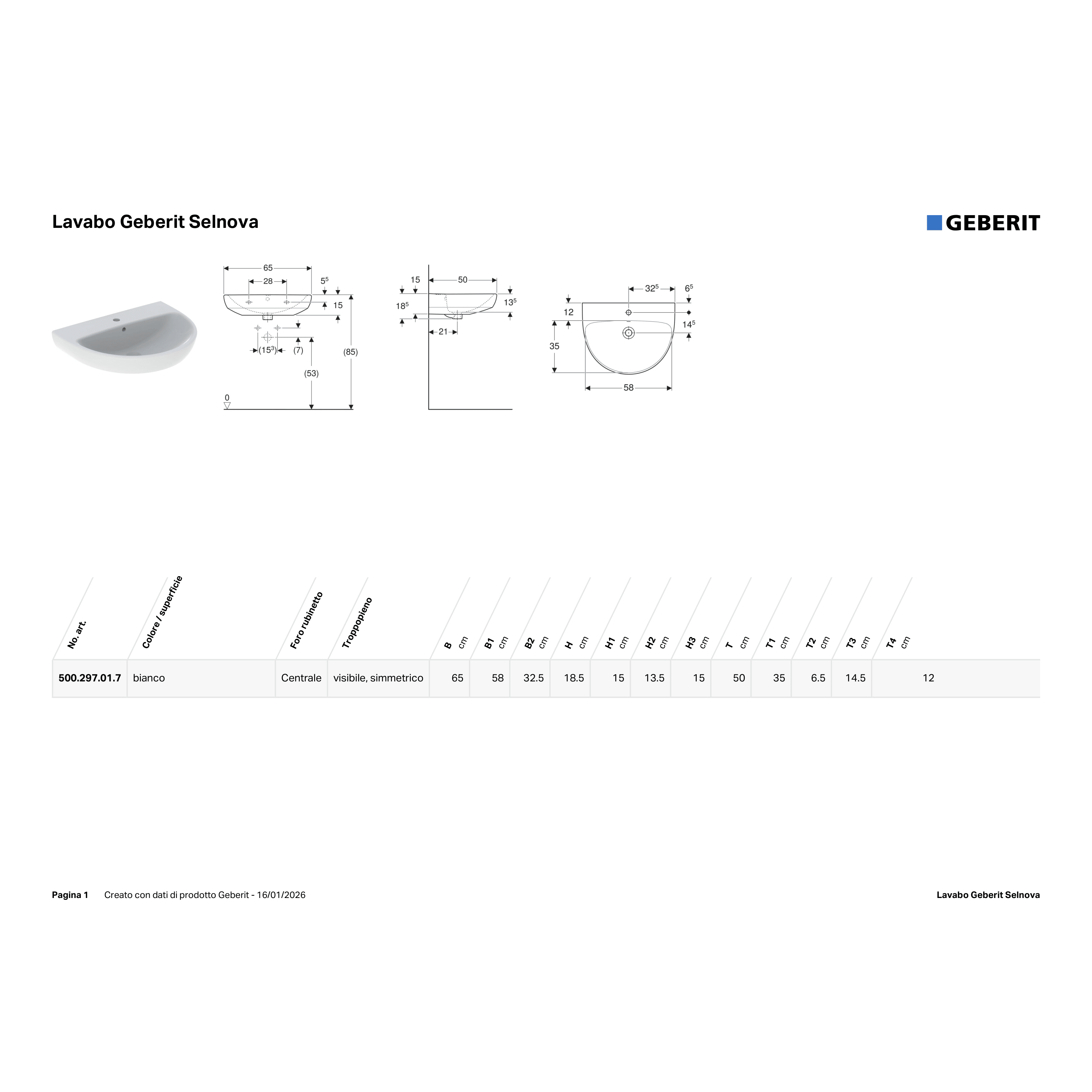 Lavabo Con Colonna 65 Cm Geberit "Selnova" Bianco Lucido