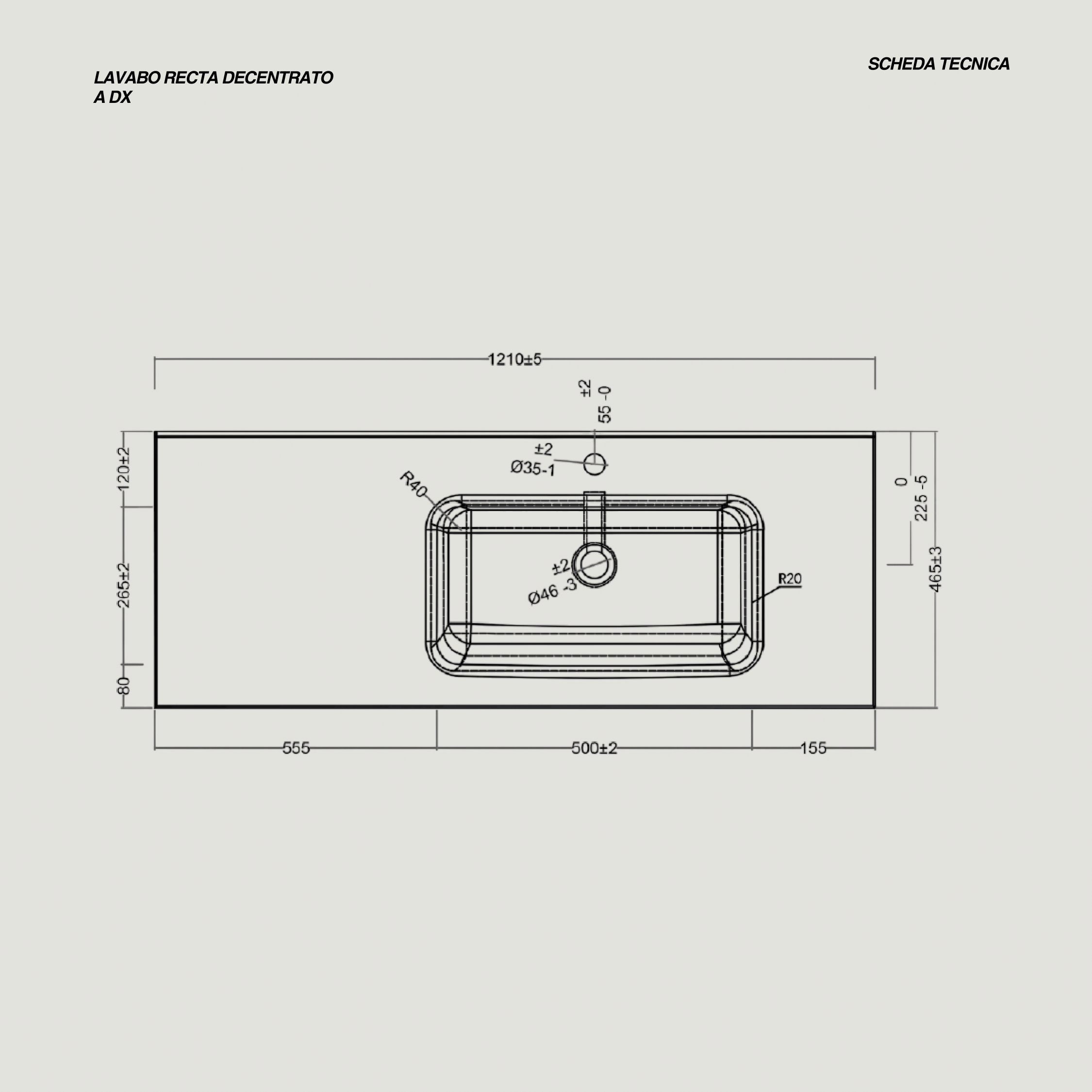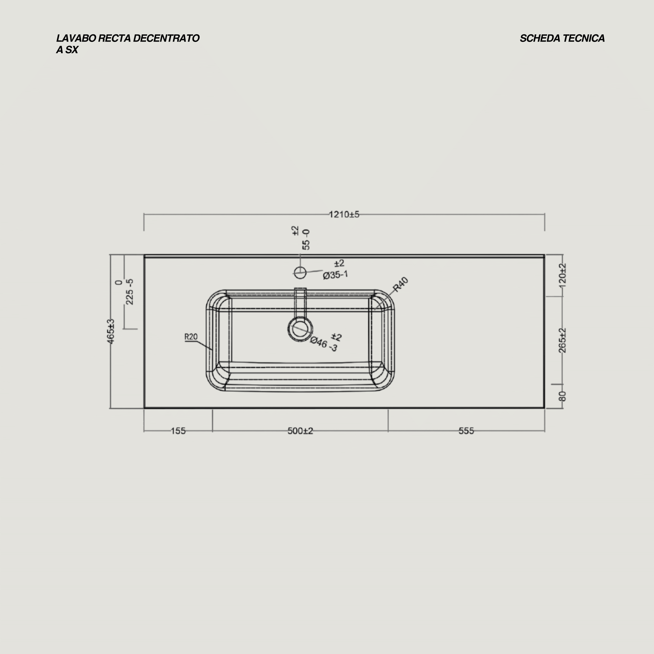 - Misure lavabo: L 121 x P 46 x H 12 (cm)