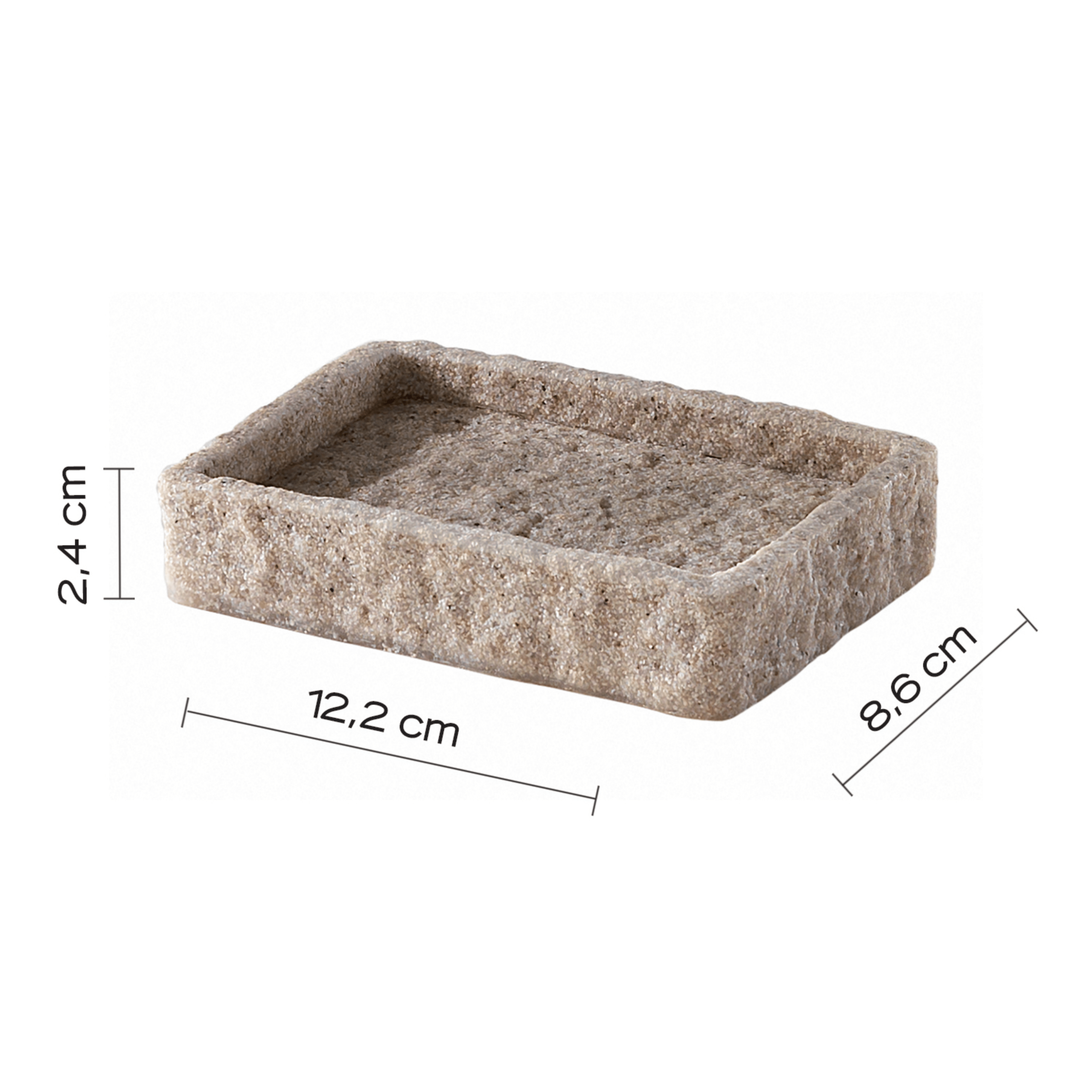Portasapone d’appoggio realizzato in resina e sabbia, materiali che garantiscono solidità, una piacevole texture naturale e un’estetica raffinata. La finitura beige dona calore e morbidezza visiva, rendendo l’accessorio ideale per ambienti bagno moderni, naturali o minimalisti.Le dimensioni — lunghezza 12,2 cm, profondità 8,6 cm e altezza 2,4 cm — definiscono una forma sottile e ben proporzionata, progettata per accogliere il sapone solido mantenendo ordine ed eleganza sul piano lavabo.Un complemento pratico e armonioso, perfetto per completare con coerenza la collezione coordinata in resina e sabbia finitura beige.