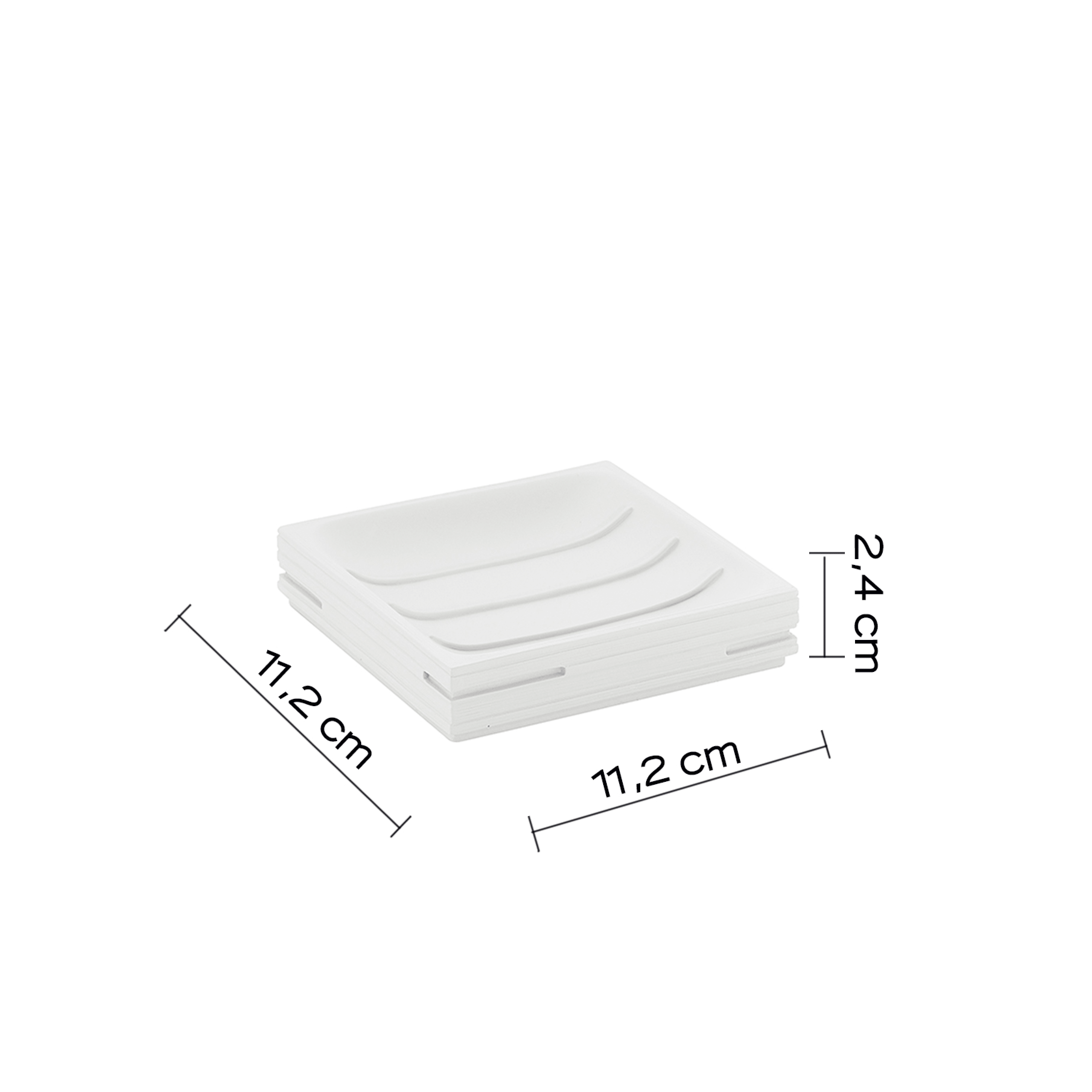 Il portasapone è realizzato in resina con finitura bianca e presenta un design essenziale e luminoso, ideale per completare l’arredo del bagno con discrezione ed eleganza. Pensato per l’uso quotidiano, consente di appoggiare il sapone in modo ordinato e igienico, contribuendo a mantenere il piano del lavabo pulito e ben organizzato. La forma compatta e la struttura stabile lo rendono adatto a qualsiasi superficie d’appoggio, integrandosi armoniosamente in ambienti bagno moderni, minimal o classici. Le dimensioni di 11,2 cm di larghezza, 11,2 cm di profondità e 2,4 cm di altezza lo rendono pratico e poco ingombrante, perfetto per un utilizzo funzionale e raffinato.