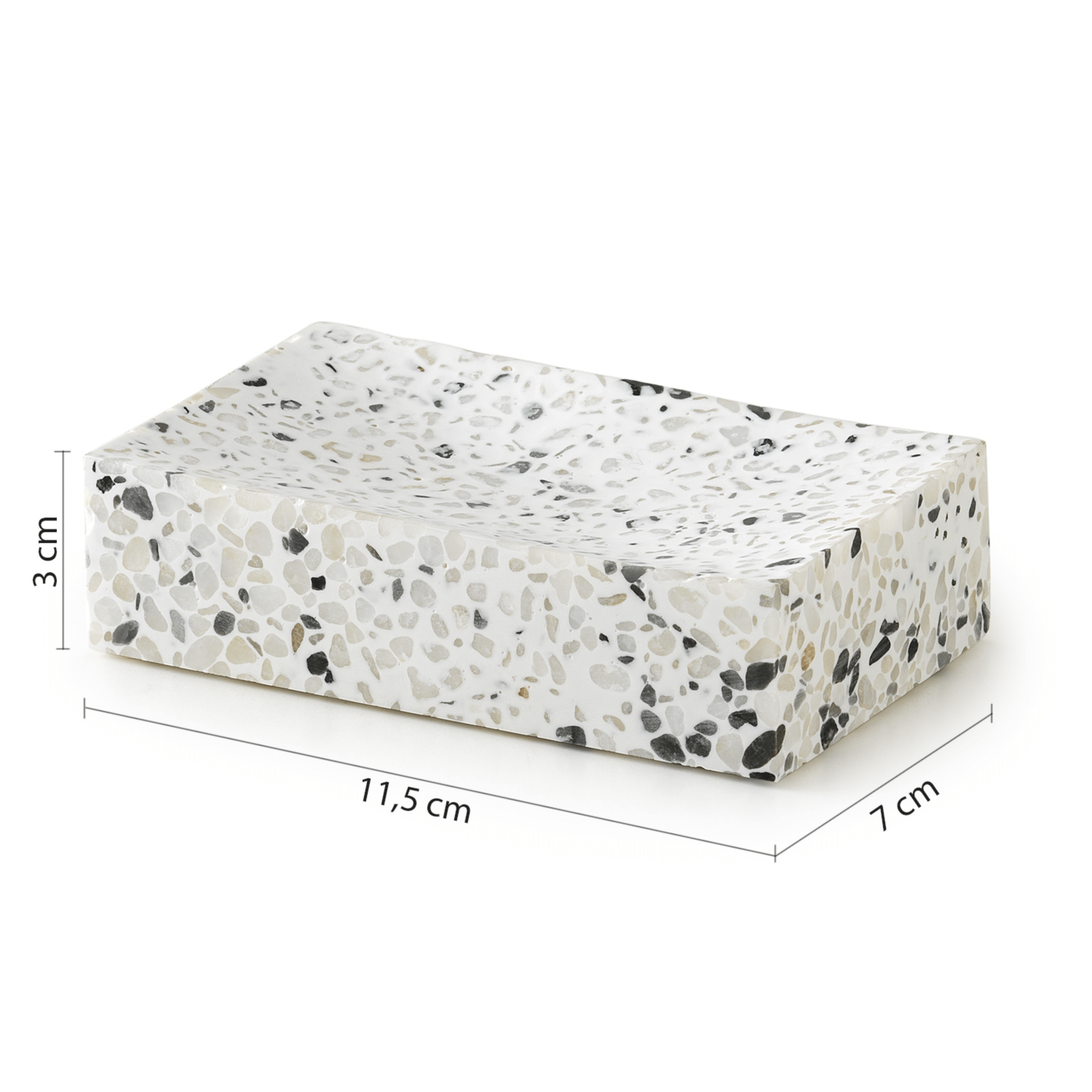 Il portasapone è realizzato in resina e pietre con una raffinata finitura effetto graniglia di marmo, che conferisce al prodotto un aspetto elegante e materico ispirato alla naturale bellezza della pietra. Pensato per l’utilizzo quotidiano, permette di appoggiare il sapone in modo ordinato e igienico, contribuendo a mantenere il piano del lavabo pulito e ben organizzato. Il design essenziale e compatto si integra armoniosamente in diversi stili di bagno, dal classico al contemporaneo, aggiungendo un tocco di sobria eleganza all’ambiente. La struttura solida garantisce stabilità sul piano d’appoggio, mentre le dimensioni di 11,5 cm di larghezza, 7 cm di profondità e 3 cm di altezza lo rendono pratico e discreto, ideale per ottimizzare lo spazio con stile.