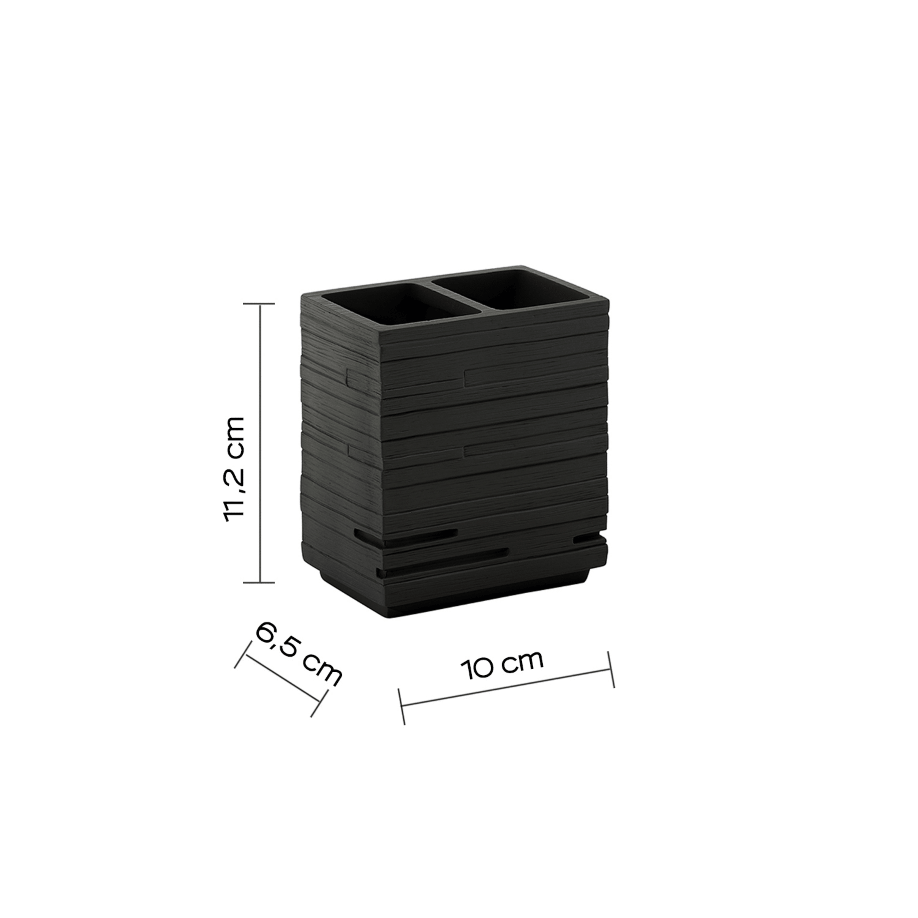 Questo portaspazzolino d’appoggio è realizzato in resina con finitura nero e presenta un design essenziale e luminoso, ideale per completare l’arredo del bagno con uno stile pulito ed elegante. Pensato per mantenere gli spazzolini ordinati e sempre a portata di mano, contribuisce a migliorare l’organizzazione del lavabo e a garantire un utilizzo quotidiano pratico e igienico. La struttura compatta e stabile lo rende adatto a qualsiasi piano d’appoggio, integrandosi facilmente in ambienti bagno moderni, minimal o classici. Le dimensioni di 10 cm di larghezza, 6,5 cm di profondità e 11,2 cm di altezza lo rendono funzionale e poco ingombrante, perfetto per ottimizzare lo spazio con discrezione ed eleganza.