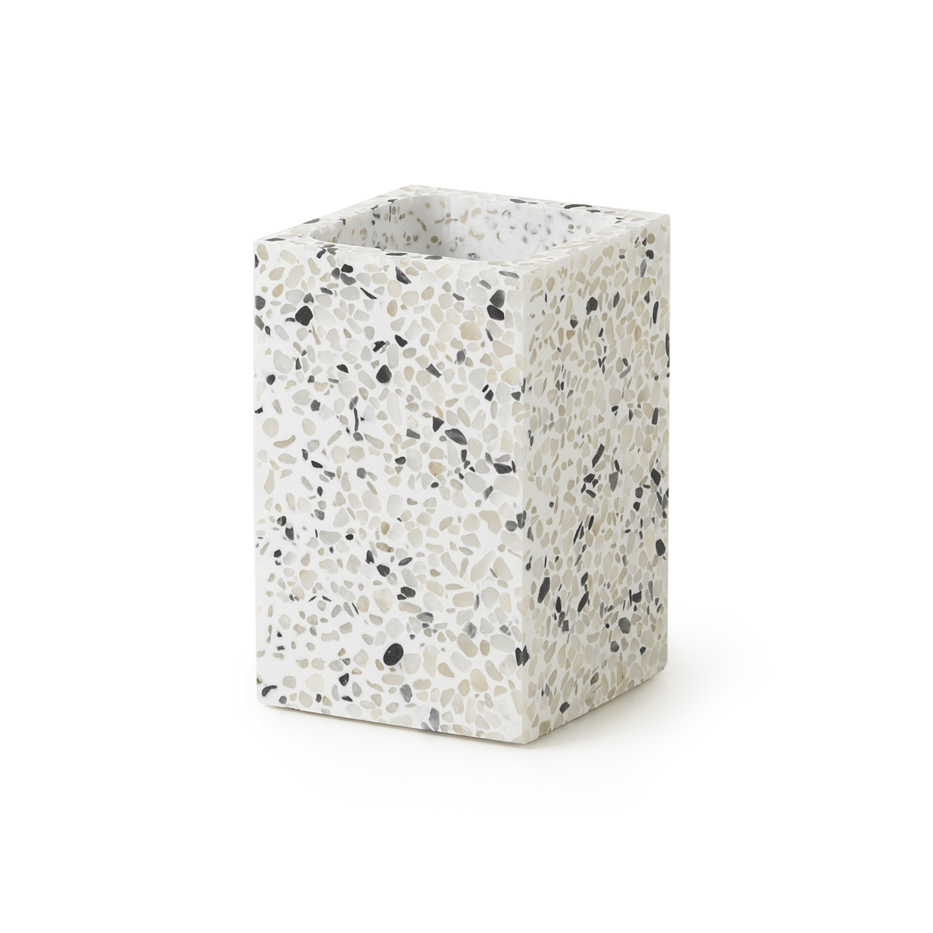 Il portaspazzolino d’appoggio è realizzato in resina e pietre con una raffinata finitura effetto graniglia di marmo, che dona al prodotto un aspetto elegante e materico, ispirato alla naturale bellezza della pietra. Progettato per mantenere gli spazzolini ordinati e sempre a portata di mano, contribuisce a garantire un utilizzo quotidiano pratico e igienico sul piano del lavabo. Il design essenziale e compatto si adatta facilmente a diversi stili di bagno, dal classico al contemporaneo, valorizzando l’ambiente con un tocco di sobria eleganza. La struttura stabile assicura un appoggio sicuro su qualsiasi superficie, mentre le dimensioni di 7,4 cm di larghezza, 7,4 cm di profondità e 11,3 cm di altezza lo rendono funzionale senza risultare ingombrante.