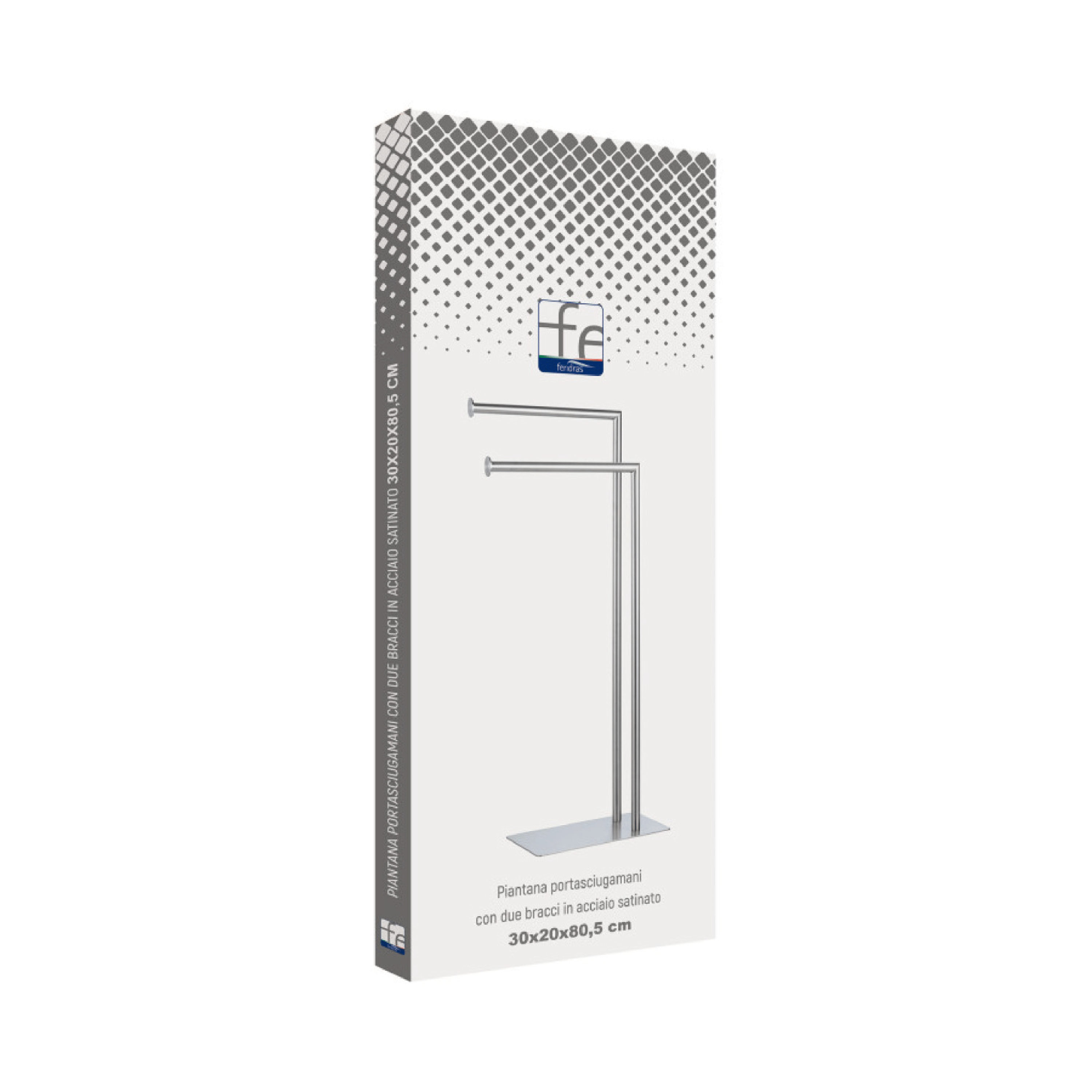 Questa piantana portasciugamani con due bracci è realizzata in acciaio satinato ed è pensata per offrire una soluzione pratica ed elegante all’organizzazione del bagno. Il design essenziale e moderno si integra facilmente in ambienti di diverso stile, garantendo funzionalità senza rinunciare all’estetica. I due bracci permettono di appoggiare comodamente asciugamani e teli, favorendo ordine e praticità nell’uso quotidiano. La struttura è solida e stabile, grazie alla base con dimensione di 30 cm, mentre la profondità di 17 cm consente un ingombro contenuto. Con un’altezza di 80 cm, la piantana risulta ben proporzionata e funzionale, rappresentando una soluzione resistente e raffinata per mantenere il bagno sempre ordinato.
