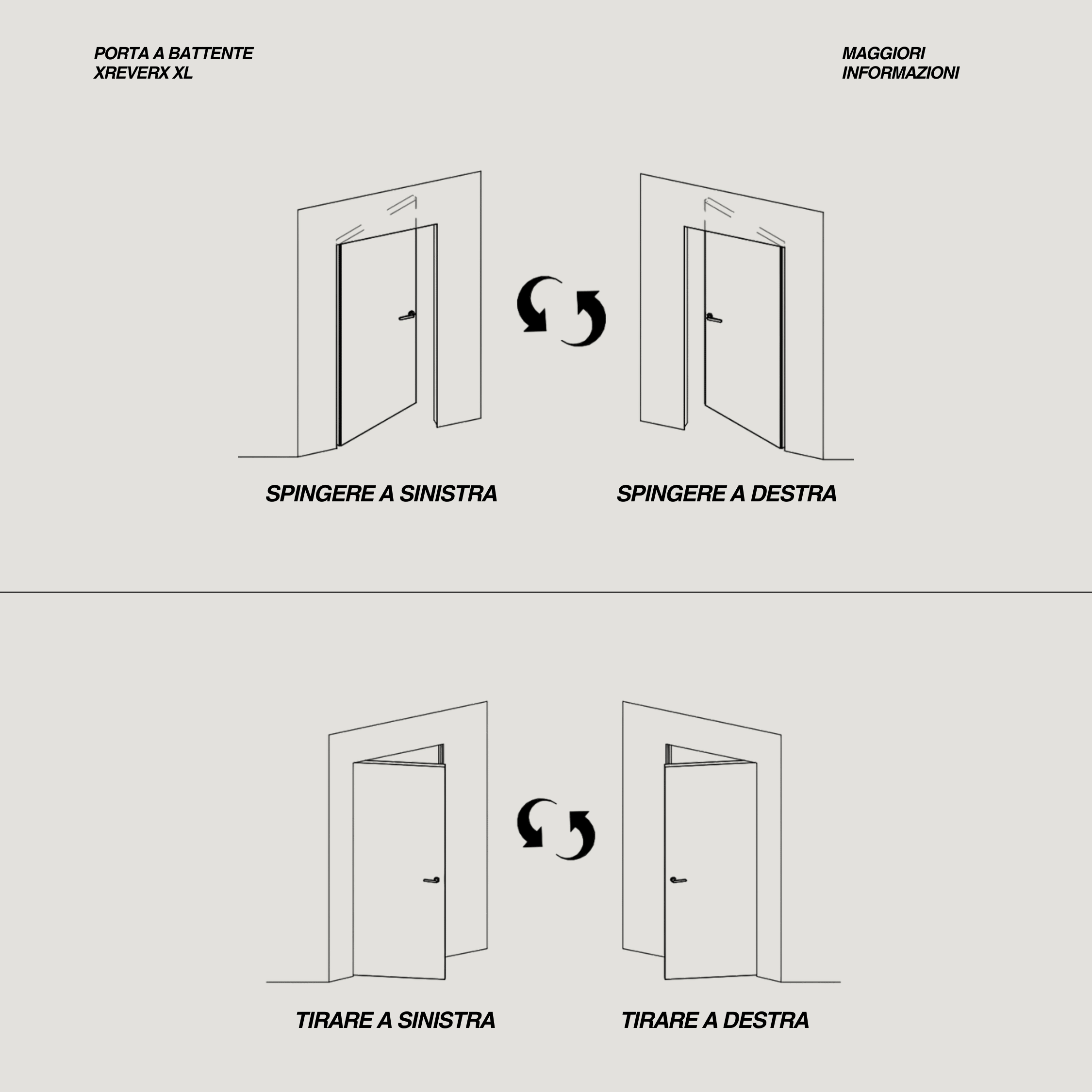 La porta filo muro xREVERx XL è stata progettata per offrire la massima versatilità in fase di installazione: grazie alla sua reversibilità, può essere montata con apertura a spingere o a tirare, sia a destra che a sinistra, garantendo una libertà totale di posa e adattandosi a qualsiasi esigenza progettuale. Il suo design essenziale e moderno le consente di integrarsi perfettamente alla parete, diventando quasi invisibile e valorizzando l’estetica pulita e lineare degli spazi interni, sia in contesti residenziali che commerciali. La superficie grezza è pensata per essere personalizzata, permettendo di scegliere tra verniciatura o rivestimento con carta da parati, così da armonizzarsi con qualsiasi stile d’arredo e rendere ogni ambiente unico. Realizzata con materiali resistenti e di alta qualità, la porta assicura robustezza, stabilità e una durata nel tempo che ne fanno un investimento affidabile. La reversibilità dell’anta, inoltre, rende il montaggio semplice e veloce, adattabile anche a situazioni di ristrutturazione, dove la flessibilità diventa un valore aggiunto. In questo modo, xREVERx XL unisce eleganza, funzionalità e praticità, confermandosi come una soluzione ideale per chi cerca un prodotto capace di coniugare estetica contemporanea e prestazioni durature. La maniglia non è inclusa nella scatola, acquistabile separatamente dal nostro sito
