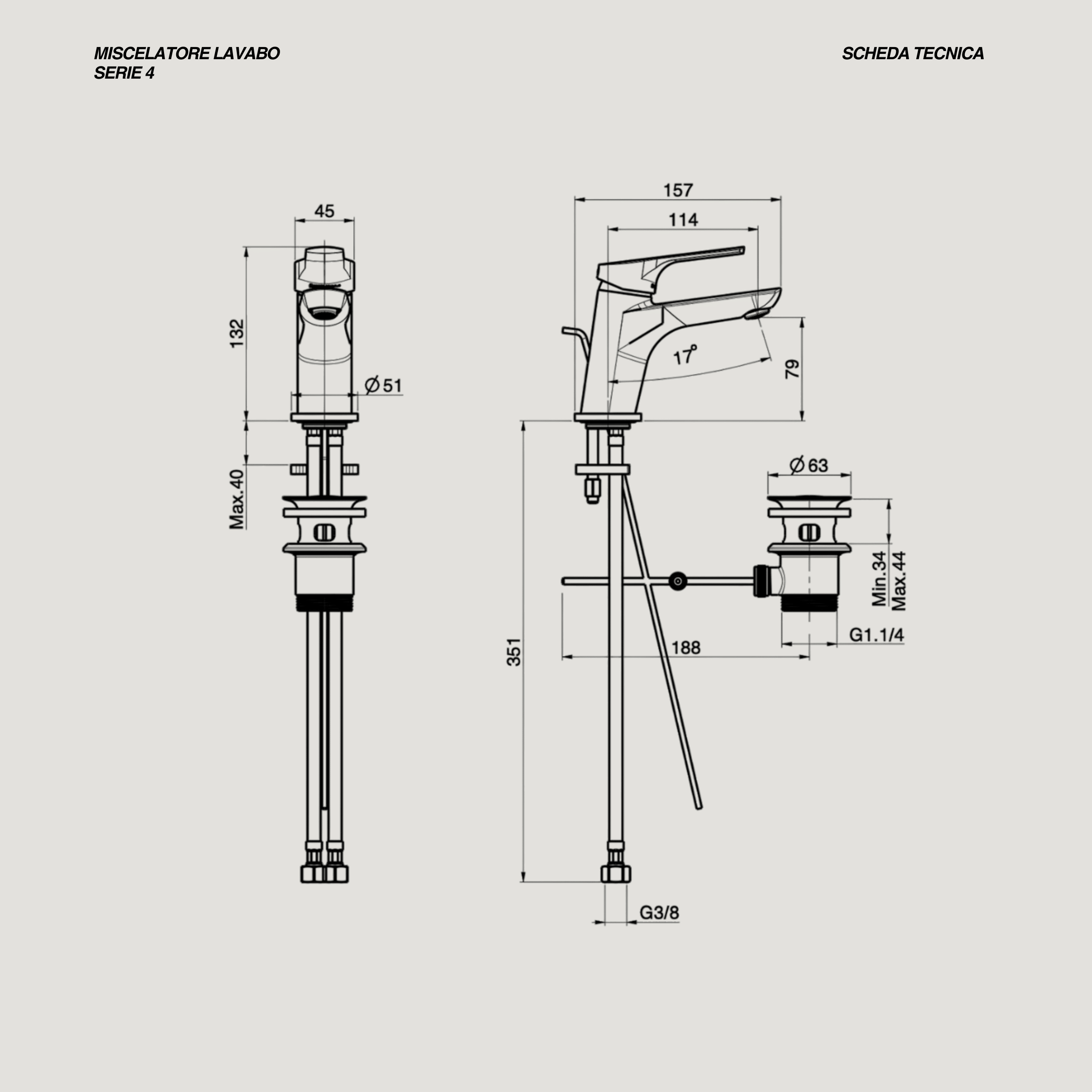 • Misure interne lavabo: L 44 x H 12,5 x P 27 (cm)