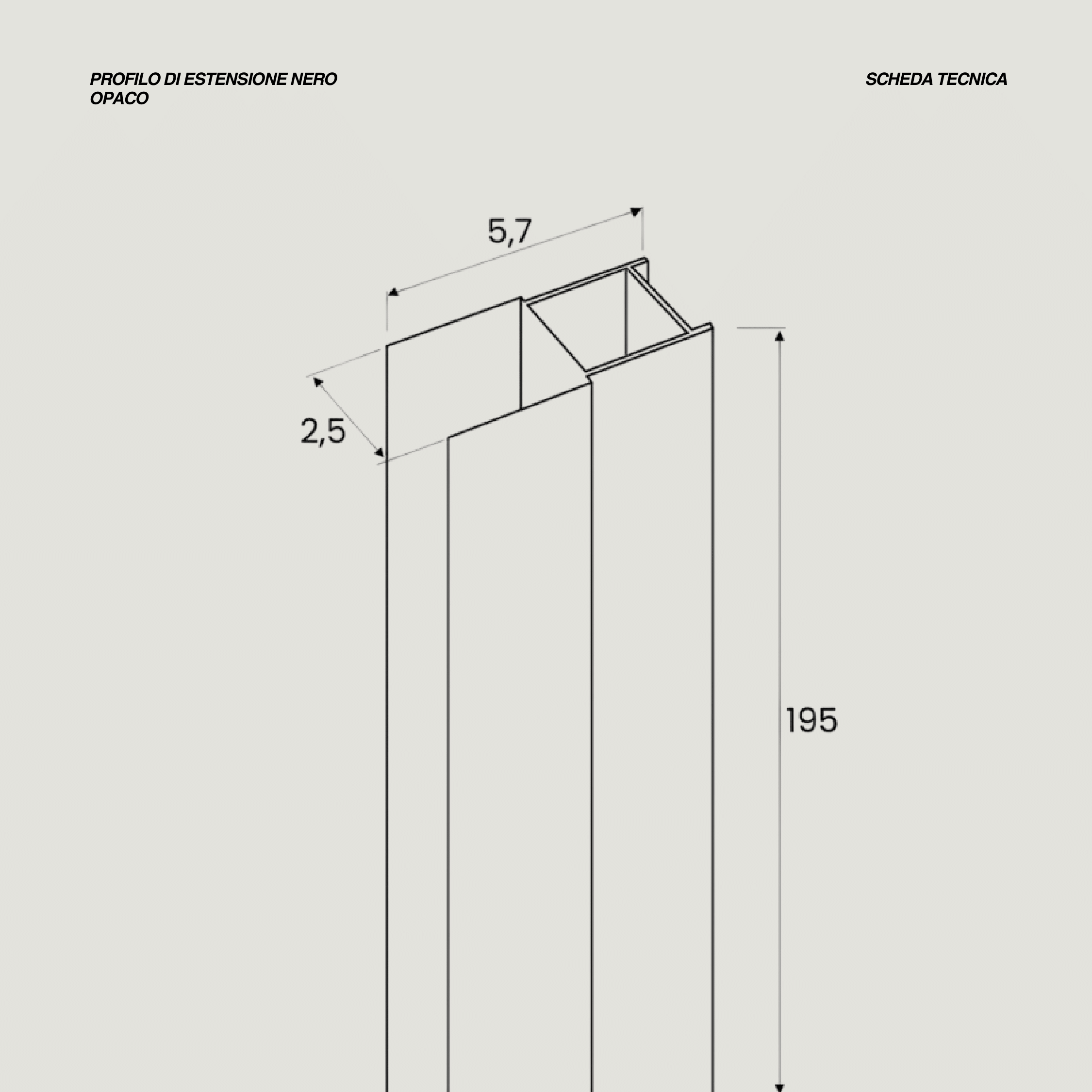 Il profilo di estensione della serie Royal è studiato per garantire un montaggio impeccabile e una perfetta adattabilità del box doccia. Con una dimensione di 5,7x2,5 cm e un’altezza pari a quella del box, ovvero 195 cm, questo accessorio consente di gestire con precisione eventuali differenze di misura o necessità di regolazione in fase di installazione. La sua funzione è quella di offrire una soluzione pratica e discreta, mantenendo al tempo stesso un design pulito e lineare che si integra armoniosamente con lo stile elegante del box doccia.Grazie alla finitura coerente con la serie Royal, il profilo di estensione non solo assicura funzionalità, ma contribuisce anche a preservare l’estetica complessiva, rendendo l’intero sistema equilibrato e raffinato. È l’elemento tecnico che completa il progetto, trasformando un dettaglio di montaggio in un valore aggiunto di precisione e qualità.