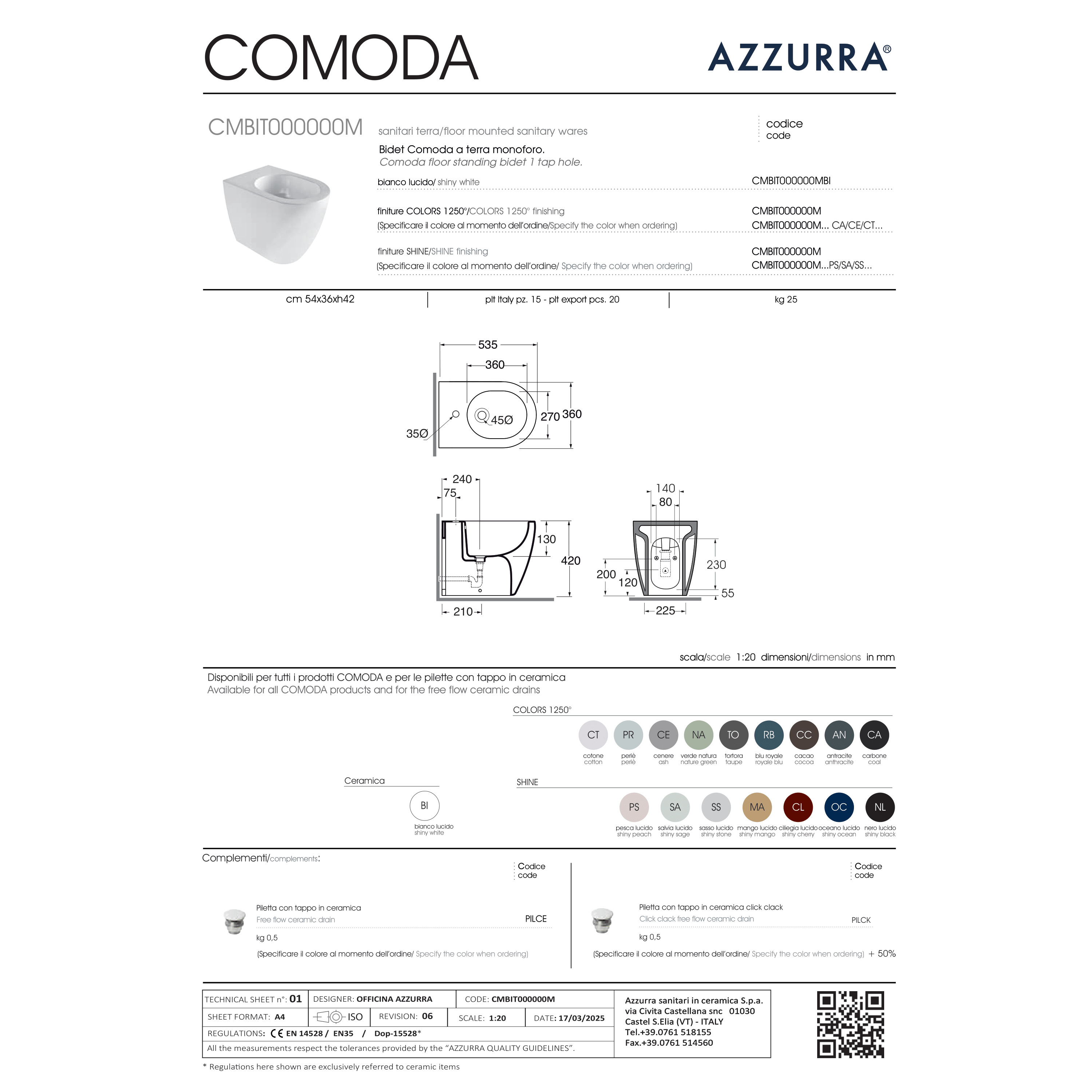 Coppia Di Sanitari a Terra Senza Brida Azzurra Ceramica "Comoda" Bianco Lucido