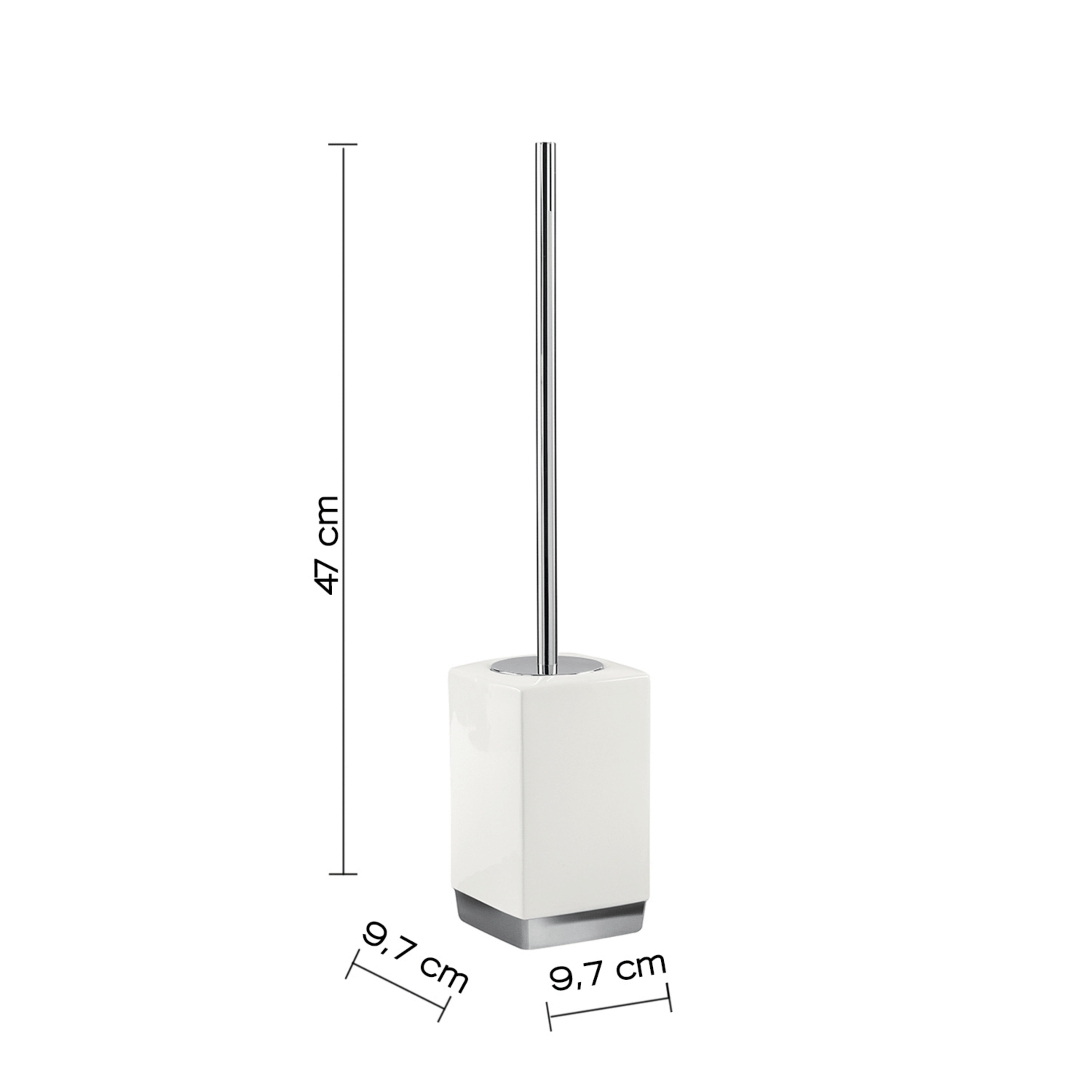 Questo portascopino a terra è realizzato in ceramica di alta qualità con una finitura bianca elegante e luminosa, abbinata a un ciuffo in setole pensato per garantire una pulizia efficace e pratica. Le dimensioni di 9,7 cm di lunghezza e profondità e un’altezza di 47 cm lo rendono stabile e funzionale, senza risultare ingombrante, mentre il design lineare e minimalista permette di integrarlo armoniosamente in qualsiasi bagno, dal moderno al classico. La ceramica resistente e la finitura liscia ne facilitano la pulizia quotidiana e ne assicurano durata nel tempo, trasformando un accessorio essenziale in un oggetto raffinato e discreto che contribuisce a mantenere ordine ed eleganza nell’ambiente bagno.