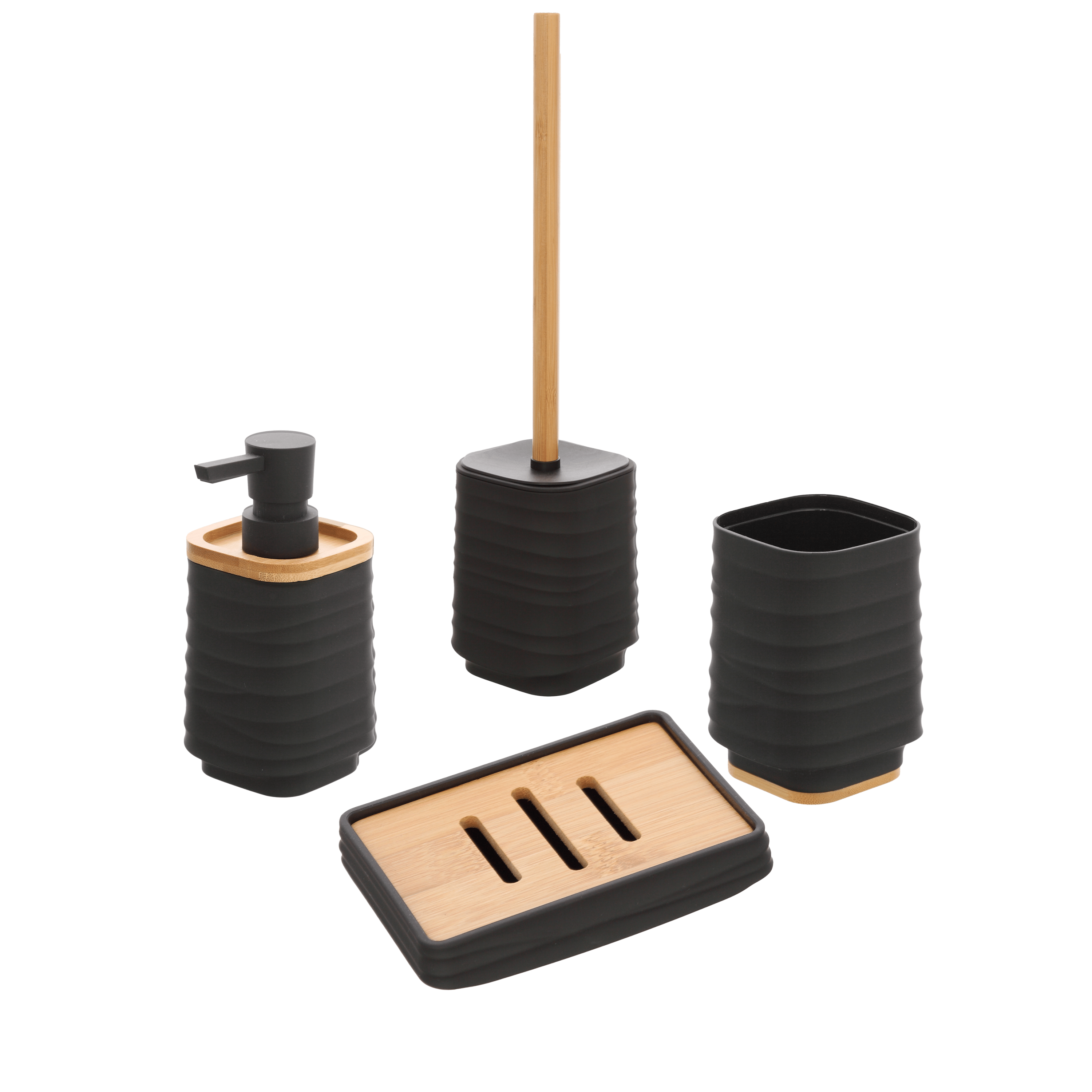 Il set di accessori è composto da quattro pezzi coordinati ed è pensato per offrire una soluzione completa e funzionale per l’organizzazione del bagno. Il set include un dispenser per il sapone, un portaspazzolino, un portasapone e un portascopino, elementi essenziali per mantenere ordine e praticità nella zona lavabo e WC. Tutti gli accessori sono realizzati in plastica con finitura nera, una scelta che dona un aspetto pulito e luminoso e permette un facile abbinamento con qualsiasi stile di arredo bagno. La plastica garantisce leggerezza, resistenza e facilità di pulizia, rendendo il set ideale per l’uso quotidiano. Nel complesso, questo set rappresenta una soluzione semplice e versatile per arredare il bagno in modo ordinato ed essenziale.