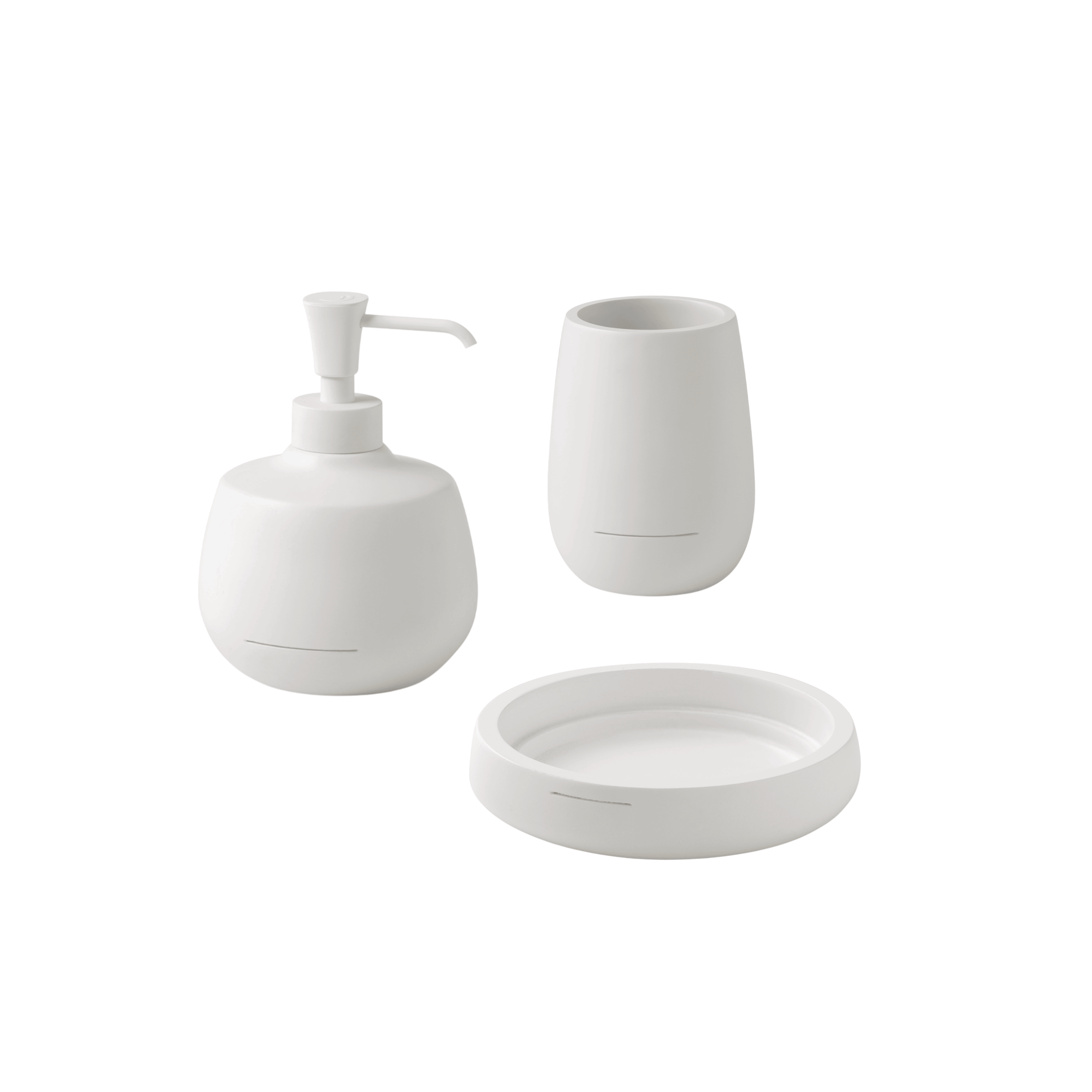 Set da 3 accessori d’appoggio realizzato in resina con finitura bianco opaco. Un insieme essenziale e raffinato, pensato per completare l’arredo bagno con stile, praticità e un’estetica pulita e contemporanea.