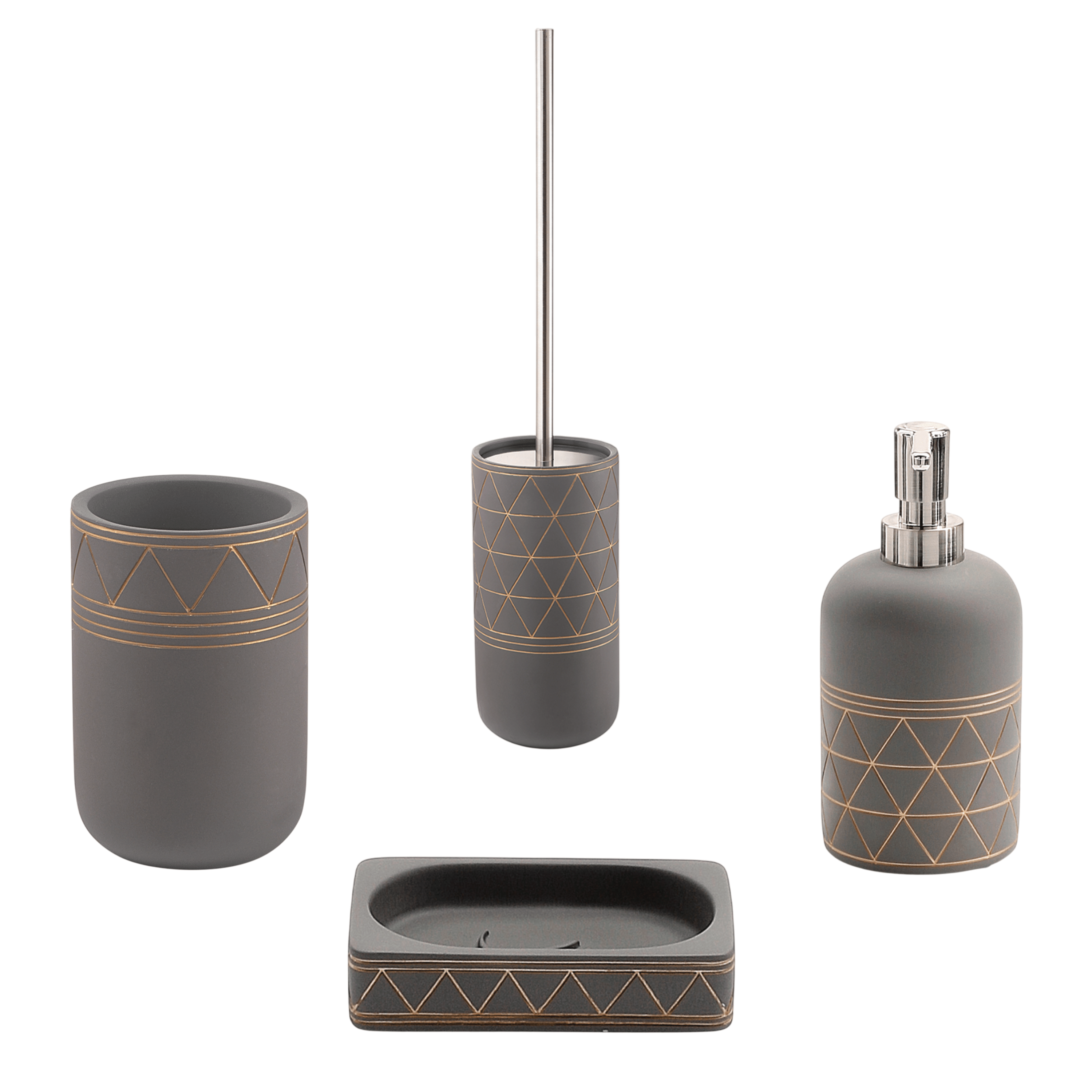 Set di accessori d’appoggio dal design moderno e dal gusto naturale, pensato per mantenere il piano del bagno funzionale e ordinato. Il set si presenta in elegante colore grigio, impreziosito da raffinate decorazioni incise in finitura rame, per un tocco di stile distintivo e contemporaneo.