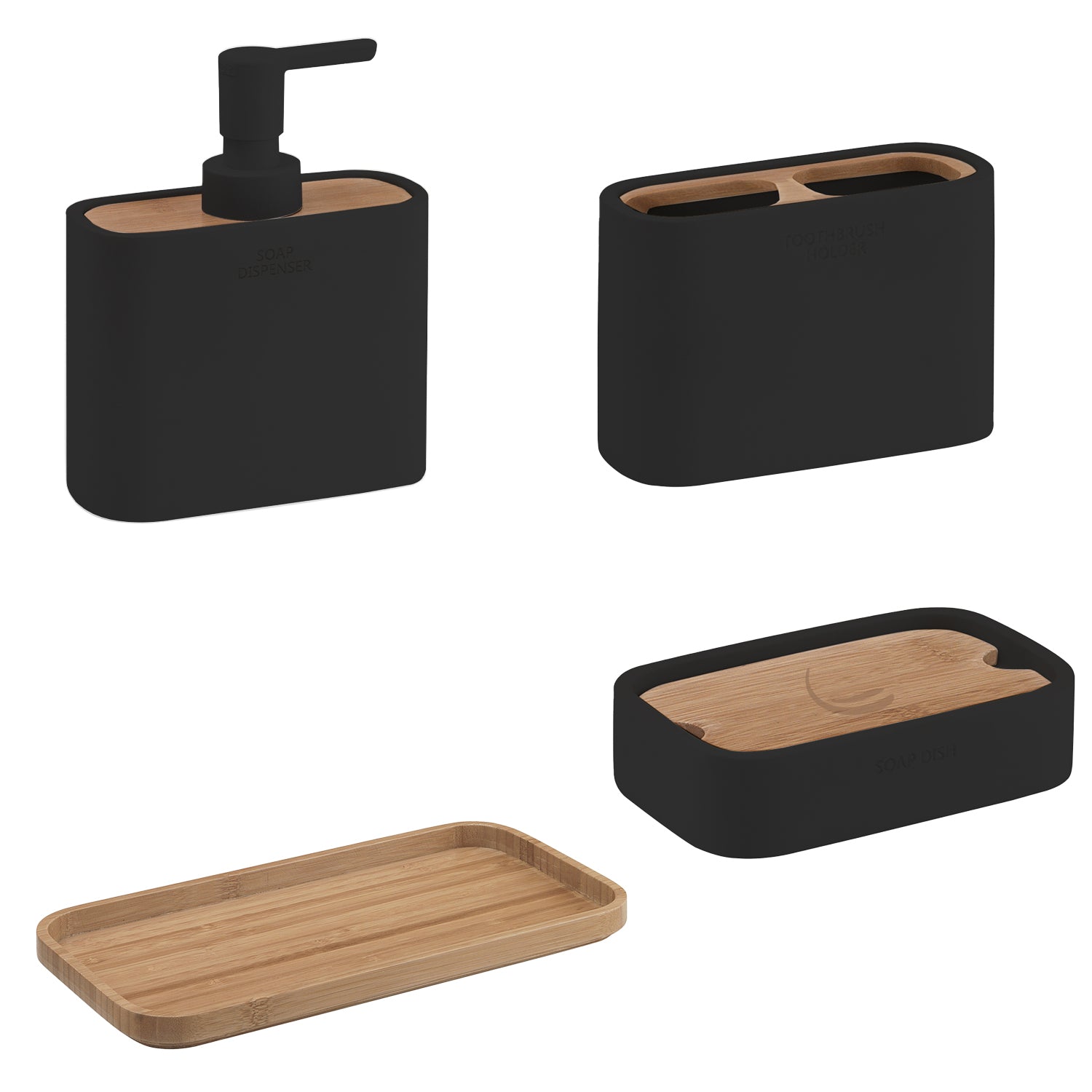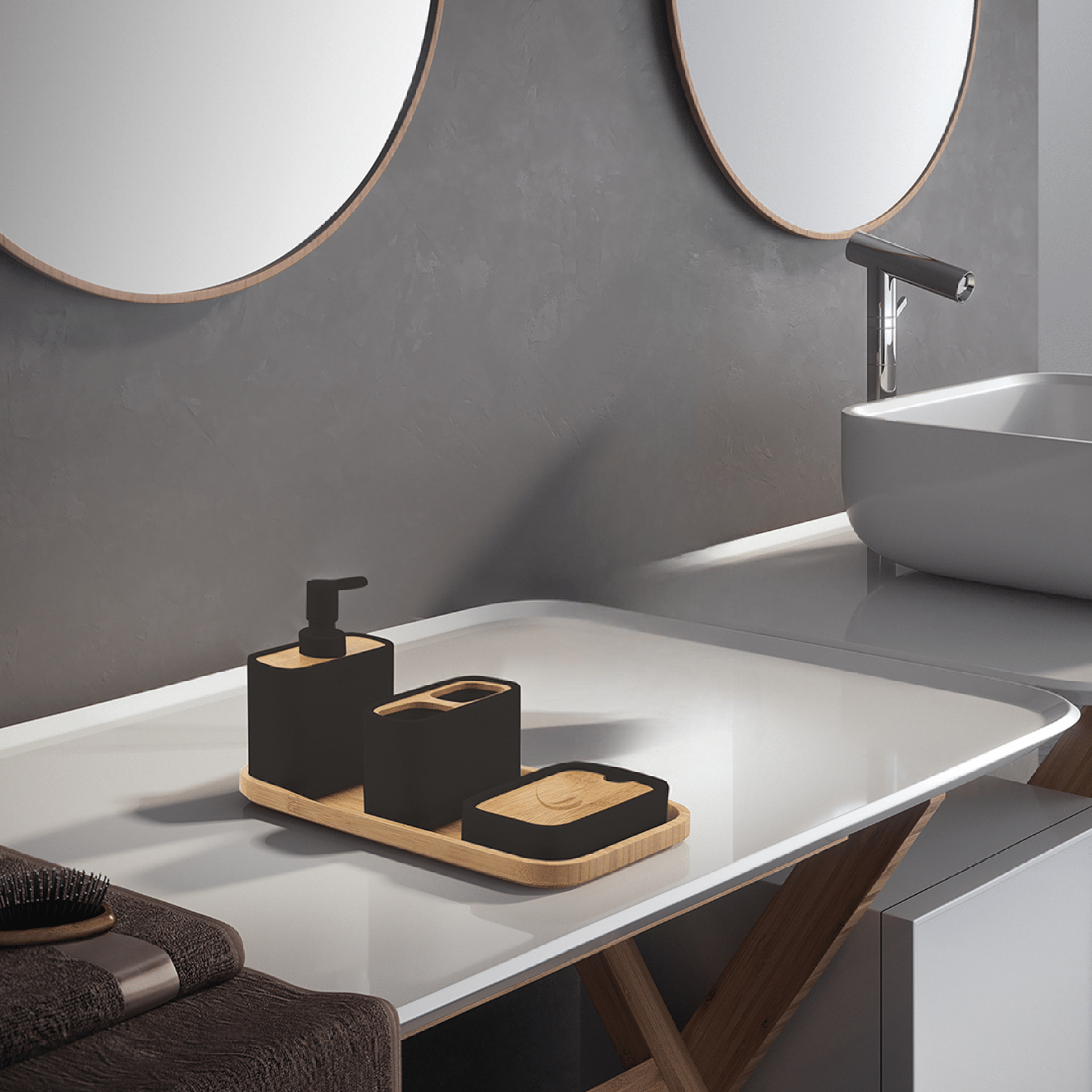 Il set d’accessori d’appoggio in resina e bambù unisce naturalezza e modernità, trasformando gli elementi quotidiani del bagno in dettagli di design armoniosi e funzionali. La resina, resistente e facile da pulire, dialoga con il calore del bambù creando un equilibrio estetico raffinato, ideale per ambienti contemporanei o d’ispirazione naturale.Il set è composto da un dosasapone con pompetta in plastica, una portasaponetta, un portaspazzolini e un vassoio portaoggetti coordinato, pensato per mantenere ordine e stile sul piano d’appoggio. Ogni elemento è progettato per offrire praticità nell’uso quotidiano, garantendo al tempo stesso un’estetica pulita e accogliente.Un insieme completo e versatile, perfetto per valorizzare l’ambiente bagno con un tocco di equilibrio e semplicità.Nel set non è incluso il portascopino, ma potete acquistarlo separatamente dal nostro sito,trova il link nelle caratteristiche tecniche.
