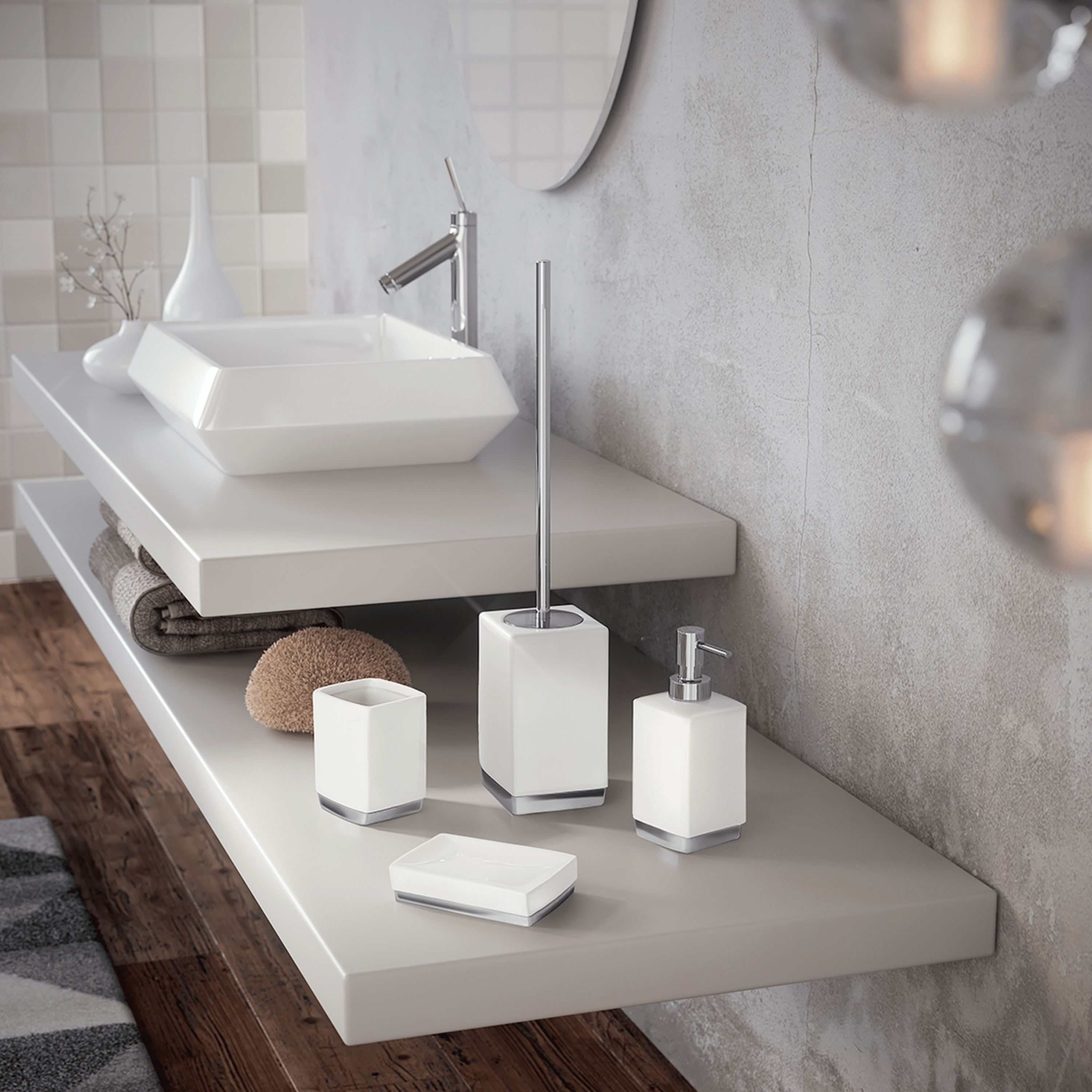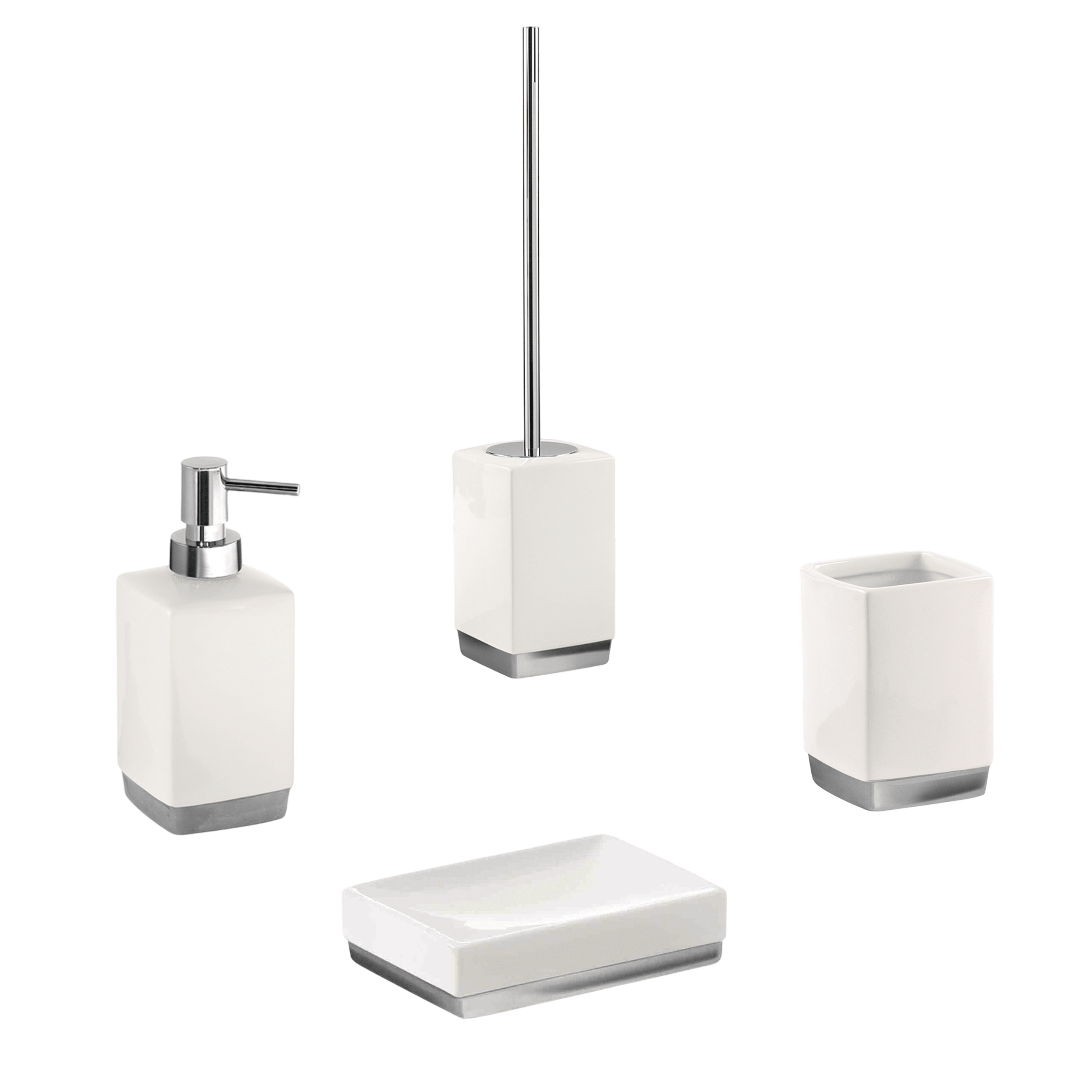 Set da 4 accessori d’appoggio realizzati interamente in ceramica con finitura bianco. Una soluzione essenziale e raffinata, pensata per completare l’arredo bagno con ordine, praticità e uno stile pulito e contemporaneo.