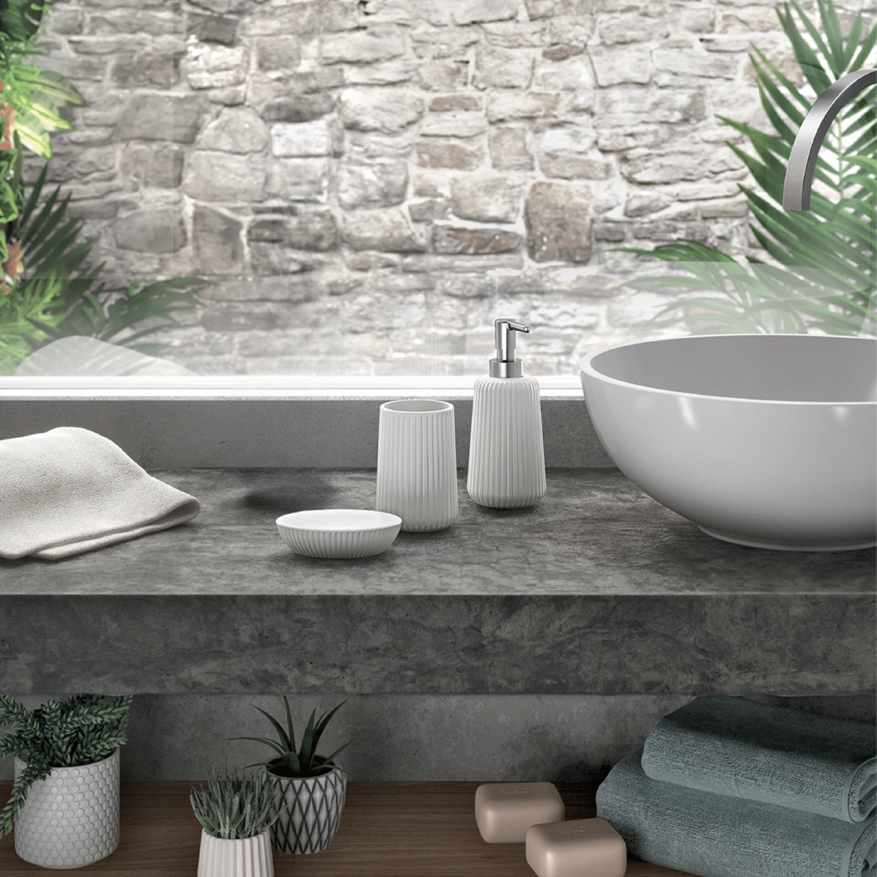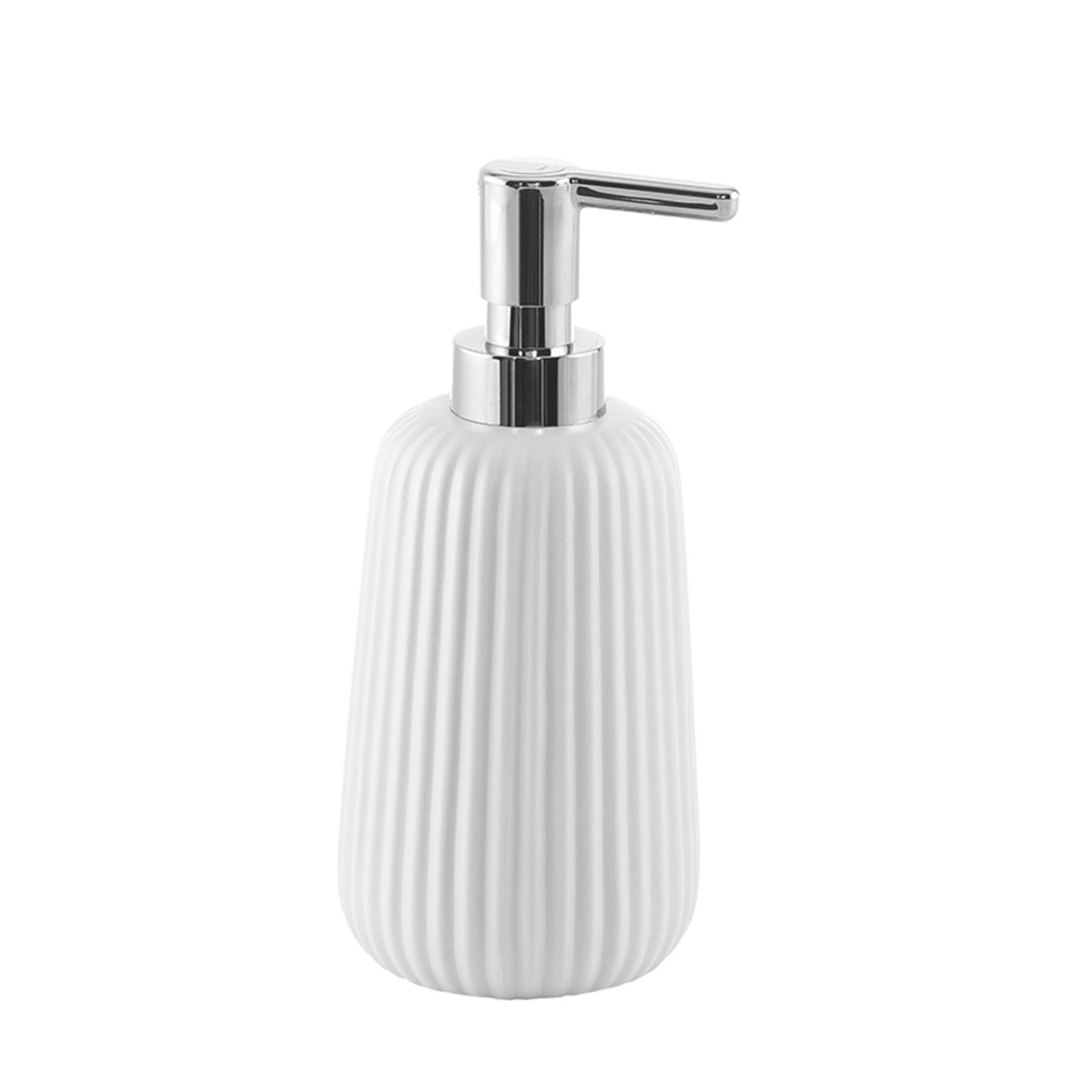 Set di accessori d’appoggio per il bagno, pensato per completare l’ambiente con un gusto moderno e naturale, mantenendo il piano funzionale e ordinato. Il set si presenta in elegante finitura bianca, mentre il dosasapone è dotato di un erogatore in plastica con raffinata finitura cromata, per un tocco di stile e praticità.