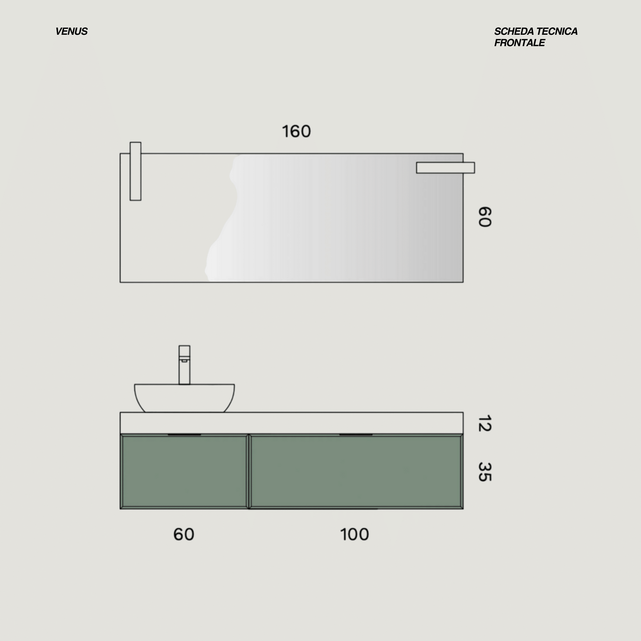 Composizione bagno dal design contemporaneo, caratterizzata da linee essenziali e materiali di alta qualità. La configurazione proposta ha una larghezza totale di 160 cm, ottenuta dalla combinazione di due moduli con cassetti da 60 cm e 100 cm, offrendo un equilibrio armonioso tra estetica e funzionalità.Il colore proposto in foto, verde salvia, può essere sostituito con una delle finiture presenti nella cartella colori, consentendo la massima personalizzazione. Il top di copertura, anch’esso di 160 cm in finitura bianco opaco con spessore 12 cm, è modificabile a livello di colore, spessore e dimensione, in base alla configurazione scelta.Il lavabo d’appoggio, realizzato in finitura bianco Calacatta, presenta una forma ovale elegante e misura 46x34xH13 cm. È possibile sostituirlo con altri modelli, variando forma, materiale o tonalità, secondo le preferenze dell’acquirente.A completare la composizione troviamo uno specchio di 160x60 cm, dal design pulito e minimale, corredato da due lampade LED con montaggio reversibile (dimensioni L 30 x H 4 x P 2 cm). Anche la scelta dello specchio è personalizzabile, per adattarsi perfettamente allo stile, alle esigenze e agli spazi del cliente.