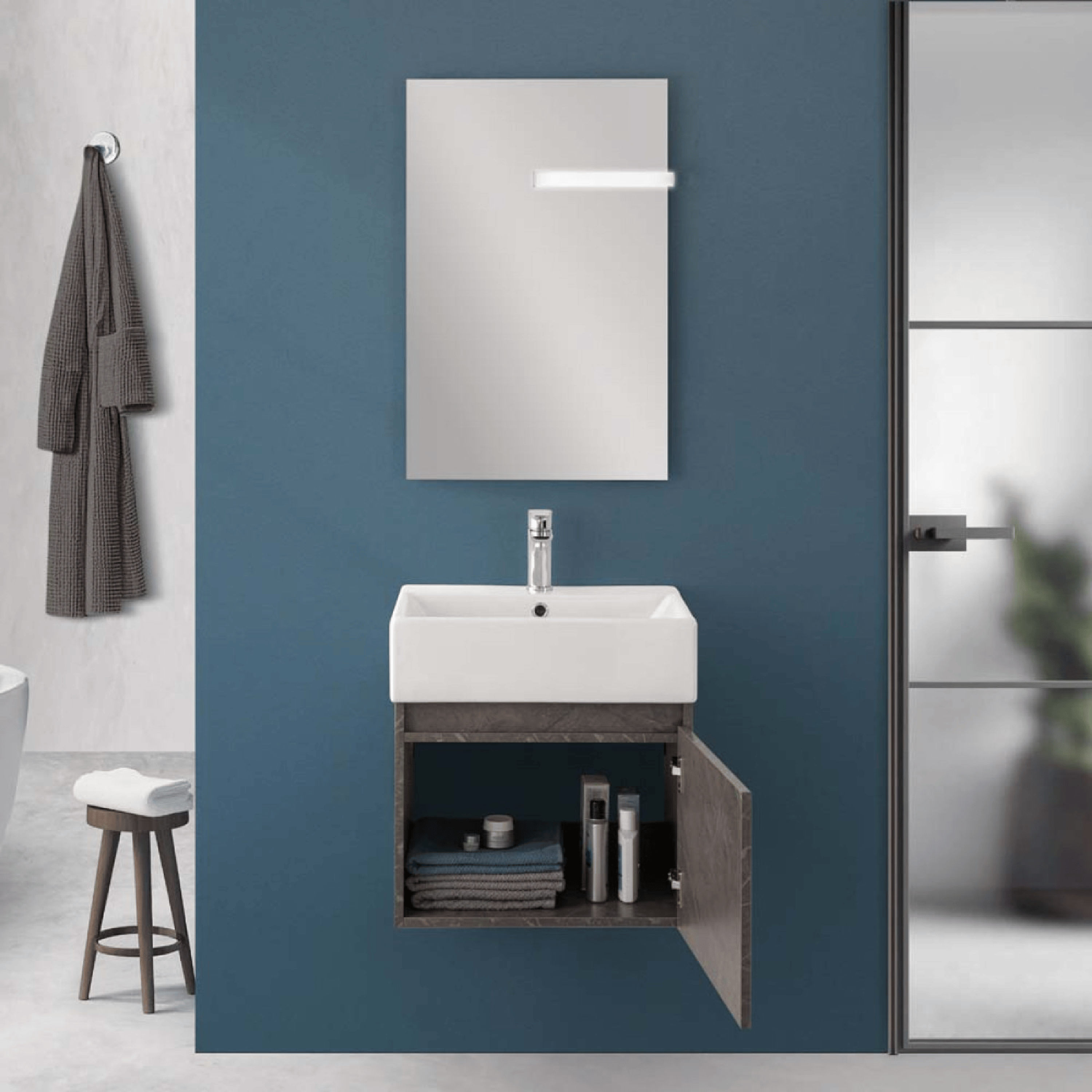 Mobile Bagno Sospeso 50 Cm Un'Anta Specchio Filo Lucido 50x60 Cm Feridras "Kira" Pietra