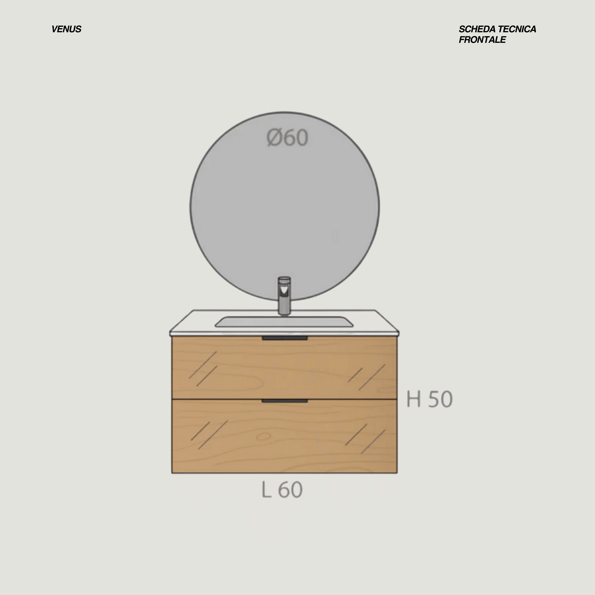 Mobile Bagno Sospeso 60 Cm Due Cassetti Specchio Retroilluminato Tondo Diam.60 Cm ItalBagno "Venus 101" Quercia