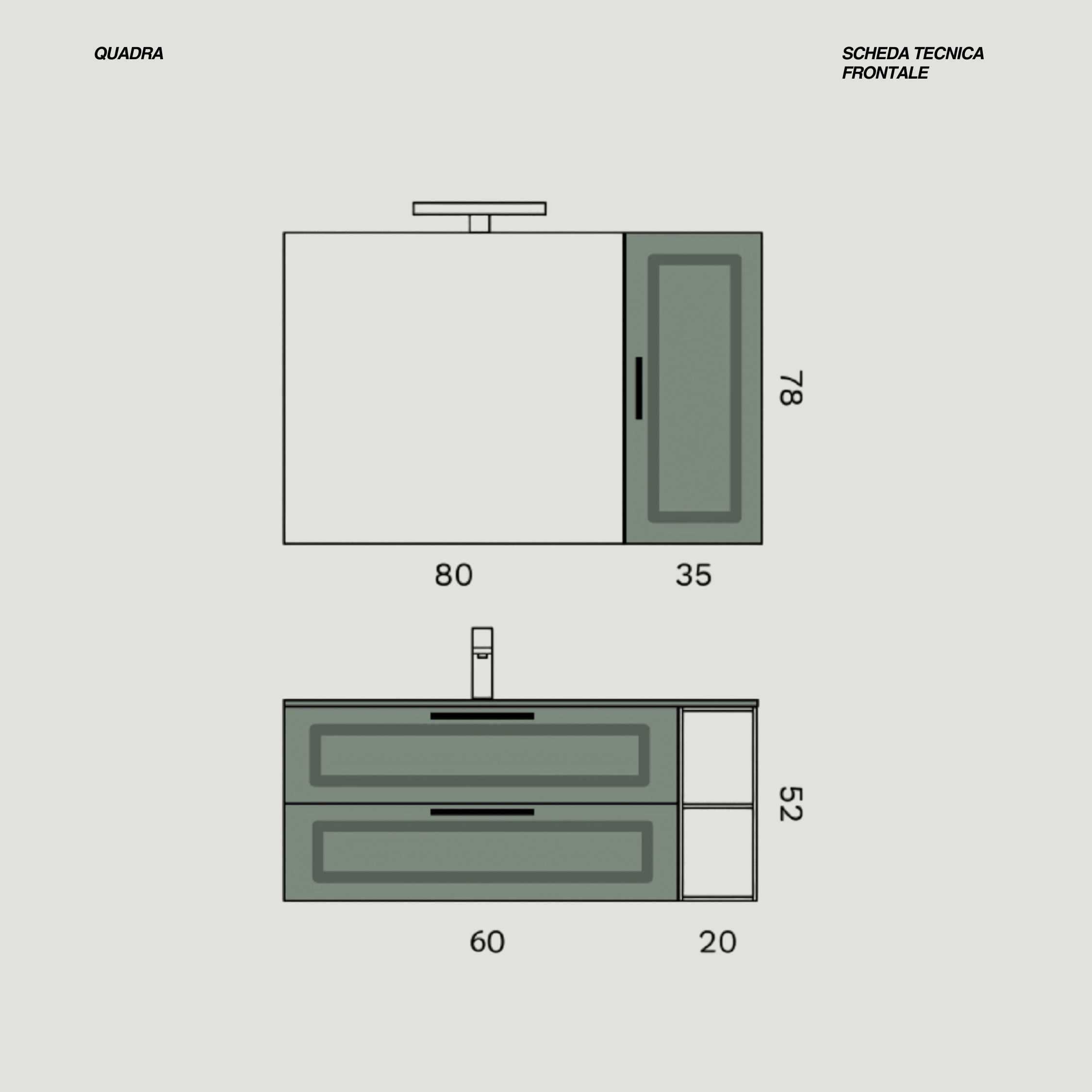 La composizione proposta si sviluppa su una lunghezza totale di 80 cm ed è caratterizzata da una base composta da due cassetti da 60 cm e un elemento a giorno da 20 cm, soluzione che coniuga capacità contenitiva e leggerezza visiva. Il lavabo, in ceramica bianco lucido con vasca posizionata a sinistra, misura L 81 x P 46 x H 1,6 cm e si integra perfettamente con la base, offrendo funzionalità e pulizia formale. A completare l’allestimento, uno specchio da 80x78 cm con lampada LED superiore inclusa garantisce un’illuminazione uniforme e pratica, mentre il pensile coordinato nella stessa finitura della base, dotato di mensola interna, aggiunge ulteriore spazio utile mantenendo coerenza estetica e armonia compositiva.