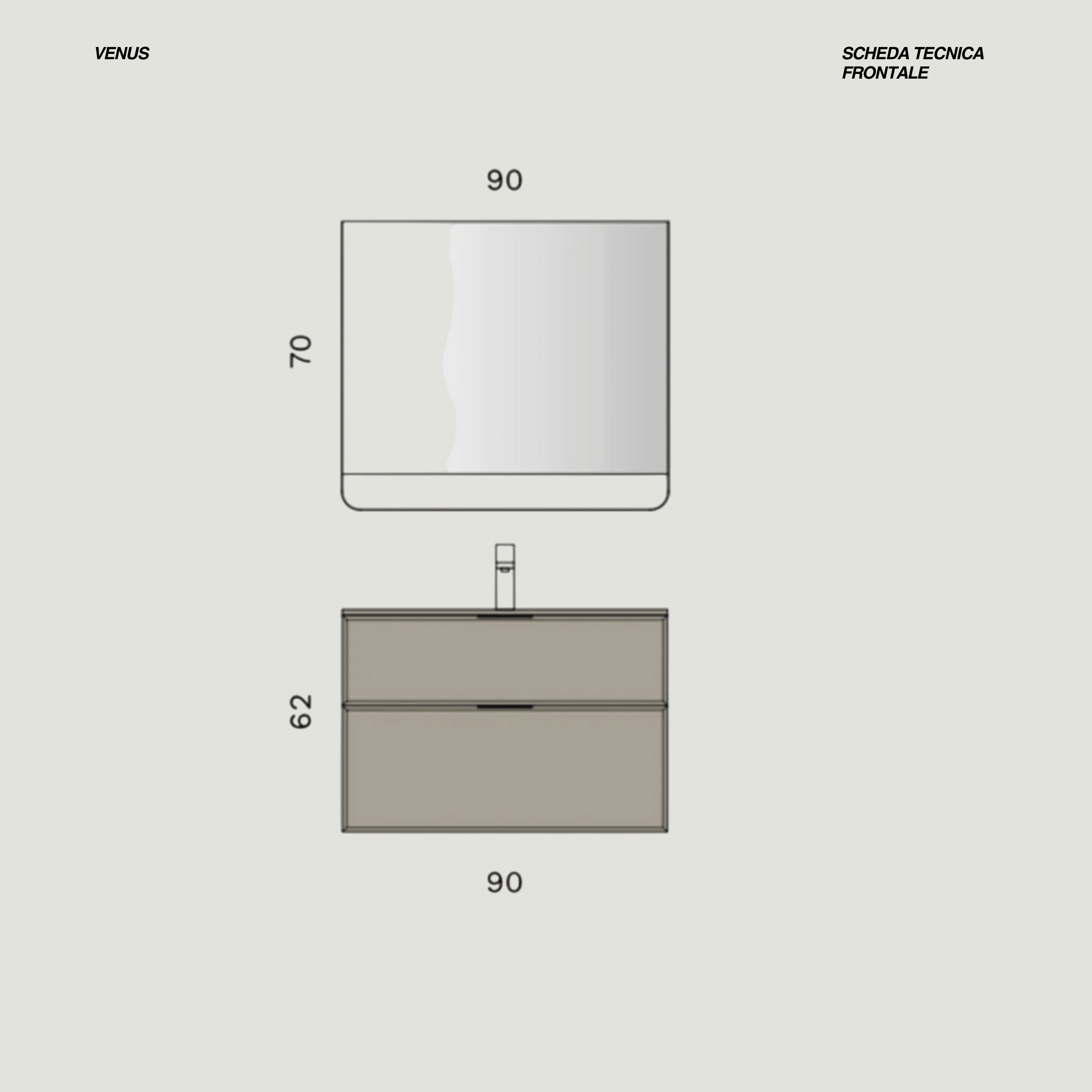 Il mobile bagno sospeso si caratterizza per una struttura compatta e originale, composta da una base larga 90 cm con altezze sfalsate: la parte superiore misura 25 cm, mentre quella inferiore 35 cm, per un’altezza totale di 60 cm. La finitura tortora dona all’insieme un tono sobrio e contemporaneo, perfetto per ambienti eleganti e funzionali. Il lavabo incassato sulla base è realizzato in ceramica bianco lucido, con dimensioni di 91 cm in larghezza e 46,5 cm in profondità, e presenta una vasca centrale che garantisce praticità e simmetria visiva. A completare la composizione, lo specchio in metallo con mensola a LED in finitura nera, dalle dimensioni di 90x70 cm, aggiunge un dettaglio moderno e luminoso, valorizzando l’arredo con stile e funzionalità.