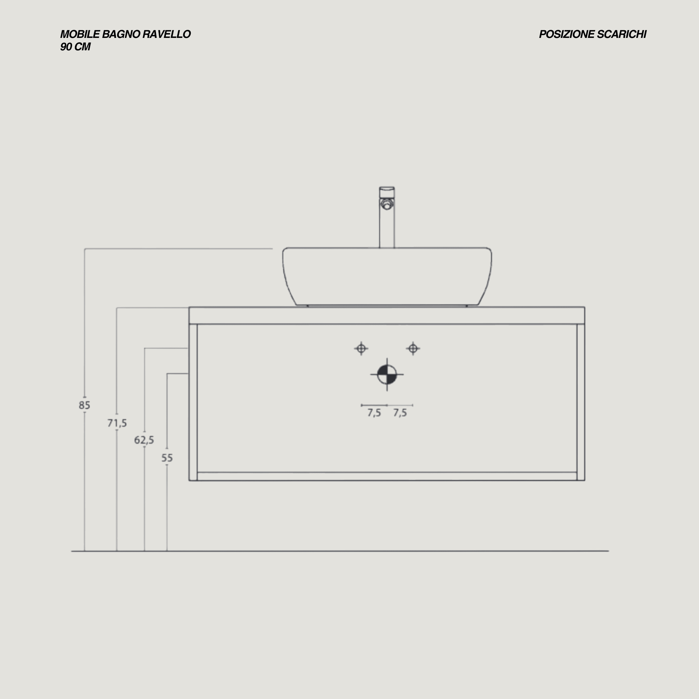 La composizione bagno sospesa della linea Ravello unisce materiali ricercati e un design contemporaneo, grazie alla struttura in MDF rivestito in PVC da 90 cm e alla cassa in finitura ardesia con spessore di 20 mm. Il top, anch’esso in finitura ardesia e spesso 40 mm, crea un contrasto elegante con il frontale in finitura noce canaletto da 20 mm, valorizzando l’effetto materico e la cura dei dettagli che caratterizzano la collezione.Il cassetto principale è dotato di chiusura soft‑close e maniglia a gola integrata, garantendo un’apertura fluida e un’estetica pulita. All’interno è presente un secondo cassetto, anch’esso con chiusura soft‑close e spessore di 20 mm, ideale per organizzare al meglio accessori e prodotti quotidiani. Il lavabo da appoggio in ceramica aggiunge un tocco di eleganza essenziale, mentre lo specchio tondo serigrafato su telaio, dal diametro di 80 cm, completa la composizione con un elemento luminoso e armonioso.Con dimensioni L90 × H40 × P46 cm, il mobile offre un equilibrio perfetto tra capienza e leggerezza visiva. Il lavabo misura 47,5 × 13,5 × 35 cm ed è privo di foro rubinetteria, lasciando libertà di scelta per un miscelatore da piano o a parete. La composizione non include la rubinetteria, permettendo di personalizzare l’allestimento secondo il proprio stile.