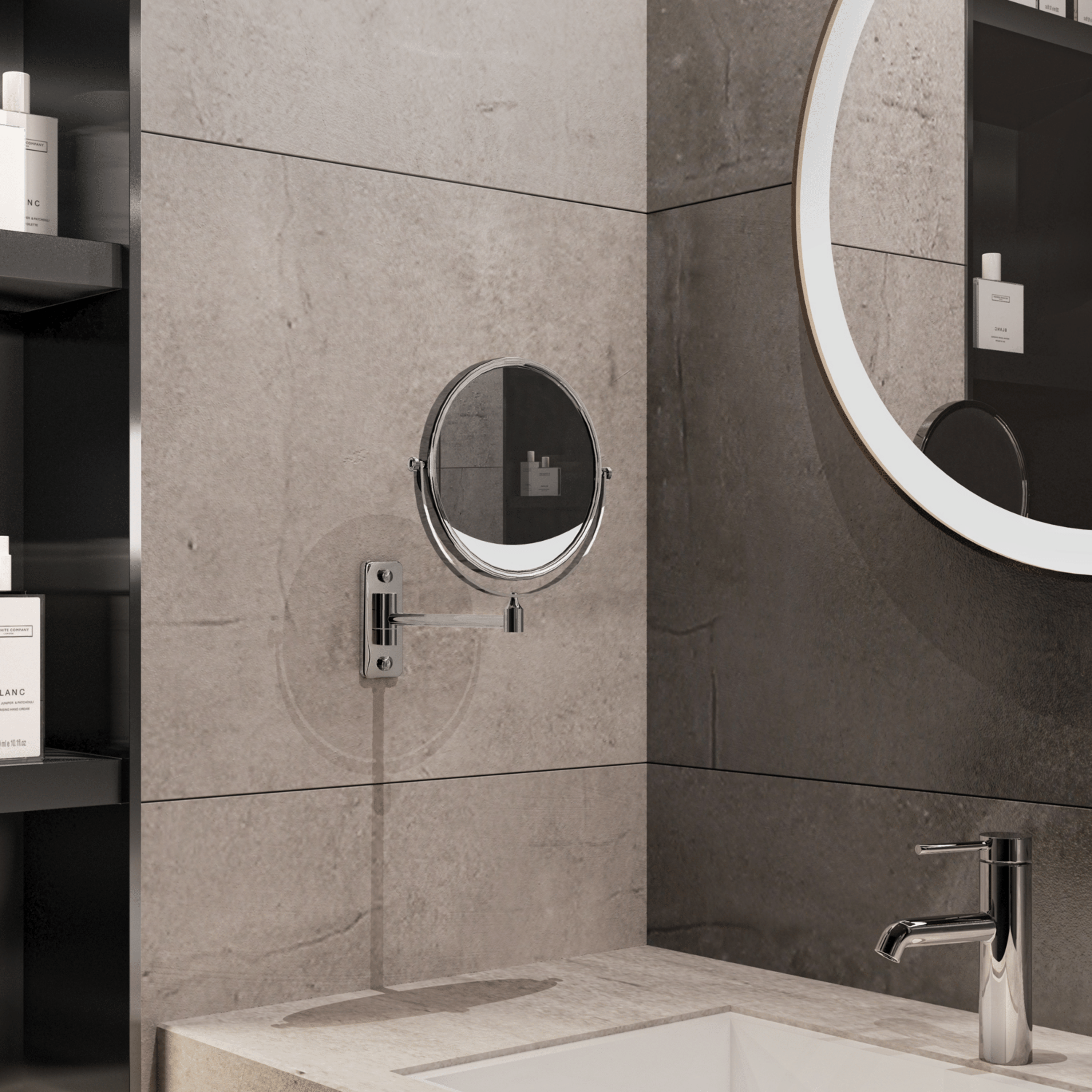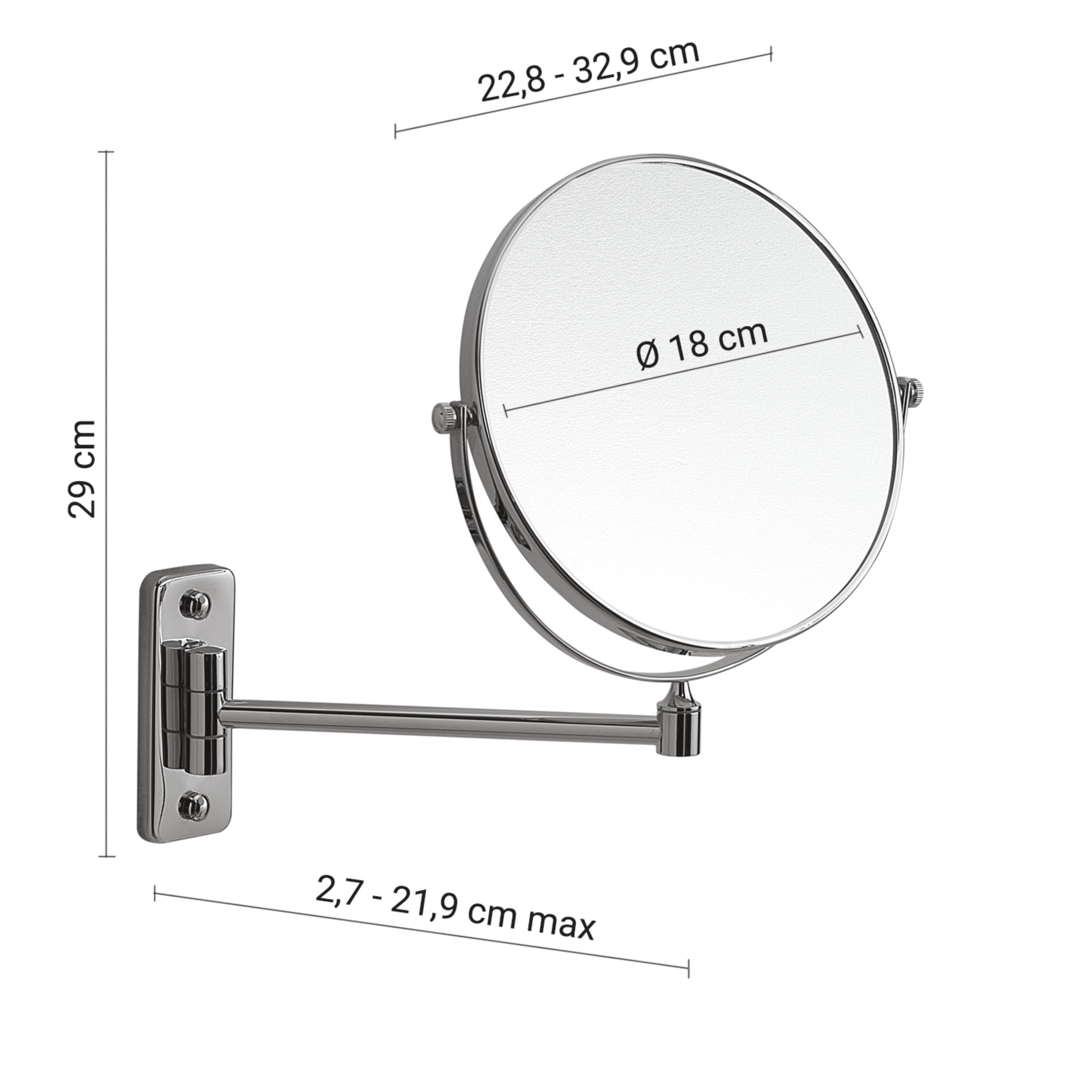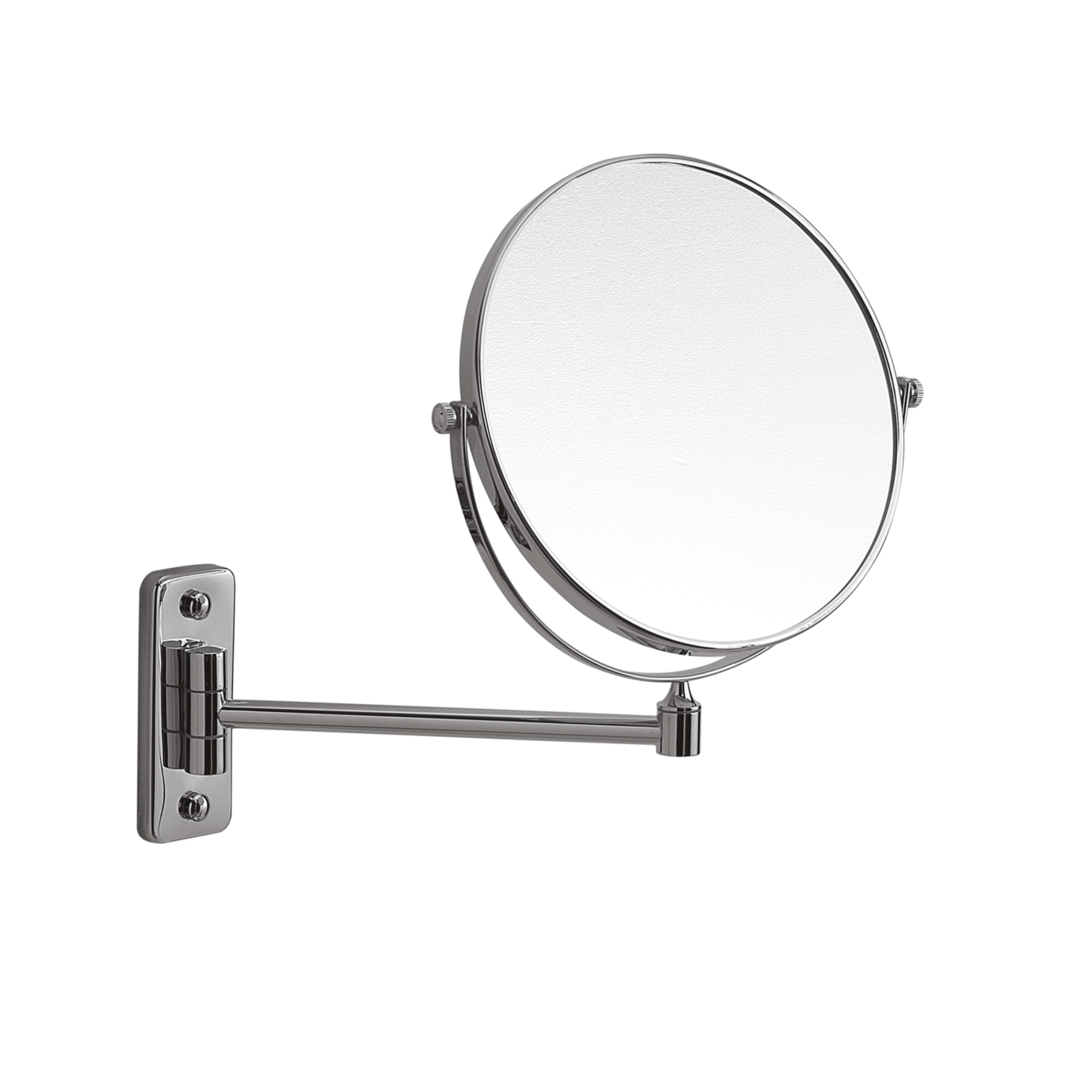 Specchio da parete bifacciale, dotato di un lato normale e di un lato con fattore di ingrandimento 3x, ideale per attività di precisione come trucco, rasatura e cura del viso. La struttura garantisce stabilità e facilità d’uso, offrendo una visione chiara e dettagliata grazie alla doppia superficie rotante.