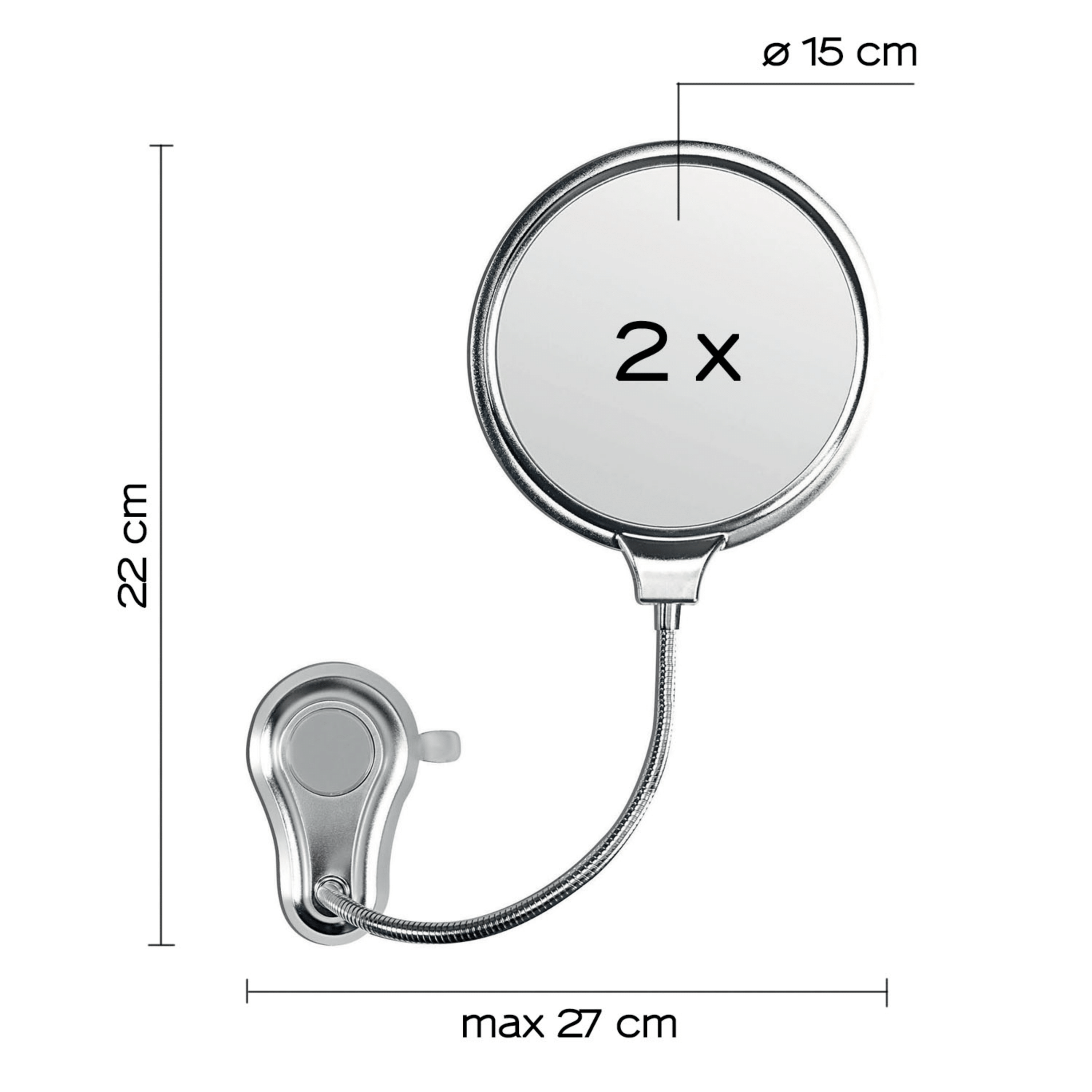 Specchio bifacciale da parete, dotato di un lato normale e di un lato con fattore di ingrandimento 2x, ideale per le routine quotidiane che richiedono maggiore precisione come trucco, rasatura e cura del viso.Lo specchio è orientabile, permettendo di regolare facilmente l’angolazione in base alle esigenze, e garantisce un utilizzo pratico e confortevole in qualsiasi ambiente bagno o zona beauty.