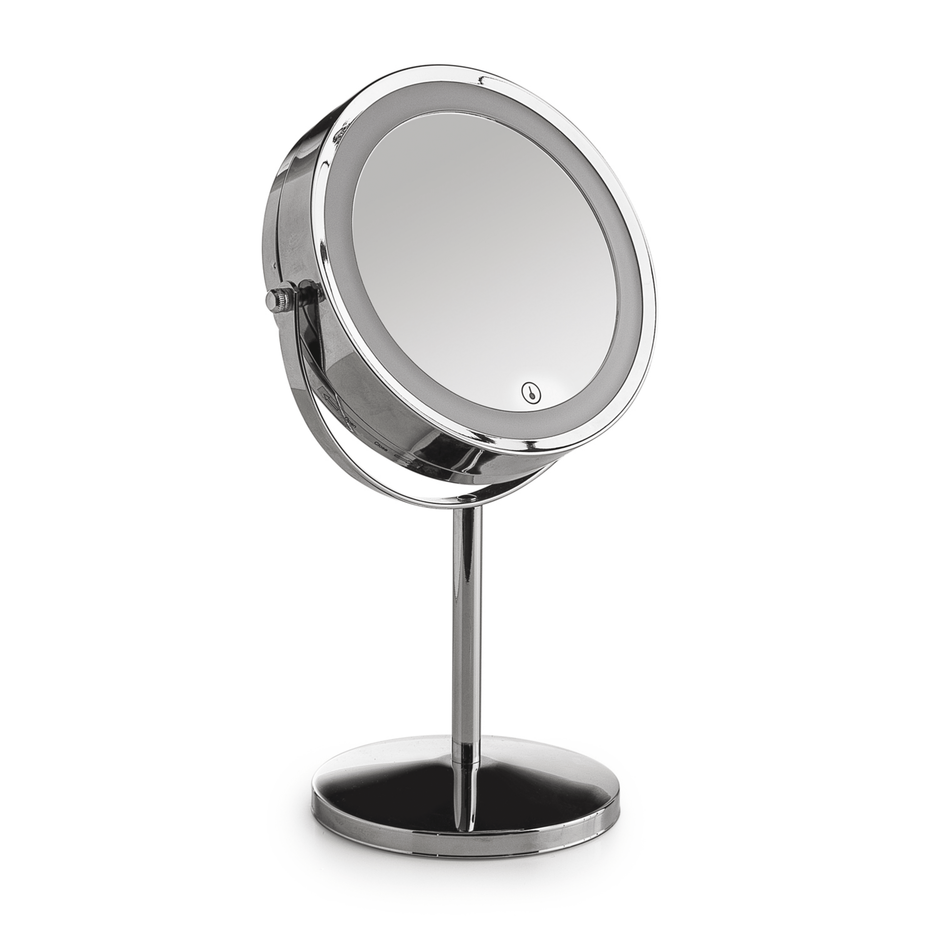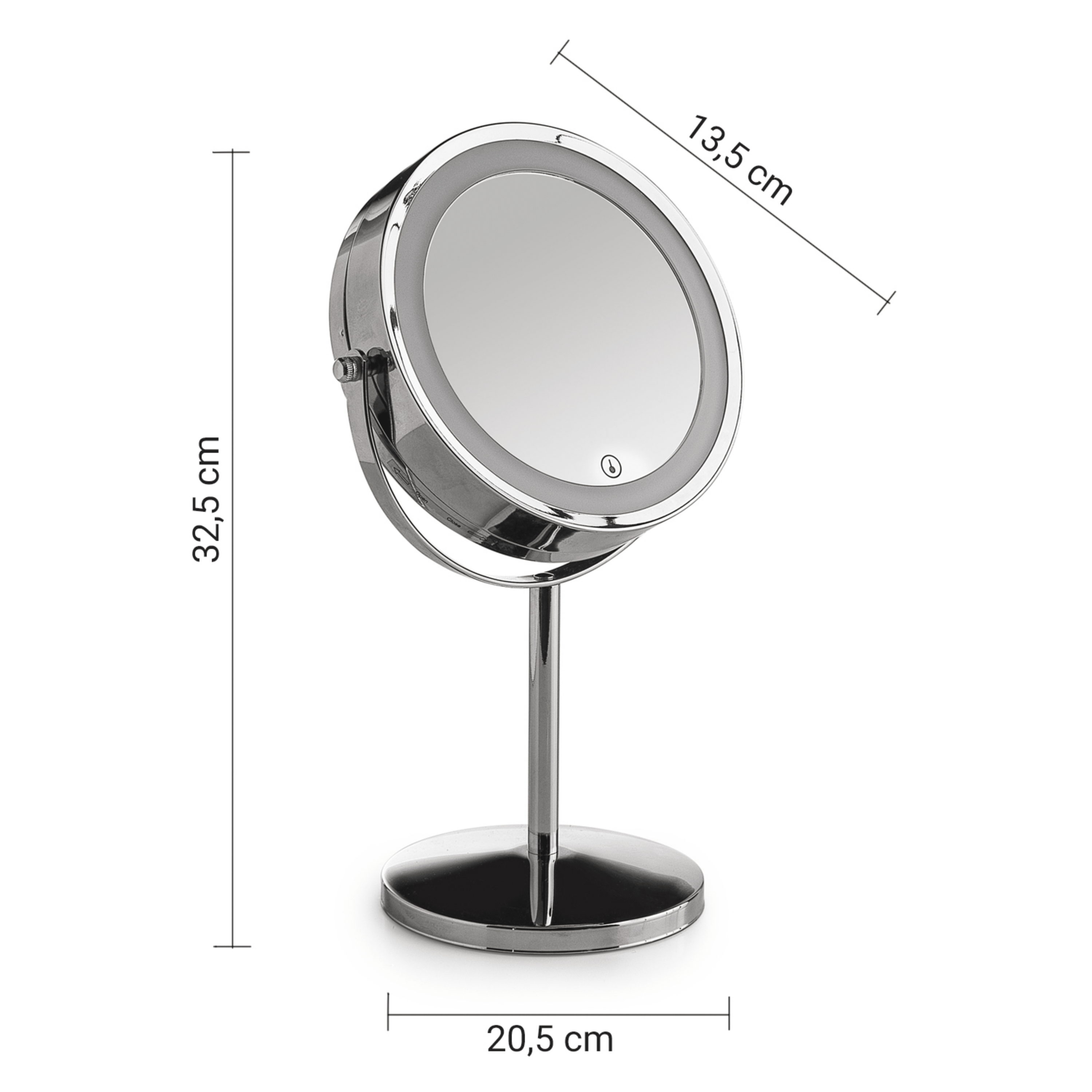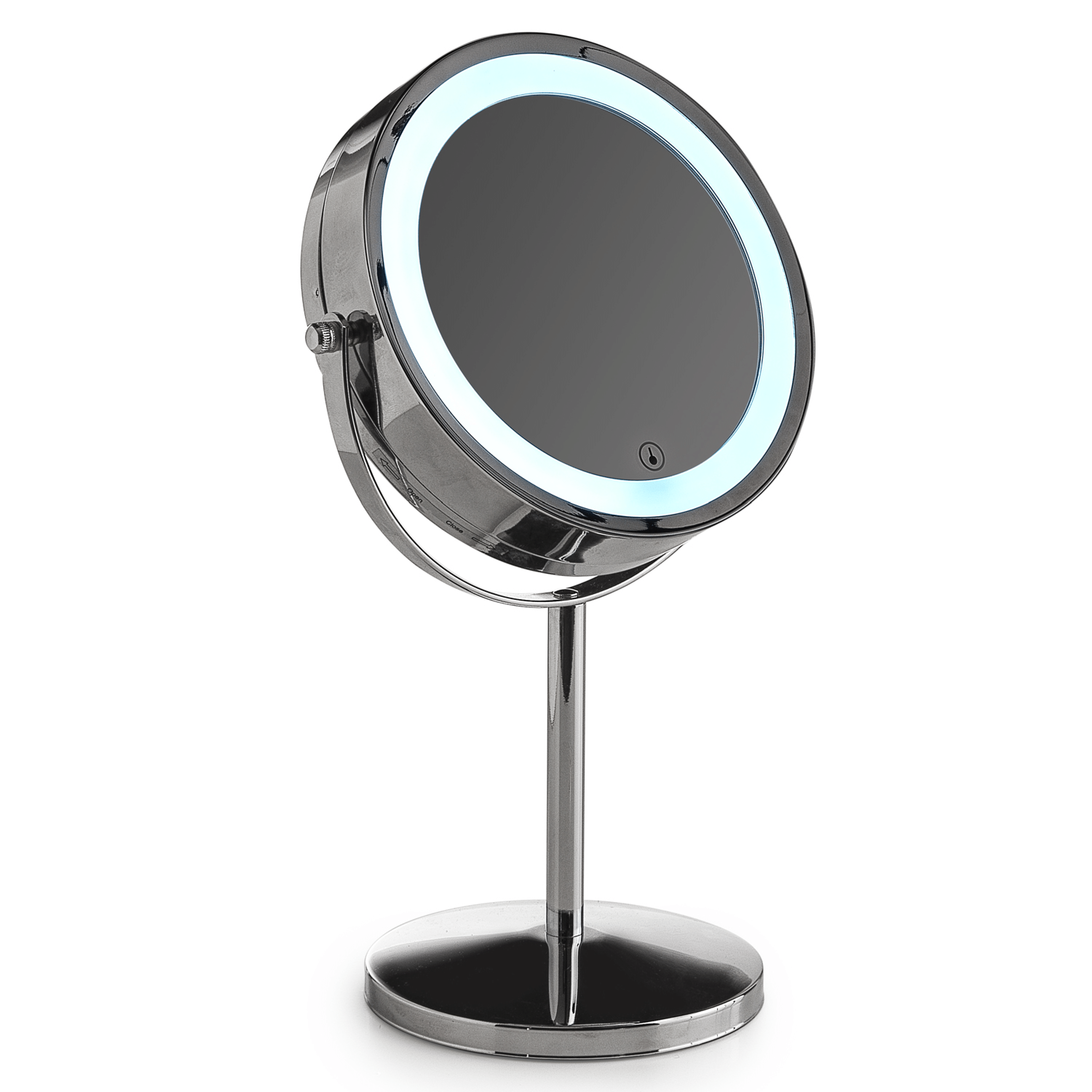 Specchio bifacciale da parete, dotato di un lato normale e di un lato con fattore di ingrandimento 5x, ideale per attività di precisione come trucco, rasatura e cura del viso. La struttura orientabile consente una regolazione semplice e accurata dell’angolazione, garantendo un utilizzo pratico e confortevole.L’illuminazione a LED offre una luce chiara e uniforme, con accensione touch screen e funzione dimmerabile a pressione, permettendo di regolare l’intensità luminosa in base alle esigenze. Il sistema è conforme alla classificazione Class Exempt Group EN 62471.Funziona a 3V, ha una potenza di 2W, una temperatura colore di 6000 K e un’emissione luminosa inferiore a 30 lumen.