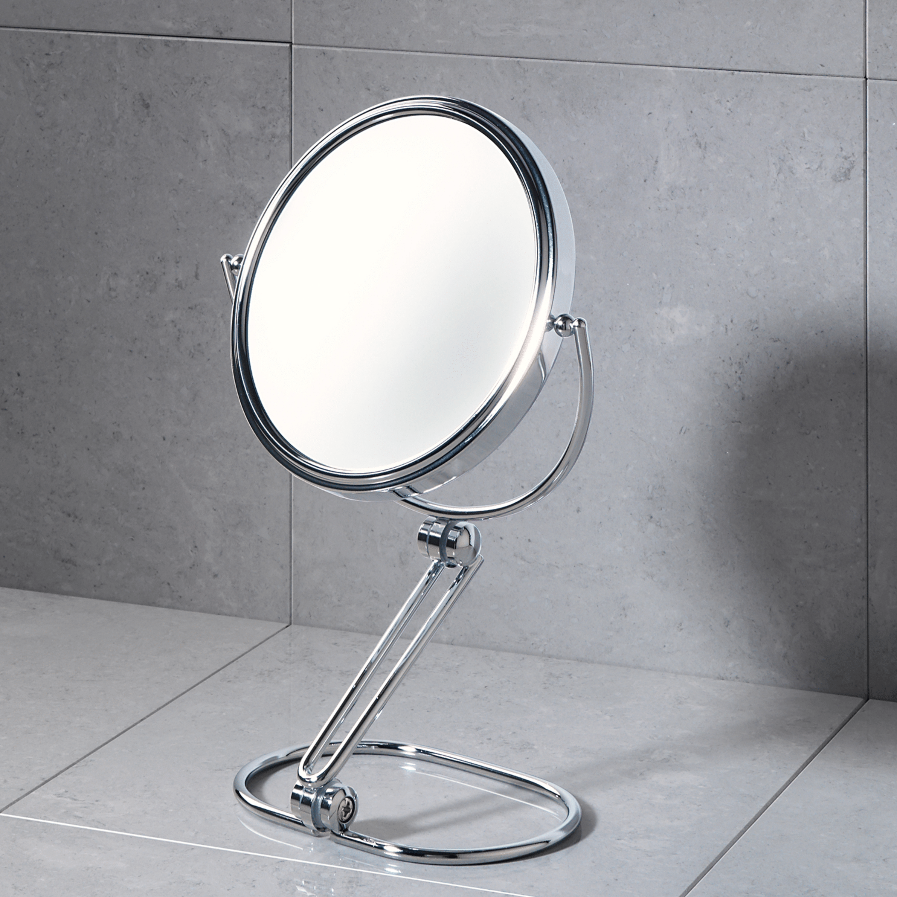 Specchio ingranditore e non, bifacciale, dotato di un lato normale e di un lato con fattore di ingrandimento 5x. La struttura è progettata per garantire stabilità, rotazione fluida e una visione chiara e dettagliata, rendendolo ideale per trucco, rasatura e tutte le attività di precisione della routine quotidiana.